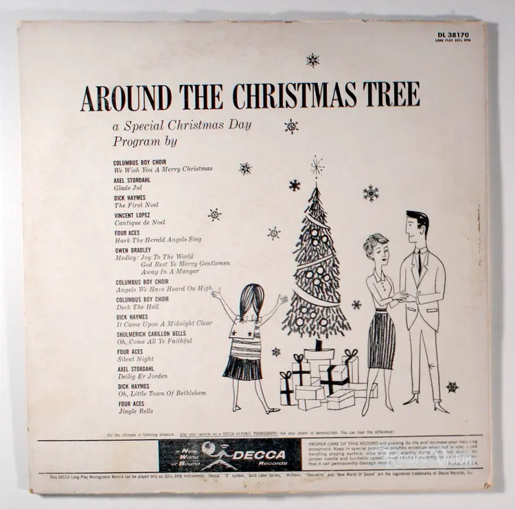 Around the Christmas Tree, by Decca Records features a collection of holiday songs performed by various artists, including the Four Aces, capturing the festive spirit of the era. Released as a vinyl LP, it was designed to evoke holiday nostalgia and is noted for its high-quality sound. The album’s historical significance lies in its representation of Decca’s early efforts to modernize Christmas music, aligning with the emerging teen-oriented pop culture and rock ‘n’ roll trends of the late 1950s. Its release on 33⅓ rpm vinyl, a format Decca was exploring for singles at the time, adds to its historical context within the evolving music industry.