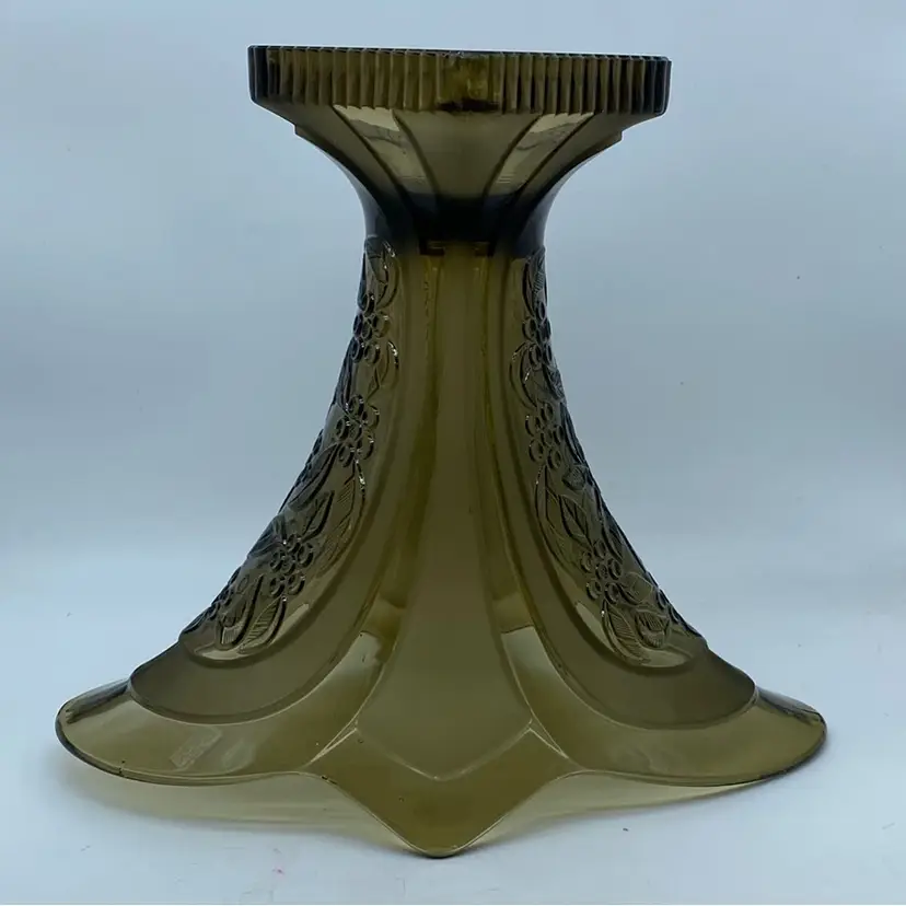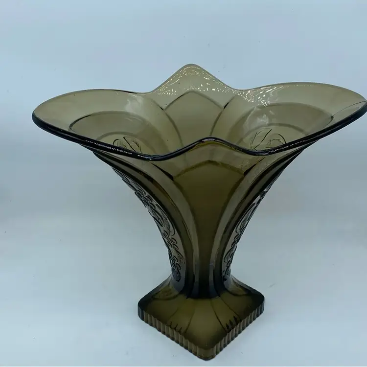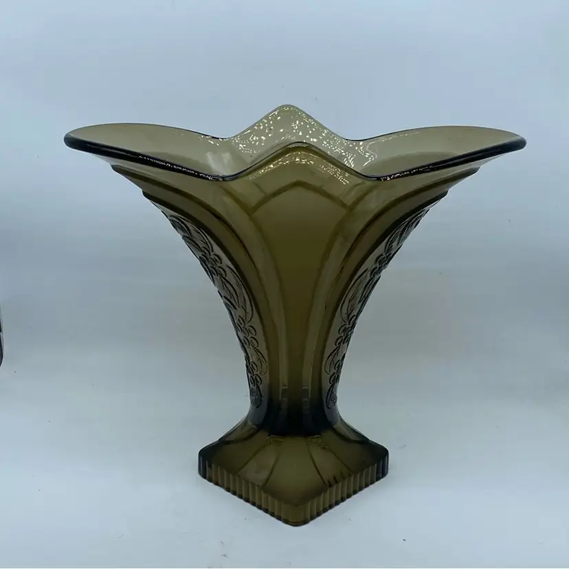 These vases were produced in various colors, with some being rarer than others. The smoke-colored or light brown tint, as seen in the image, is a desirable color among collectors. Walther glass is appreciated for its craftsmanship and the aesthetic appeal of its Art Deco designs. The "Greta" vase exemplifies the elegance and sophistication of glassware from this era.