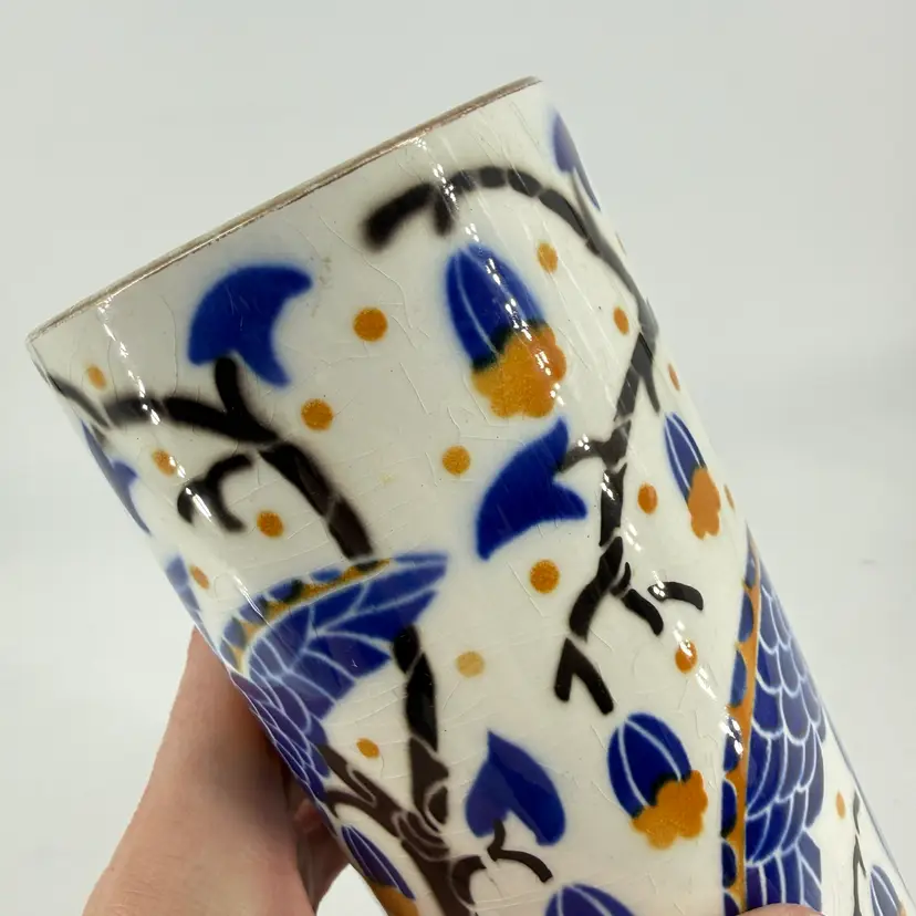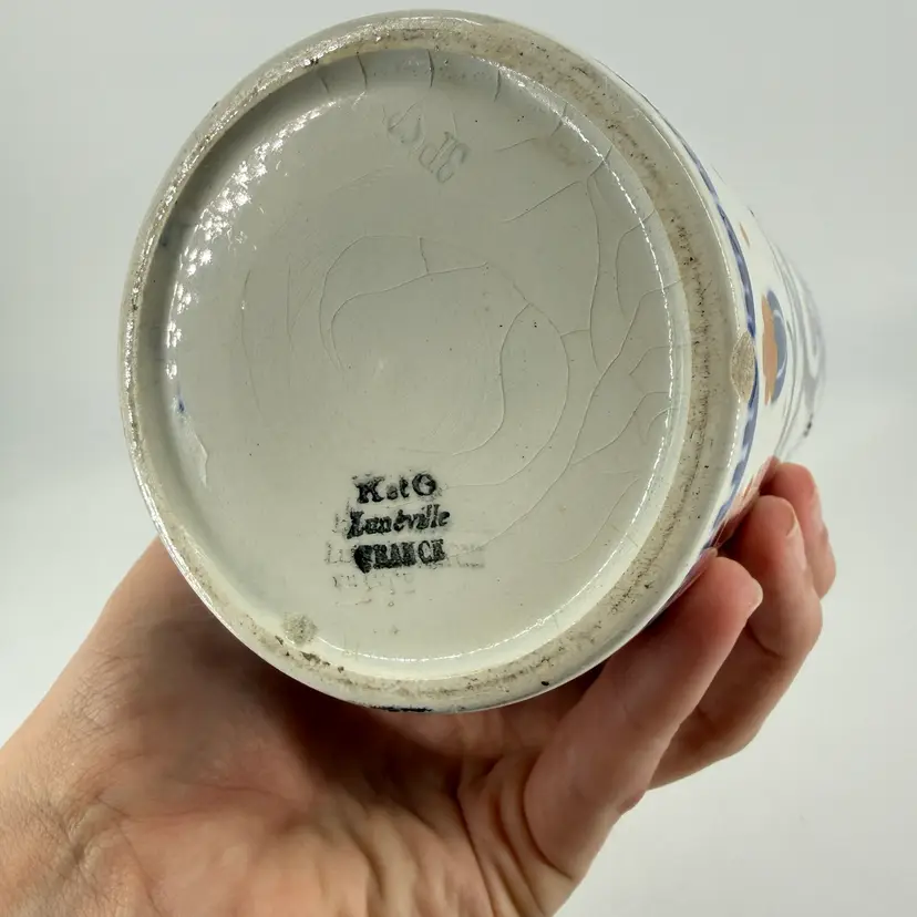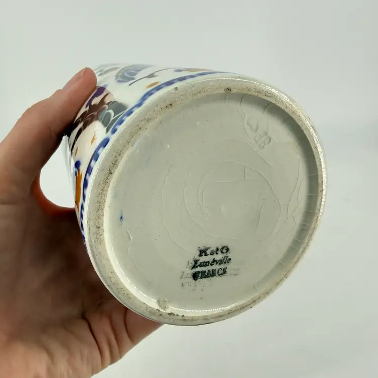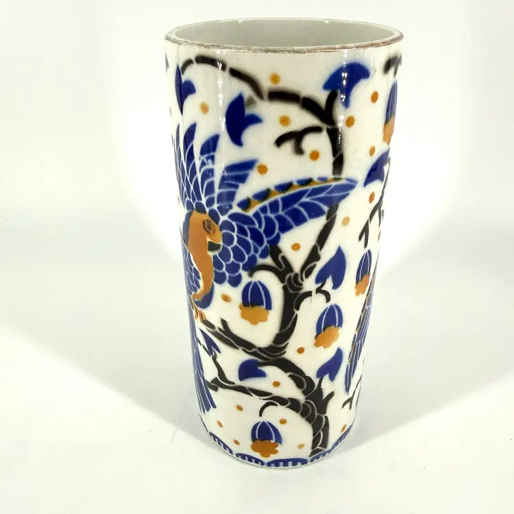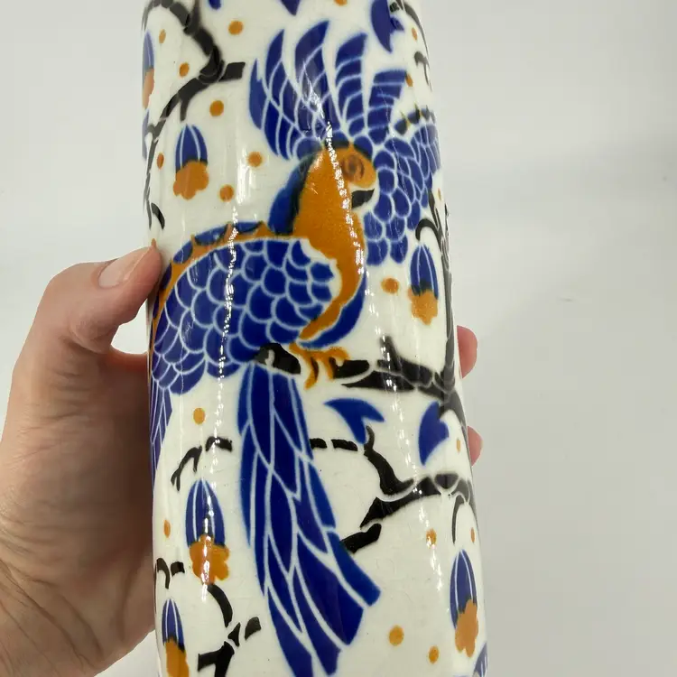This art deco vase was made in France. It is attributed to Keller et Guérin. It features bird designs. There are no chips or cracks. There is some wear along the rim and some crazing. It measures approximately 7.5” tall and 3.5” wide.