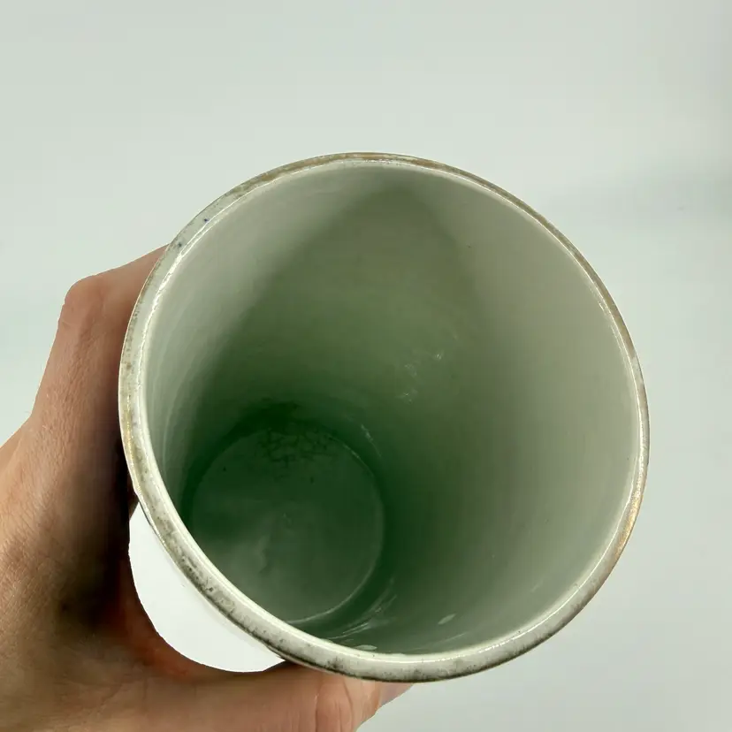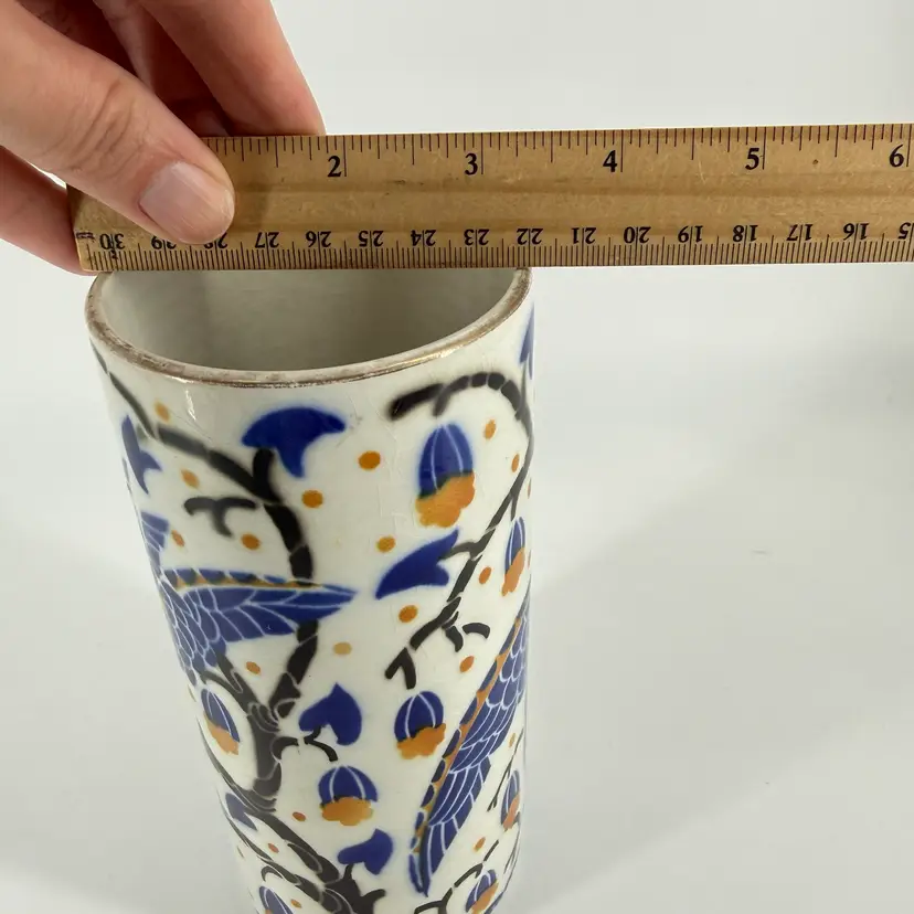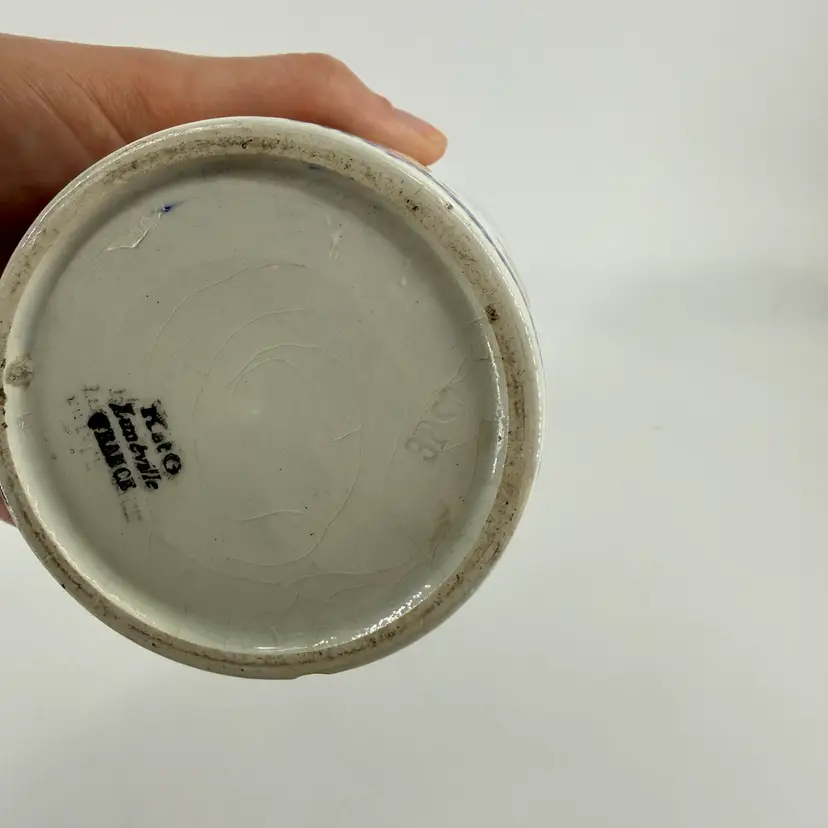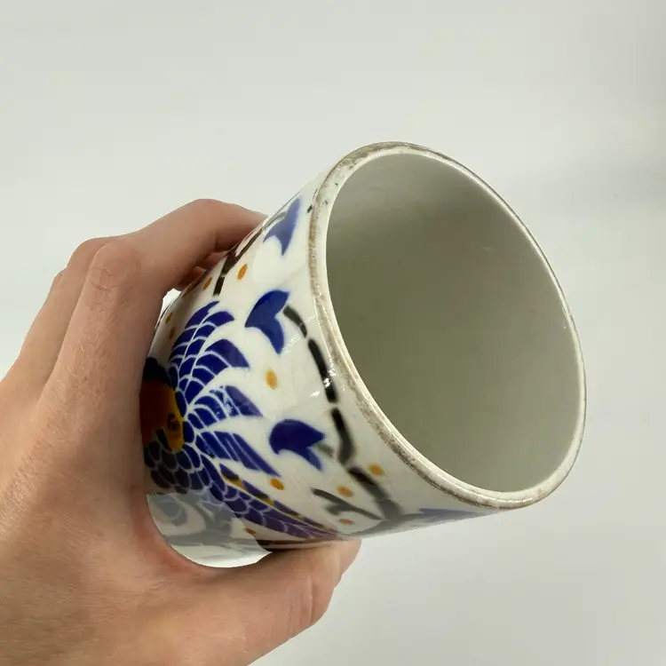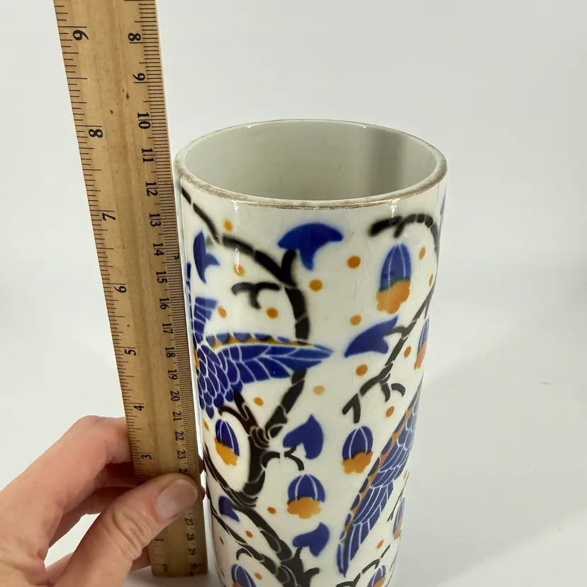 This art deco vase was made in France. It is attributed to Keller et Guérin. It features bird designs. There are no chips or cracks. There is some wear along the rim and some crazing. It measures approximately 7.5” tall and 3.5” wide.