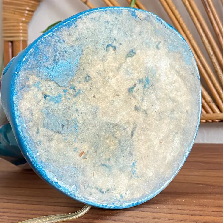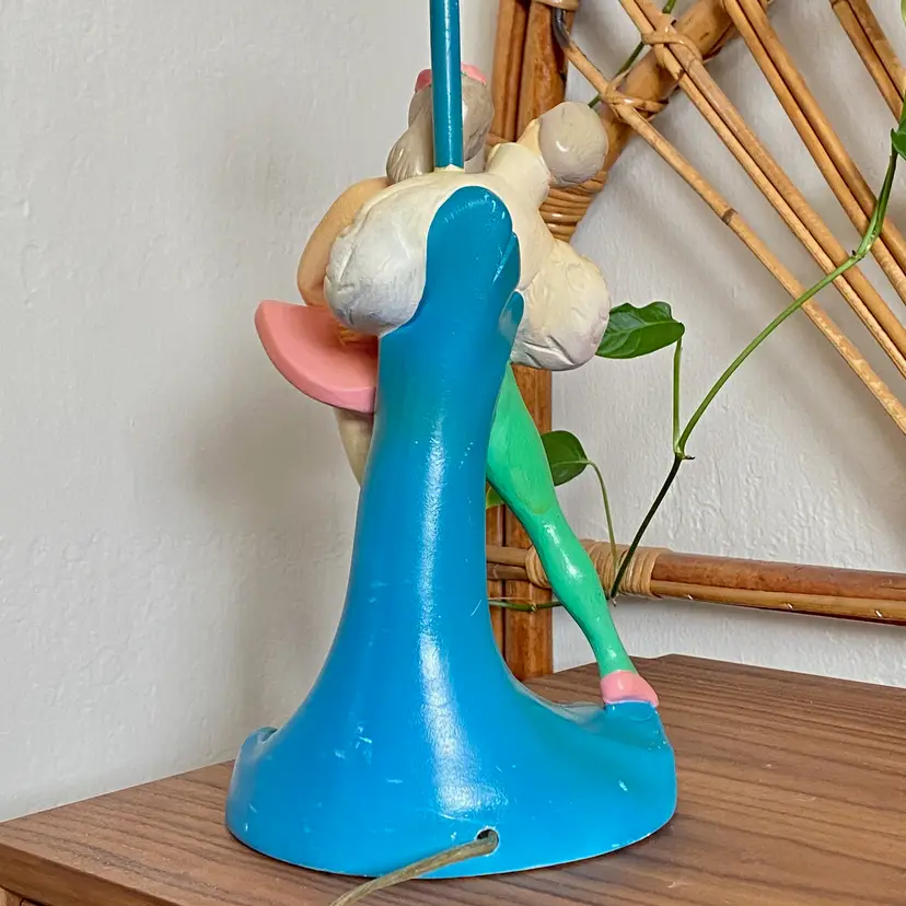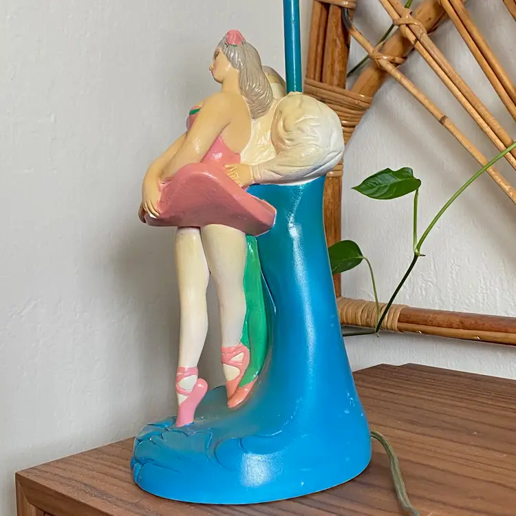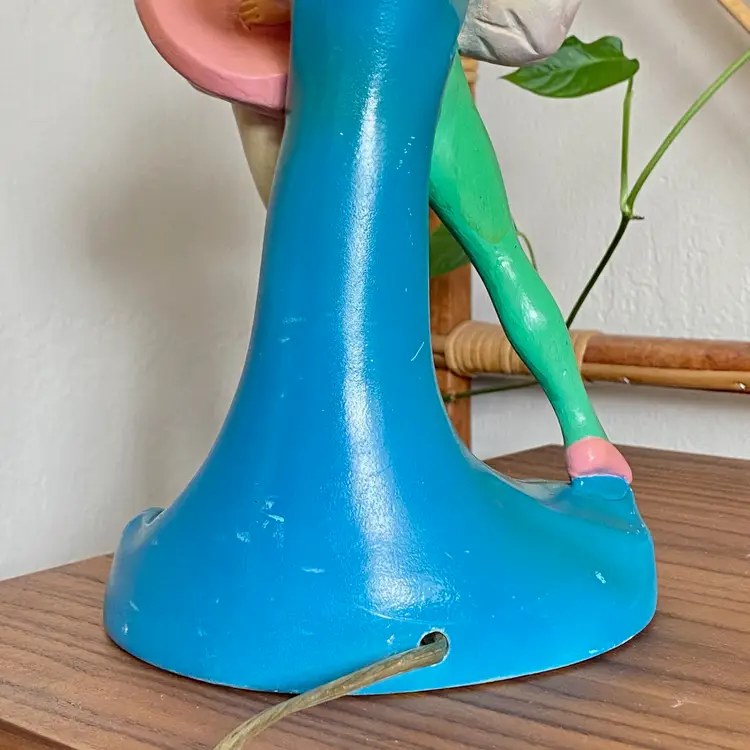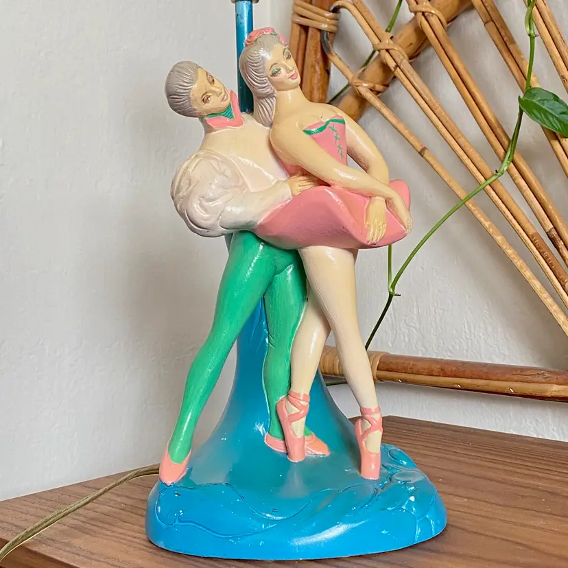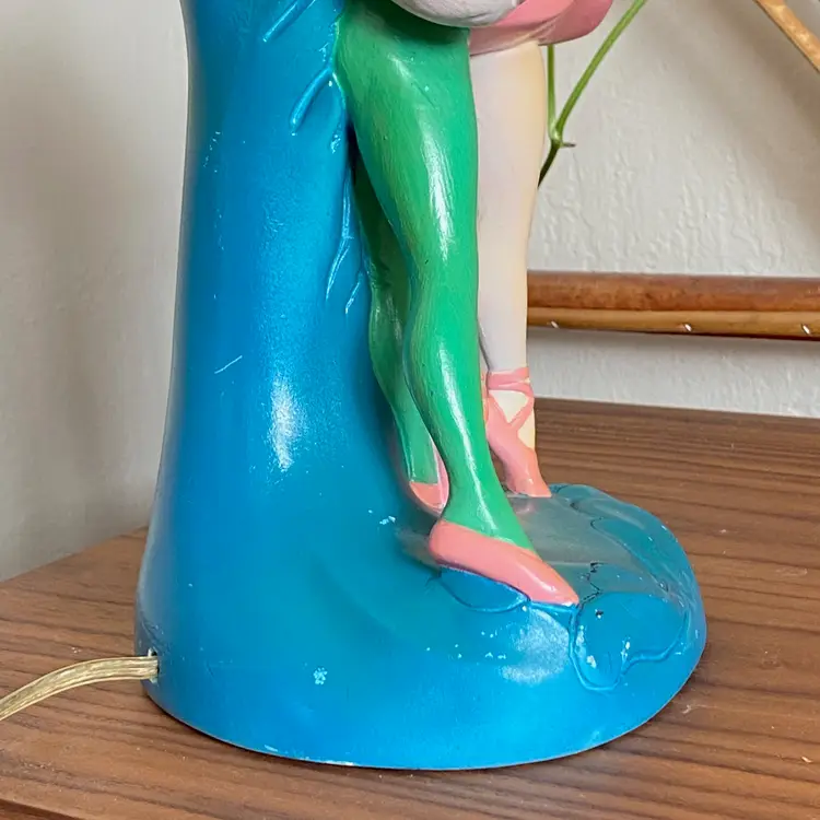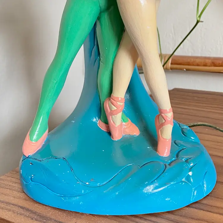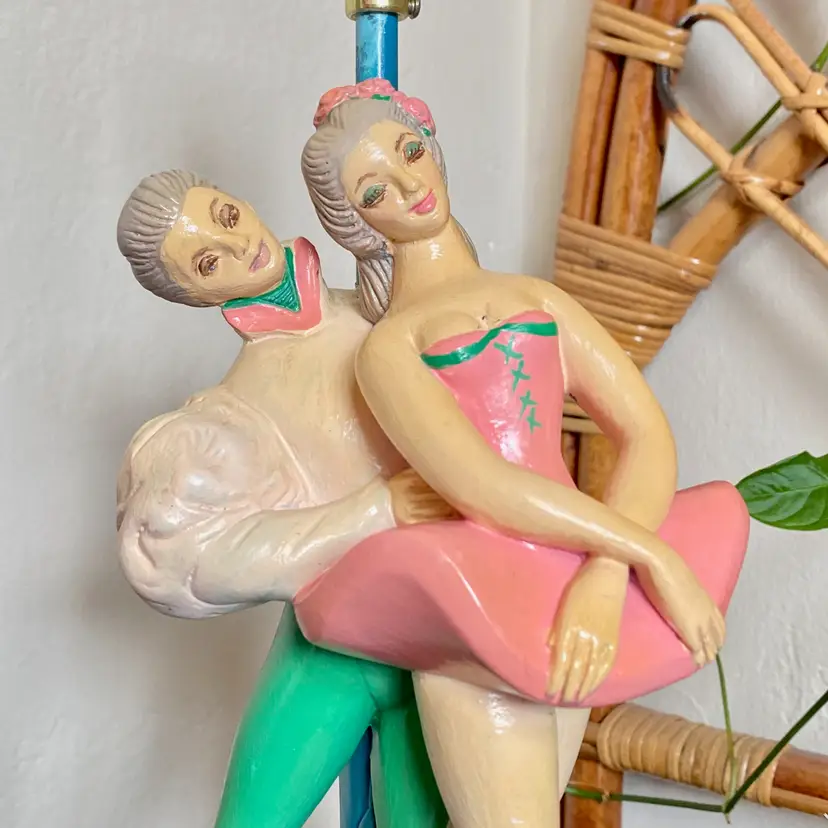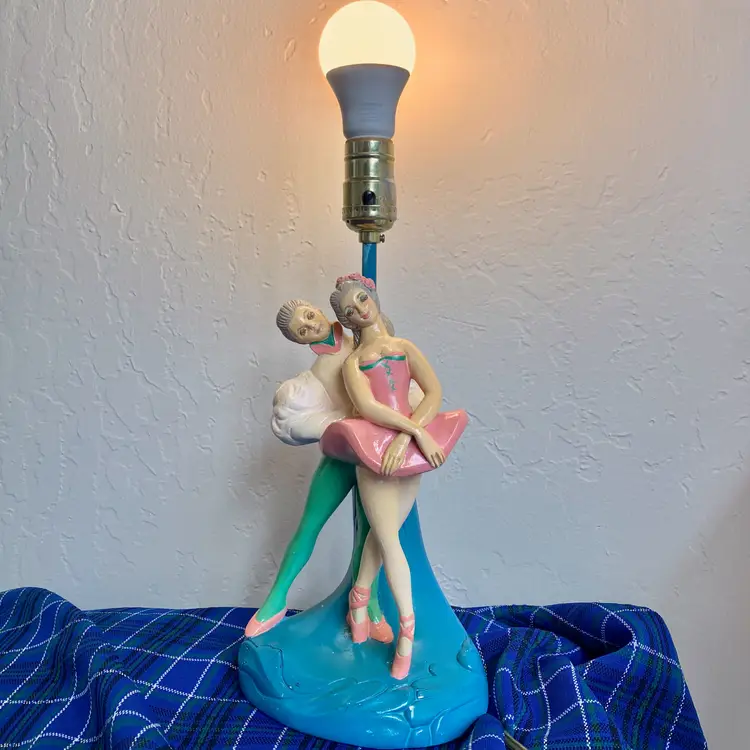 Early 20th century hand painted chalkware ballet dancers tabletop lamp. There are a few tiny nicks in the paint, some small marks, and light discoloration to the paint. The felt on the bottom is worn. The plug seems to have been replaced, it's the kind you just snap onto a wire end which makes me think the original was cut off rather than rewiring. It has a push button switch at the base of the bulb holder which holds a standard sized bulb. The holder does not have harp fitters. The base measures about 10.5" to the top of their heads, total height to the top of the bulb holder is about 13.5". Width about 6". It weighs 3lb 7oz.