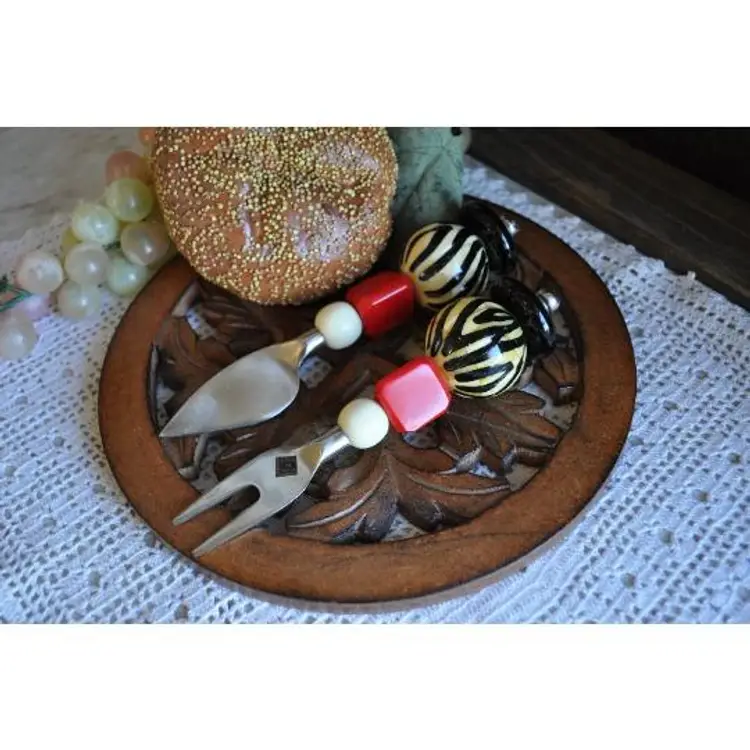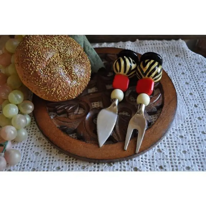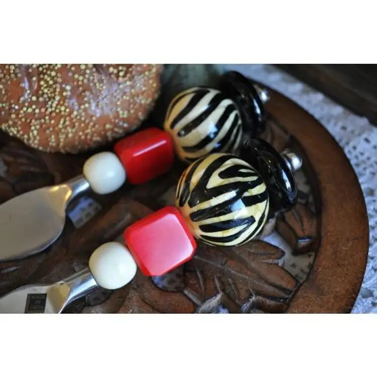 Geometric shapes art deco cheese servers Measure 6" long Stainless blades Colorful geometic shapes on handles Very fun addition to your charcuterie tray