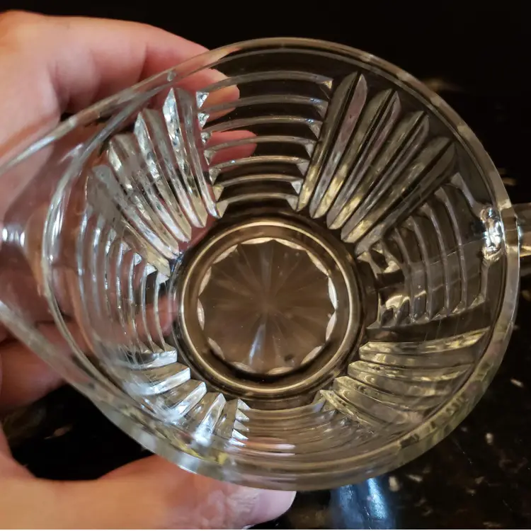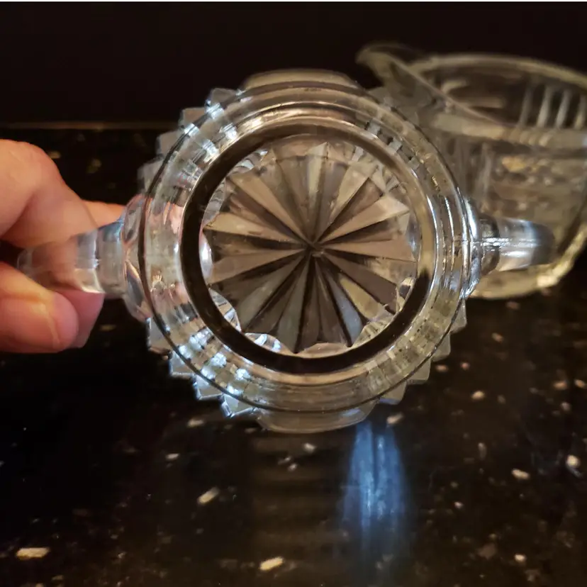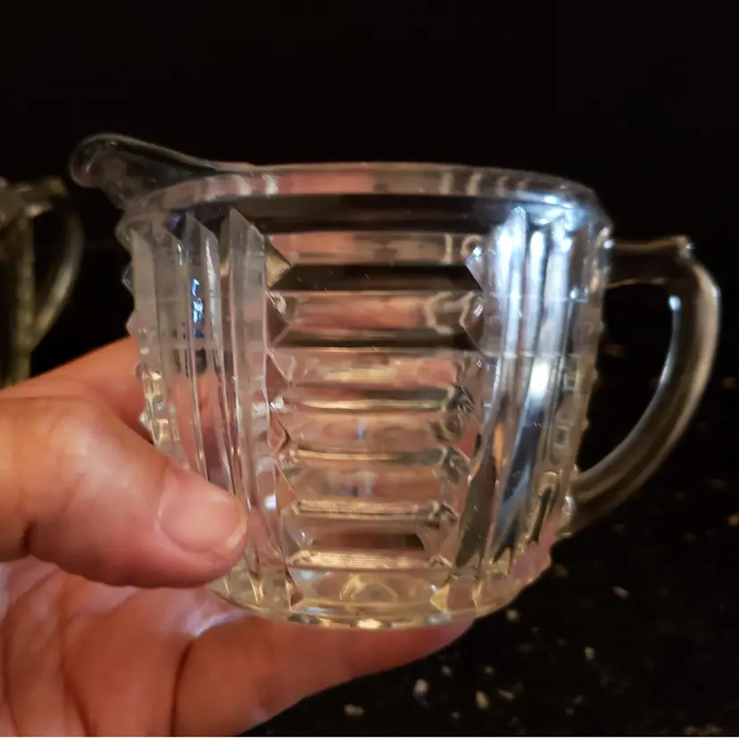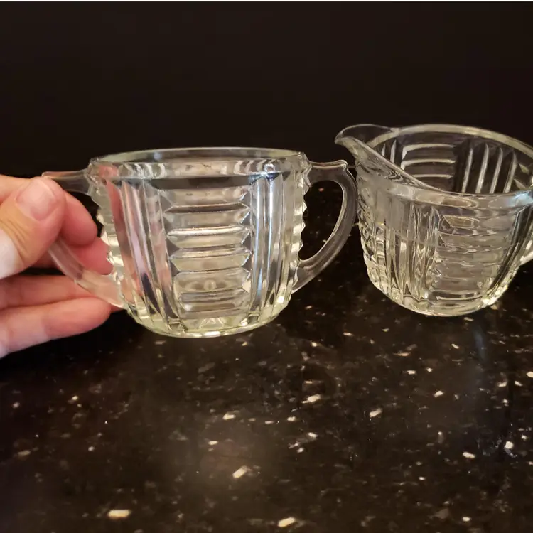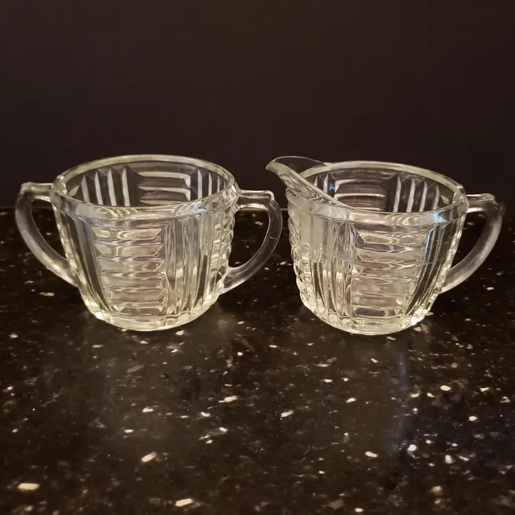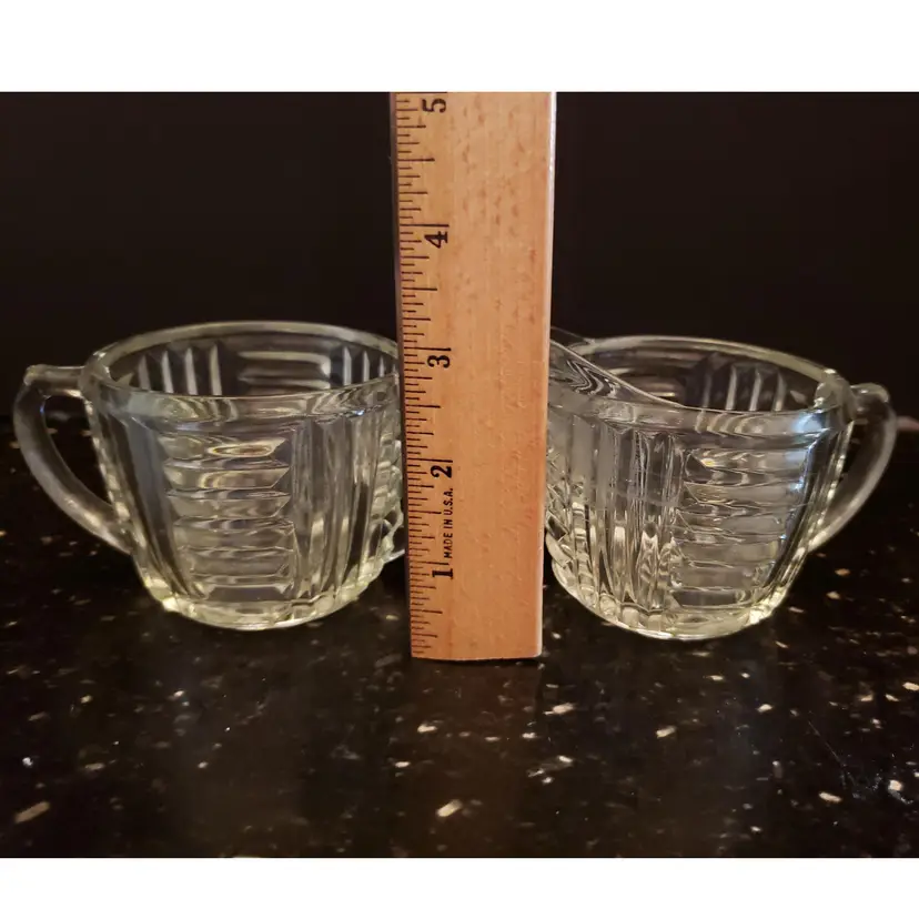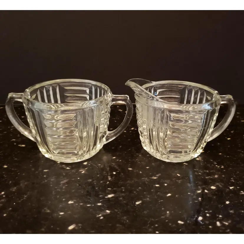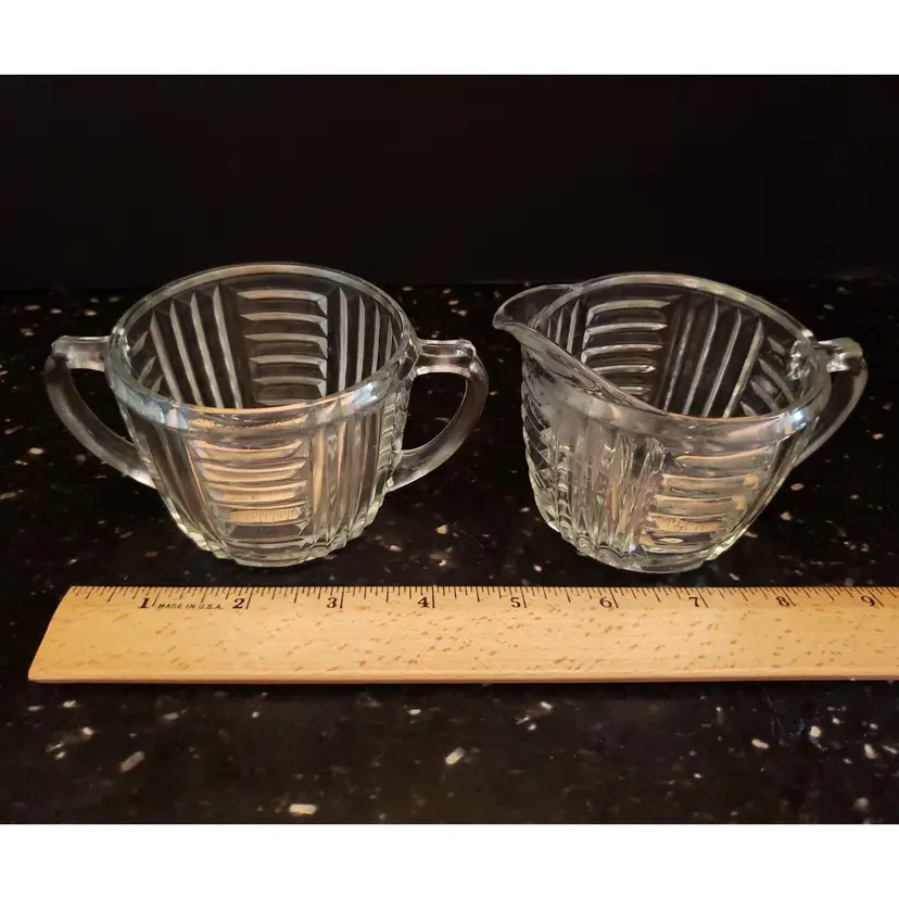 Vintage Art Deco Creamer and Sugar Bowl with Handles Clear Glass with cut and ribbed line panels Vintage art deco style glass creamer and sugar bowl with double handles. The design is clear cut glass with ribbed horizontal and vertical panels. Sugar bowl is approx. 5" (handle to handle) wide x 2.75" tall. Creamer is approx. 4.25" wide from handle to spout x 3" tall. Great vintage condition with no cracks or chips.