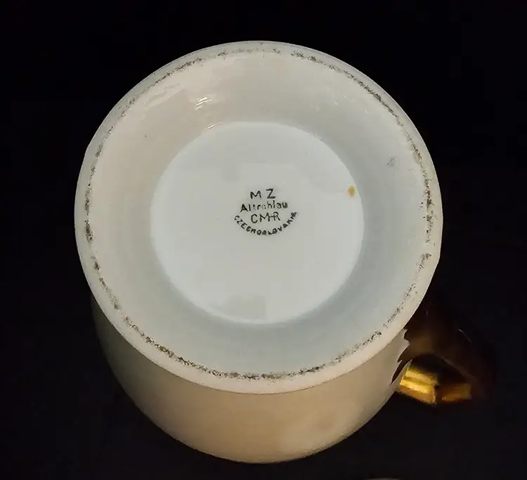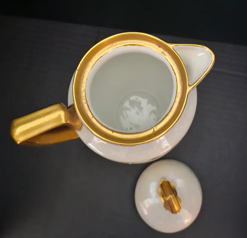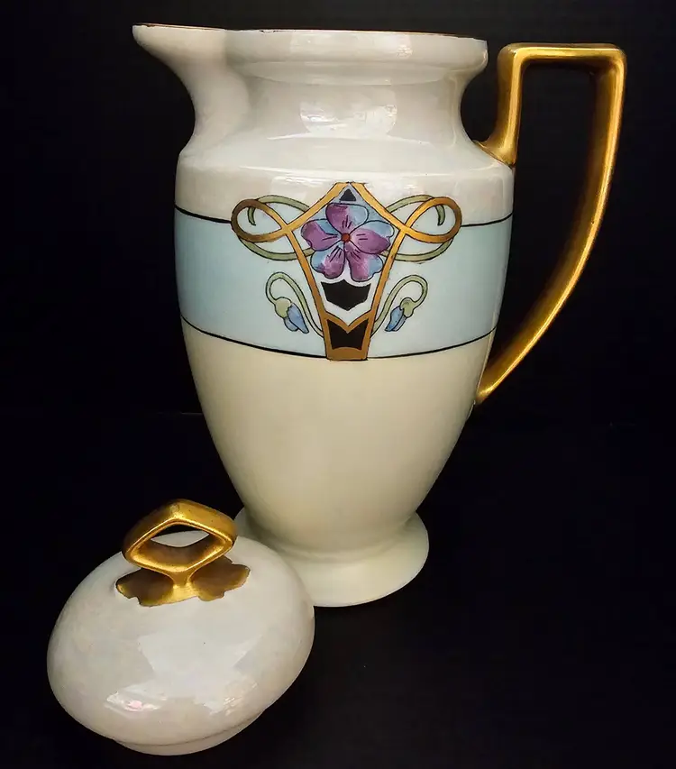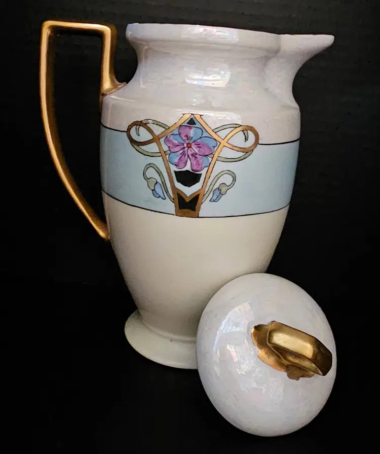 Vintage Hand painted, MZ Altrohlau CMR Czechoslovakia. 22 kt gold on lid, handle and in painting. Perfect condition. 10" high, 10" spout to handle