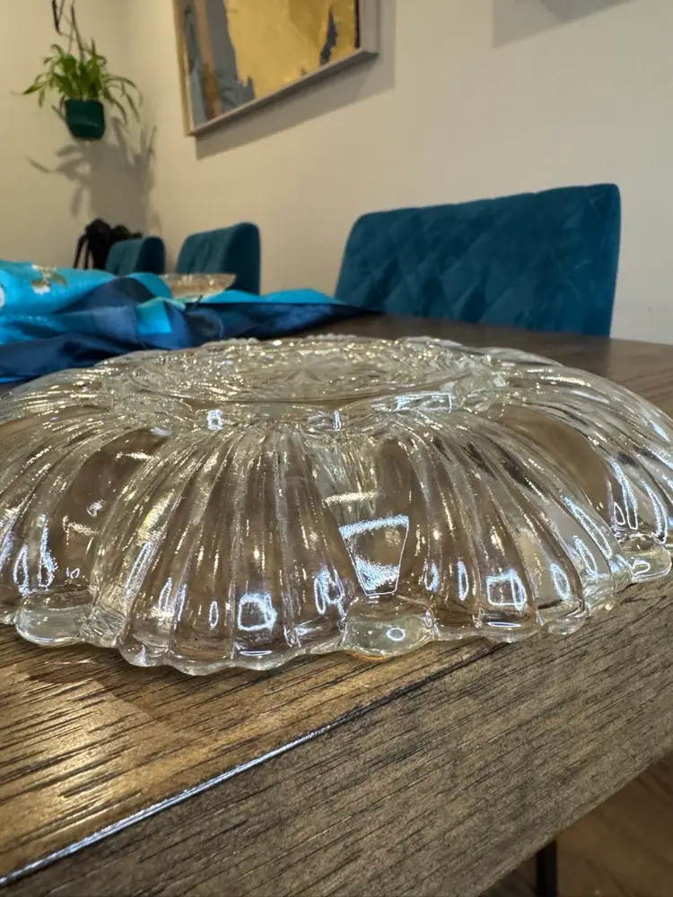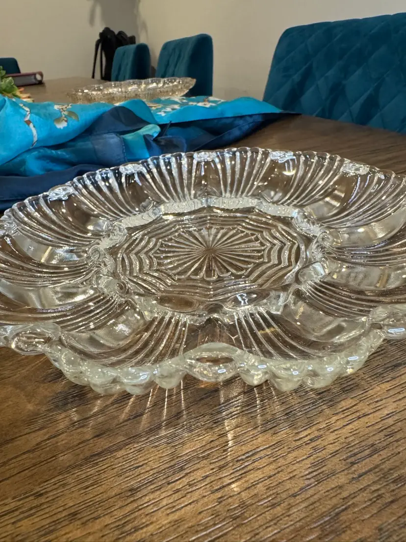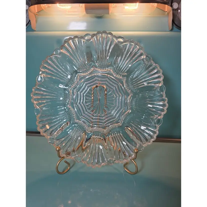 Made by Anchor Hocking 1950s pressed glass design Pattern: 896 Clear Holds 12 deviled eggs Decorative scalloped edge Wave and fan motif Versatile center well for dips or fruit Perfect for parties, holidays & brunches Elegant crystal-clear glass Mid-century serveware Excellent display piece