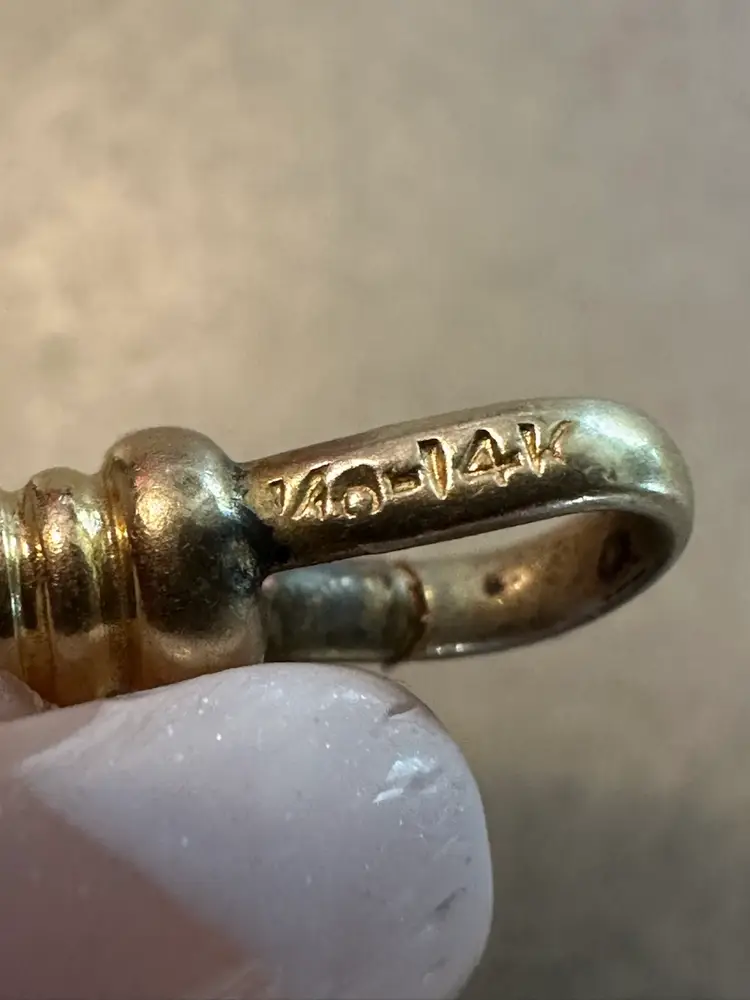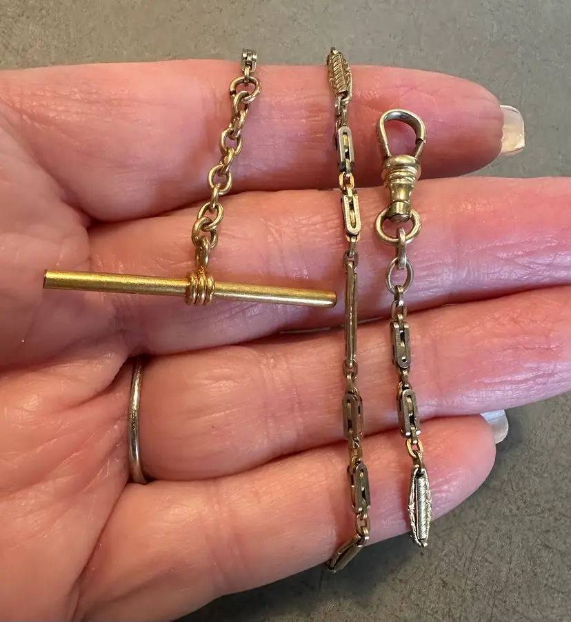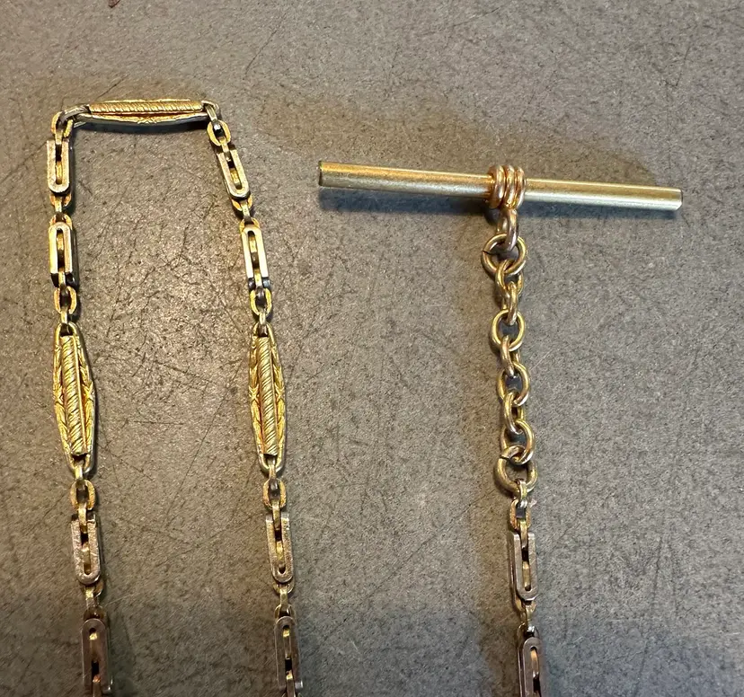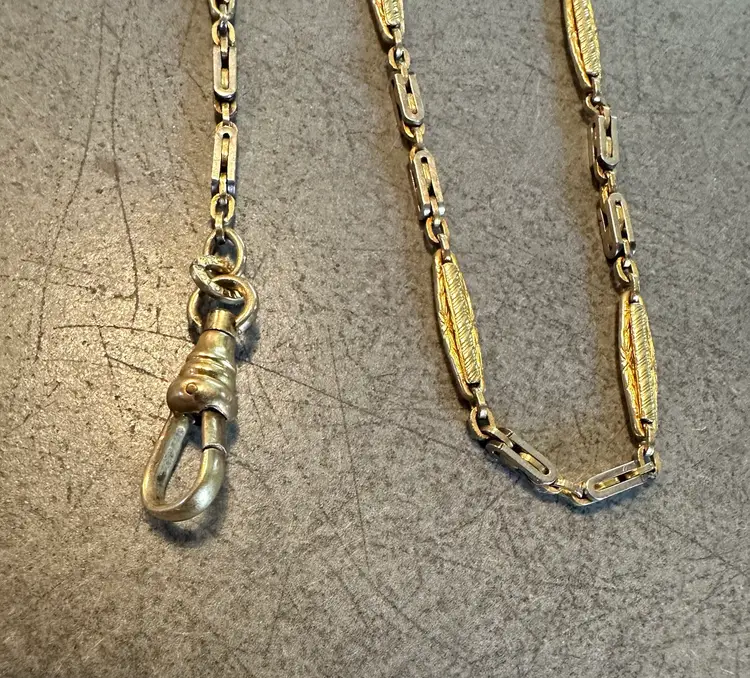 Art deco watch chain by Forstner. It is 14k gold filled. It is 14”. Excellent condition.