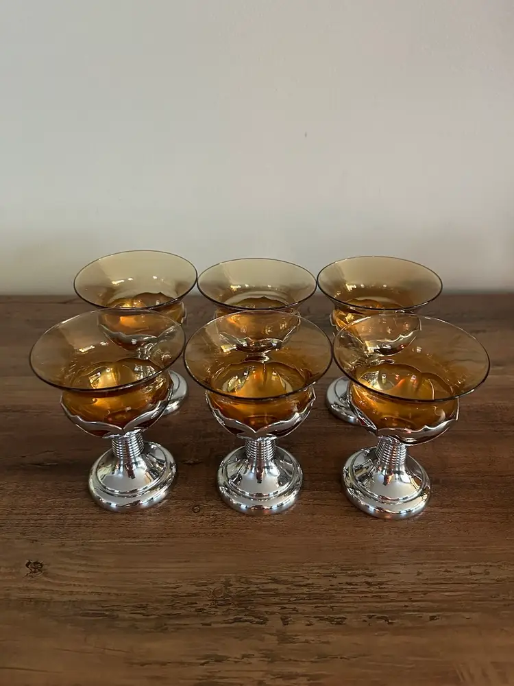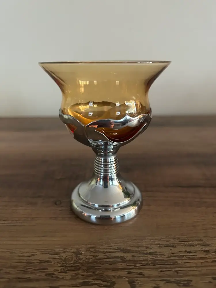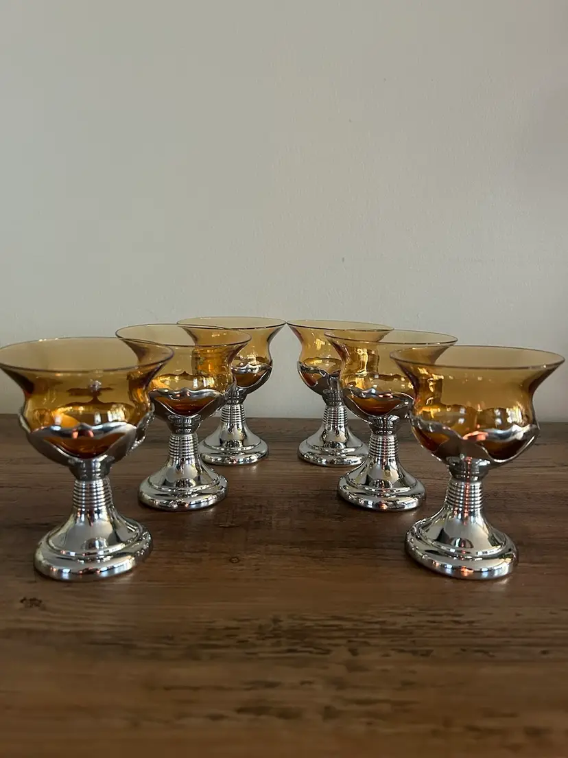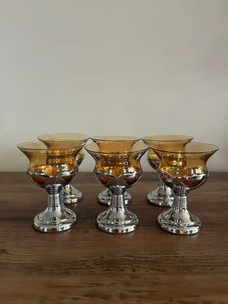 Amber cordials set in chrome pedestal cups with distinctive art deco look by Krome Kraft.