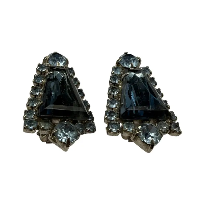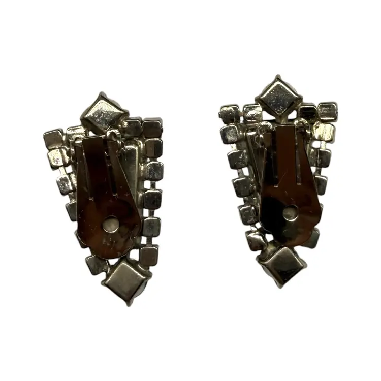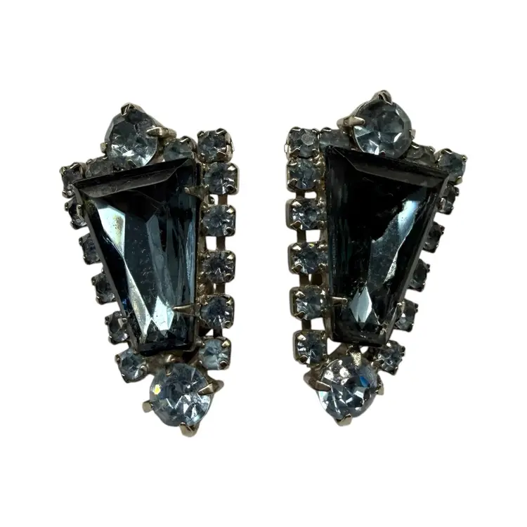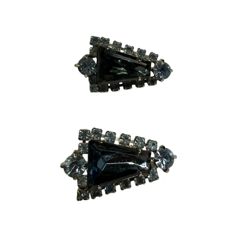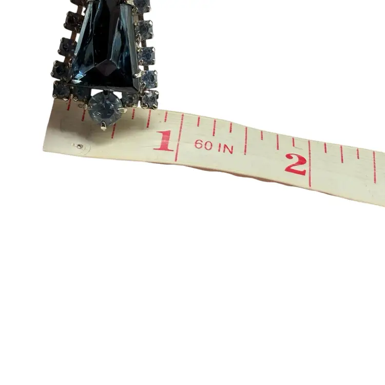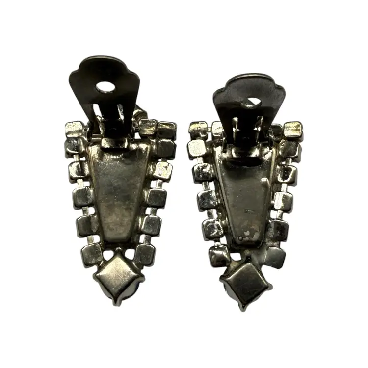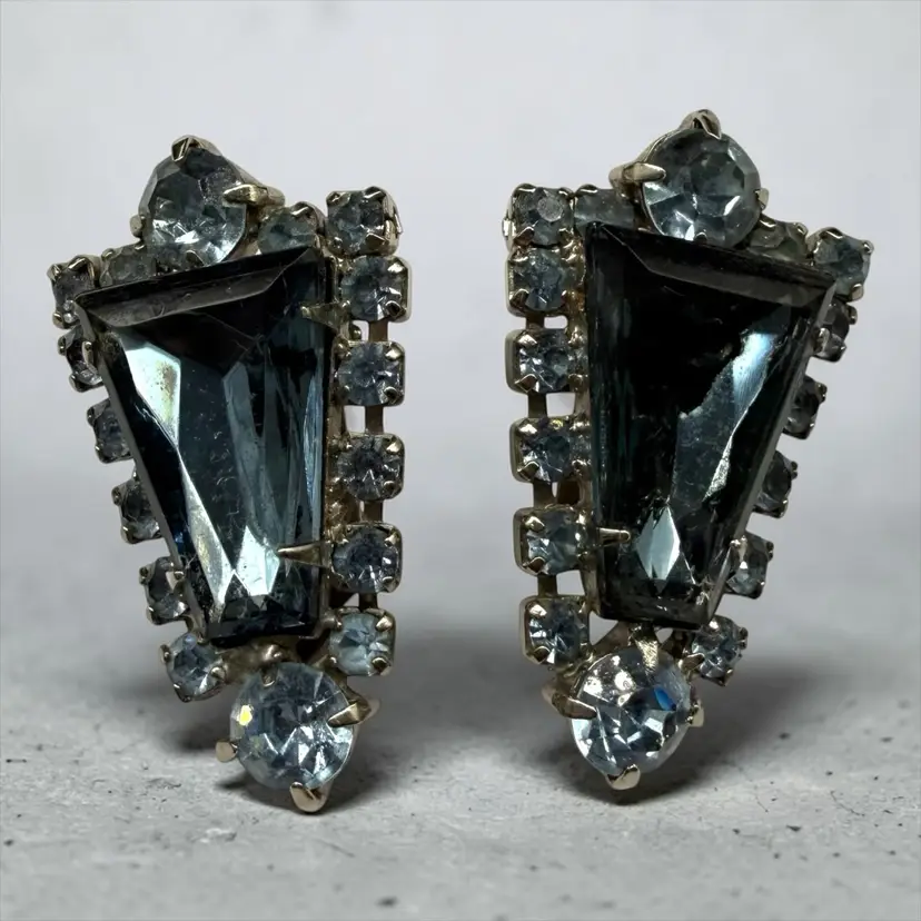 These vintage Art Deco glass keystone clip-on earrings feature a beautiful blue color with a geometric design. The earrings are made of glass and metal, with a prong setting and a statement style. They are 1.5 inches in length and feature a trapezoid main stone shape surrounded by chaton glass stones. Perfect for a bride or someone looking to add a touch of glamour to their outfit, these earrings exude beauty and elegance with an Art Deco flair. The clip-on closure makes them easy to wear, adding a pop of color to any ensemble.