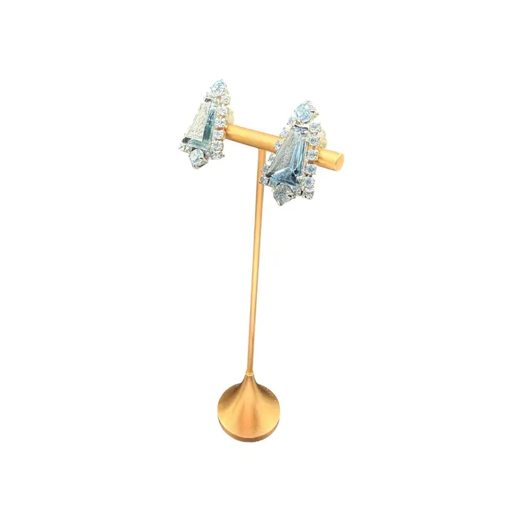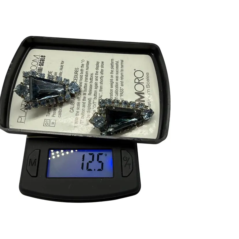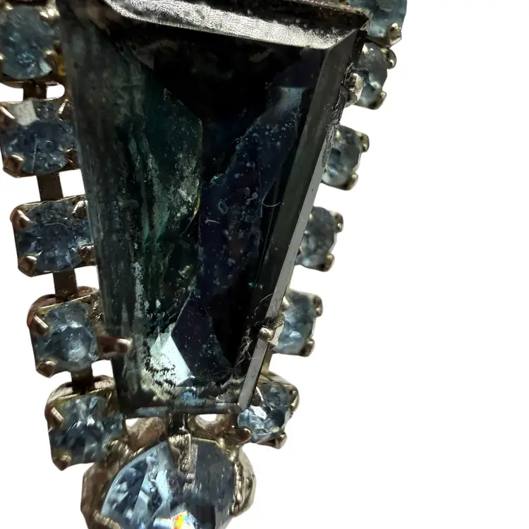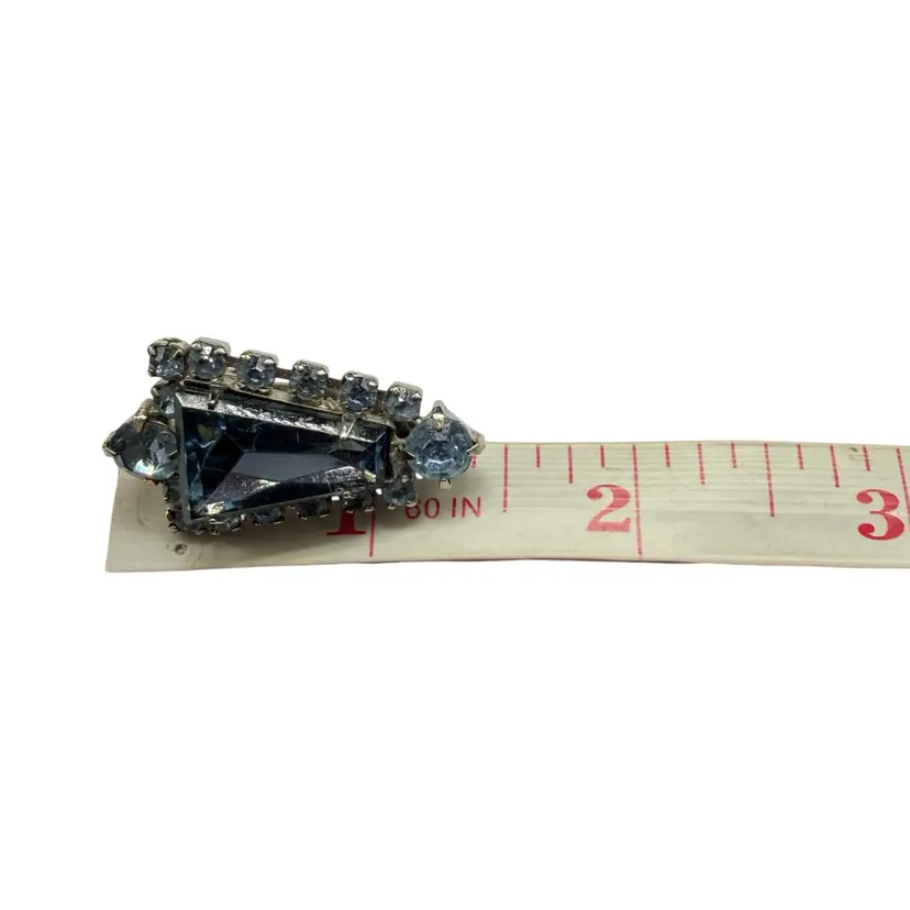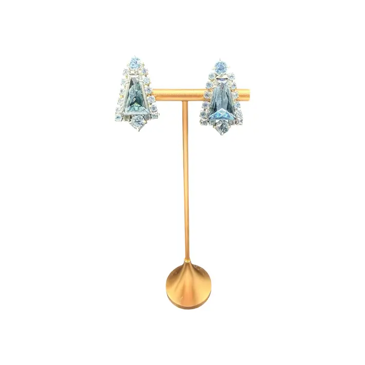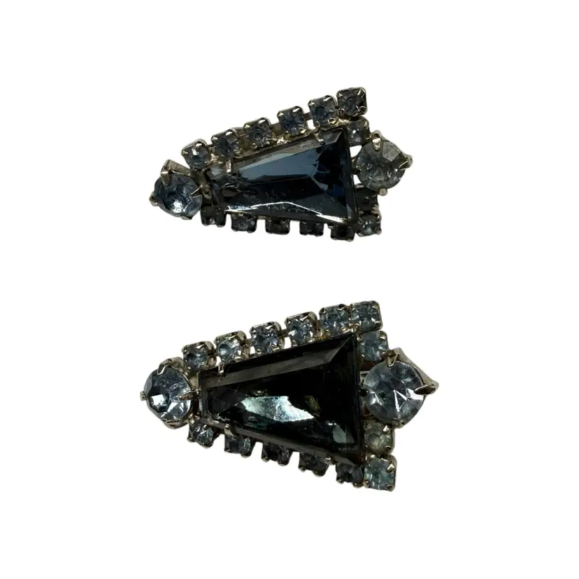 These vintage Art Deco glass keystone clip-on earrings feature a beautiful blue color with a geometric design. The earrings are made of glass and metal, with a prong setting and a statement style. They are 1.5 inches in length and feature a trapezoid main stone shape surrounded by chaton glass stones. Perfect for a bride or someone looking to add a touch of glamour to their outfit, these earrings exude beauty and elegance with an Art Deco flair. The clip-on closure makes them easy to wear, adding a pop of color to any ensemble.