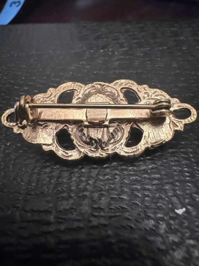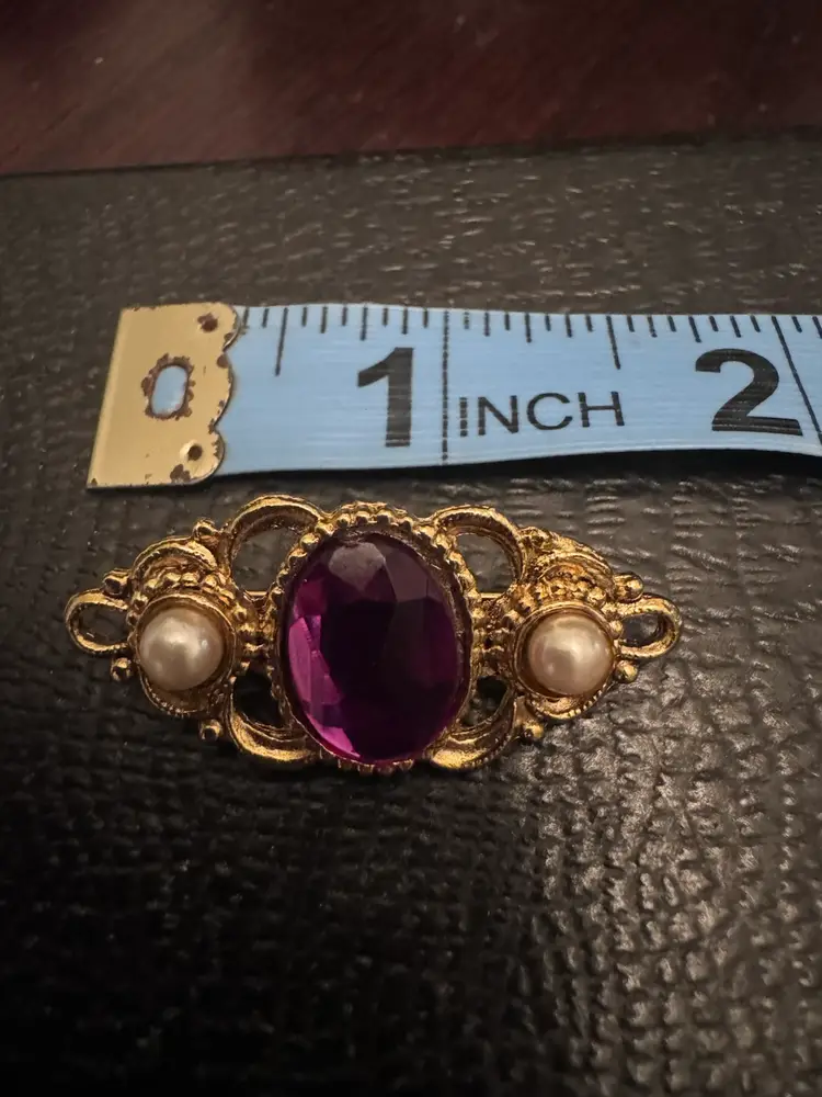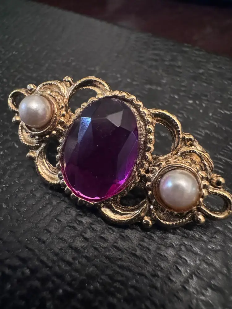 This vintage Art Deco style brooch is a stunning accessory that captures the elegance of a bygone era. Set in gold-tone, it features a captivating purple faux stone surrounded by delicate faux pearls, creating an intricate design that exudes sophistication. Perfect for adding a touch of glamour to any outfit, this brooch is ideal for special occasions like weddings, cocktail parties, or elegant dinners. Despite being pre-owned, it remains in perfect condition, ready to enhance your ensemble with its timeless charm.