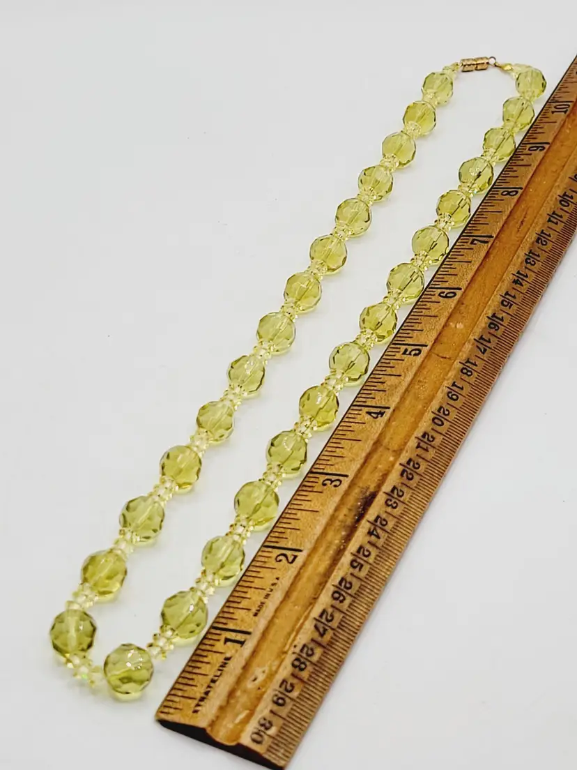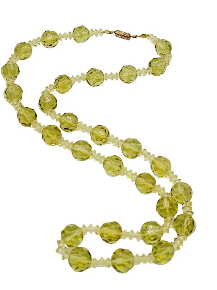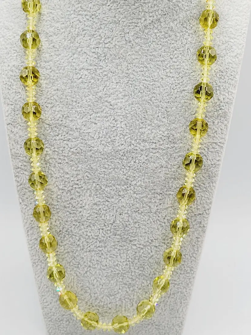 Beautifully detailed Art Deco necklace featuring, alternating diamond and round shaped faceted crystal beads. Jonquil yellow has s green hue to it. Secured with Barrel Clasp.