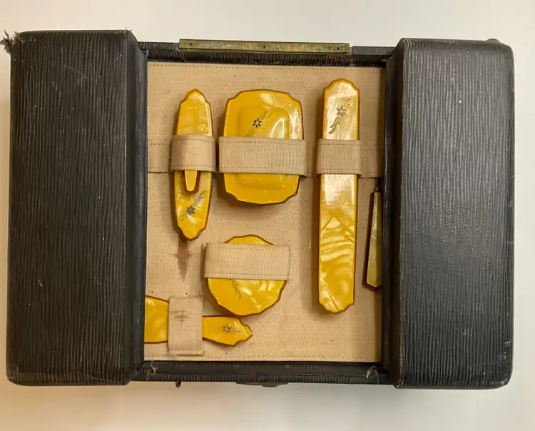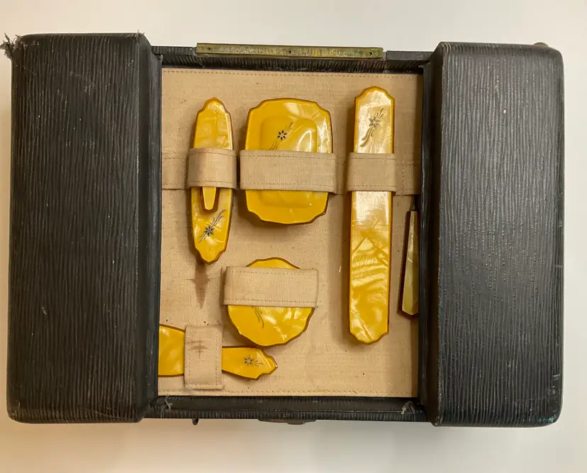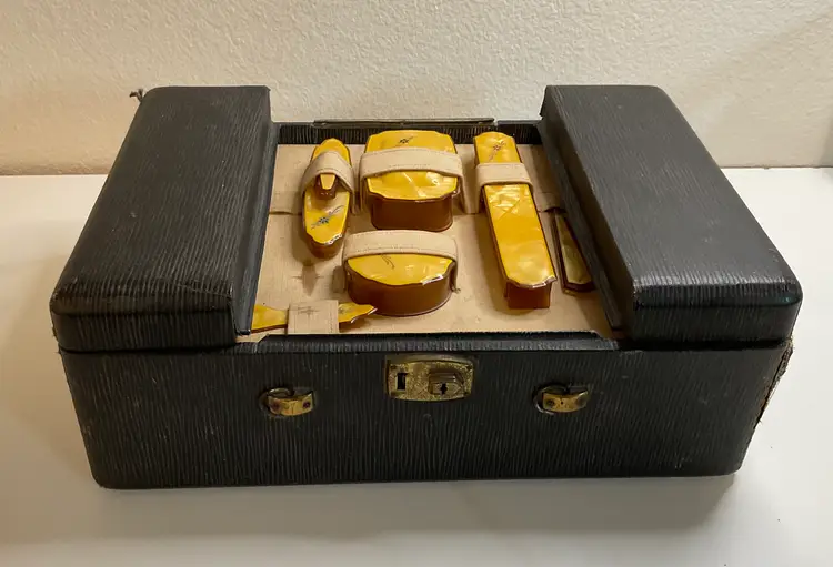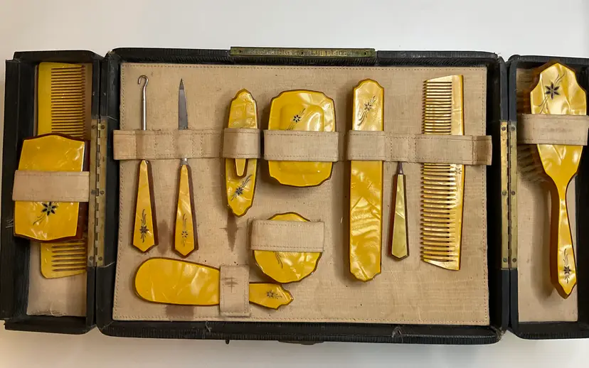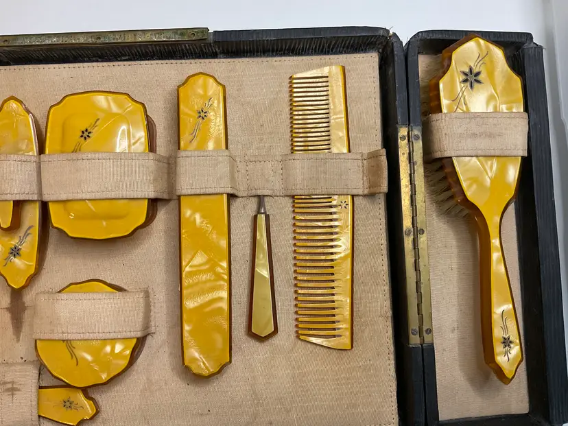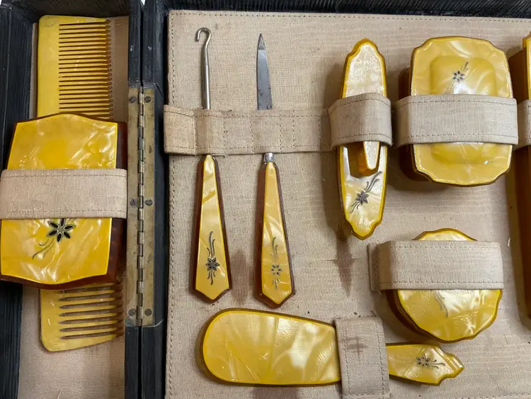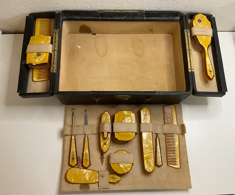 Art Deco Pearlized Celluloid travel set in 14” x 4” case. Includes hair brush, 2 combs, nail cleaner, toothbrush holder, soap box, powder box, nail buffer, shoe horn, nail file, shoe button tool, and clothes brush. READ description
