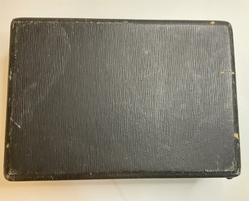 Box is missing the lid. Box shows wear over the last 100 years. The shelf lifts out of box and there is space underneath for personal items. There is staining on fabric.
