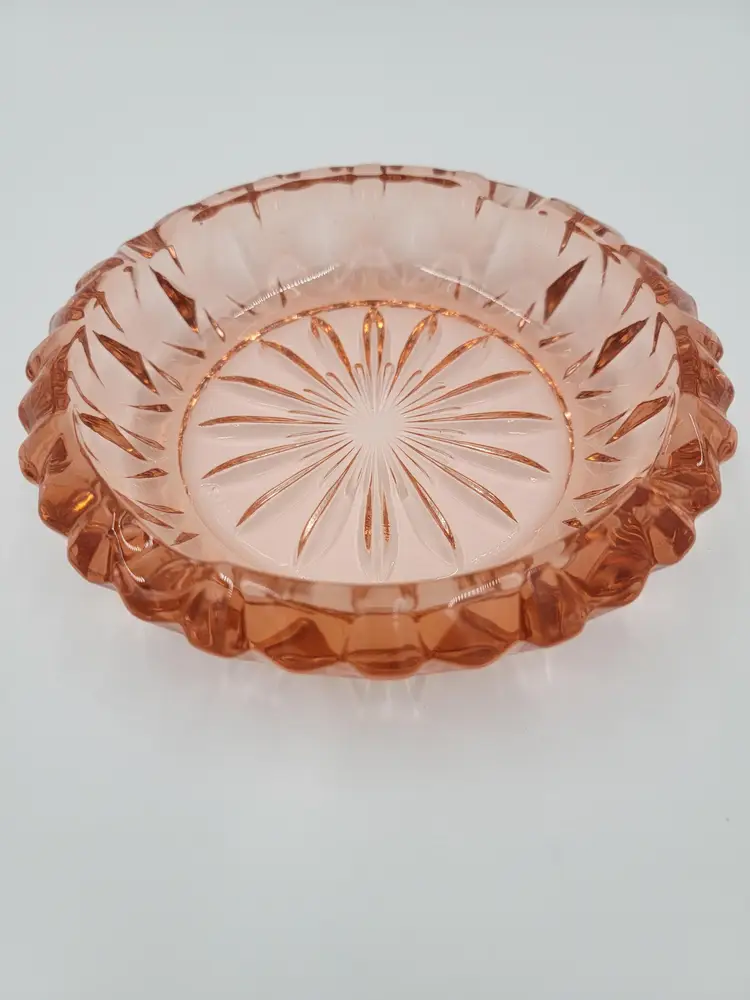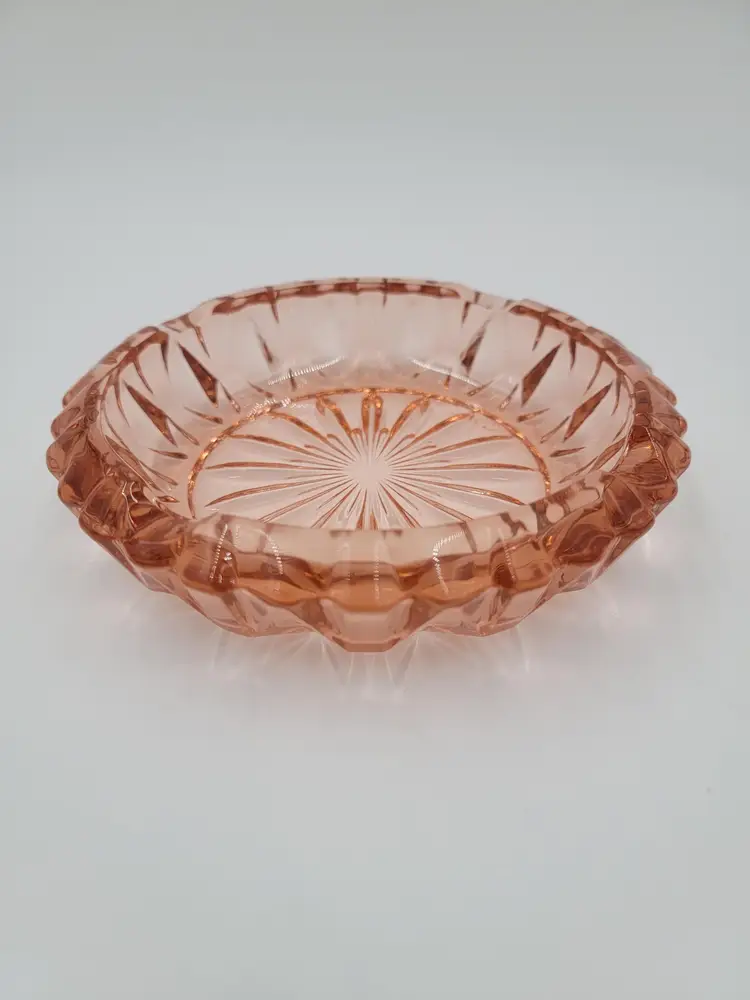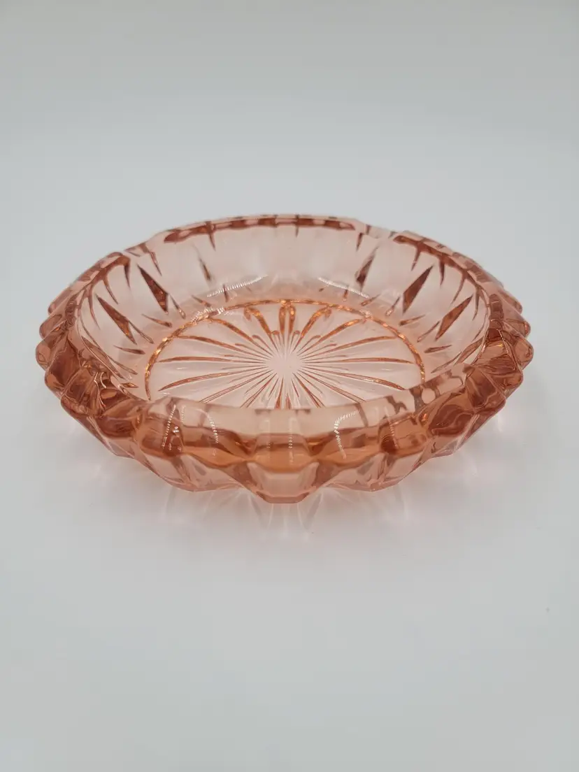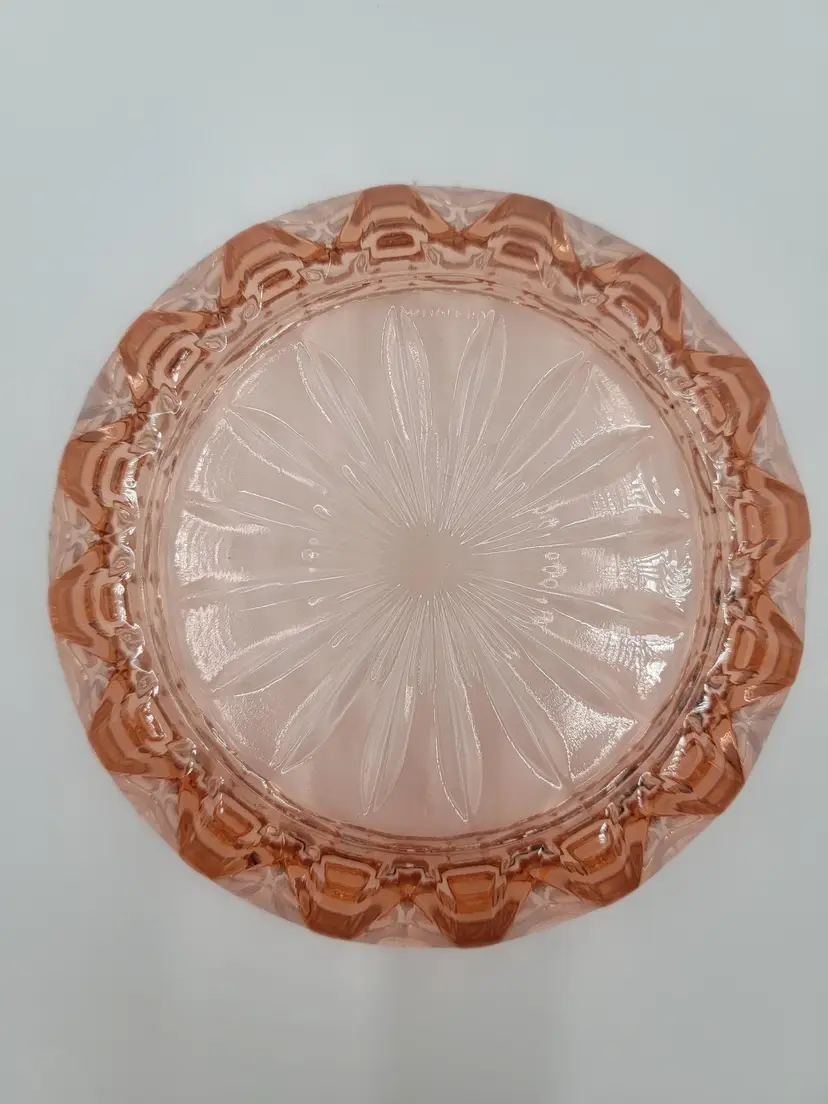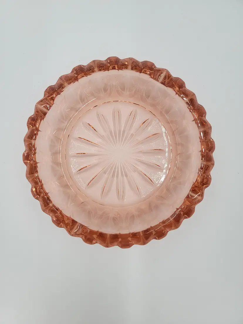 Step back in time with this exquisite pink depression glass dish, featuring a classic Art Deco design. Its radiant patterns catch the light beautifully, making it a stunning piece for collectors .5”R no chips cracks or brakes