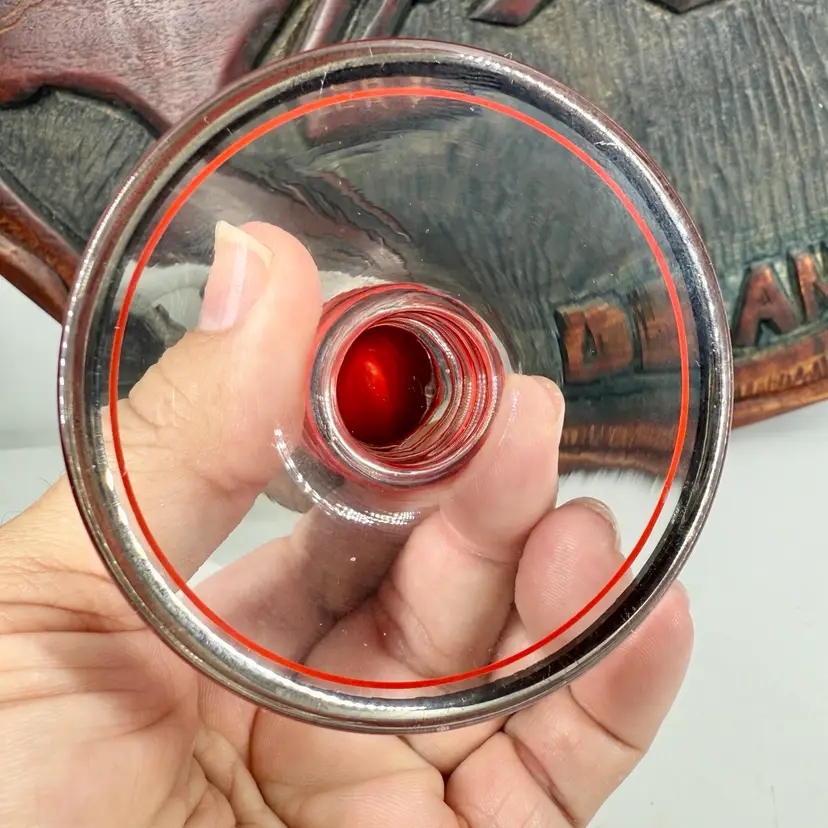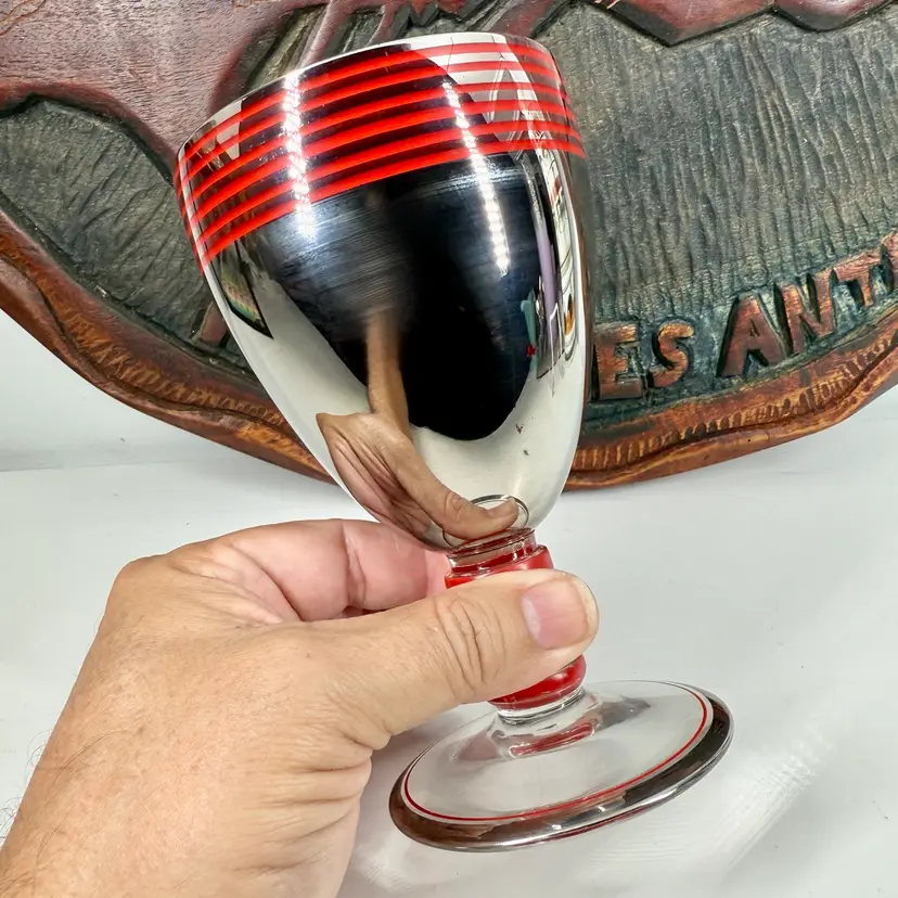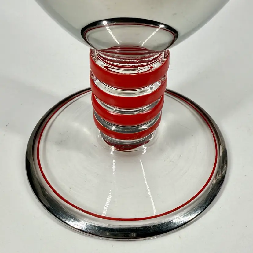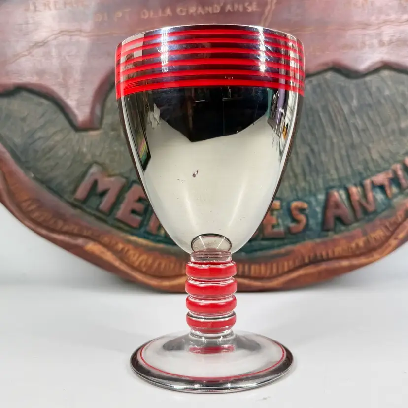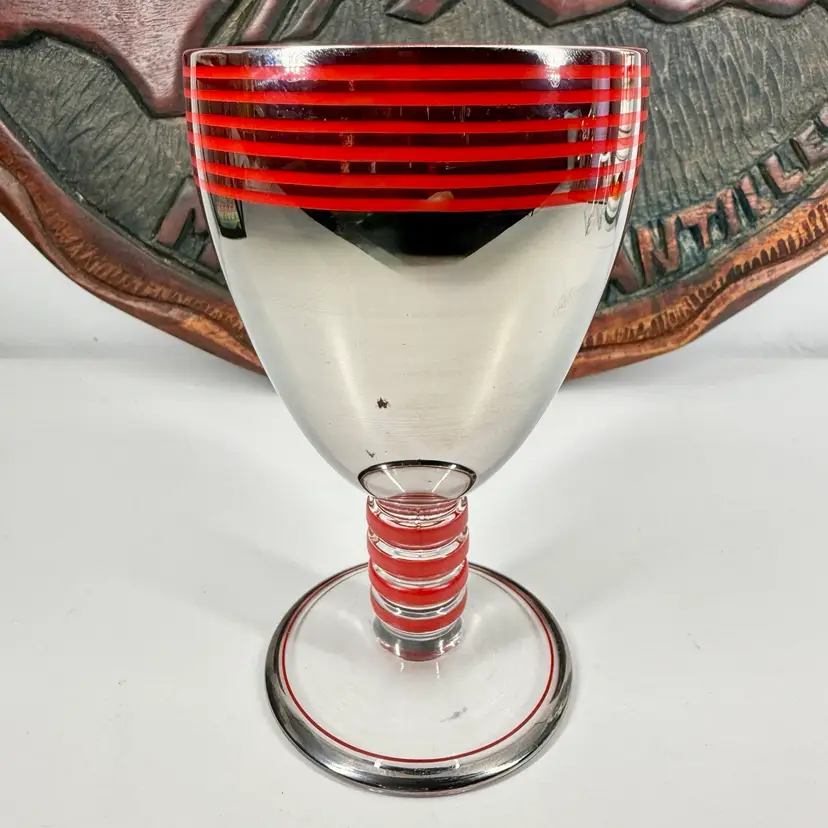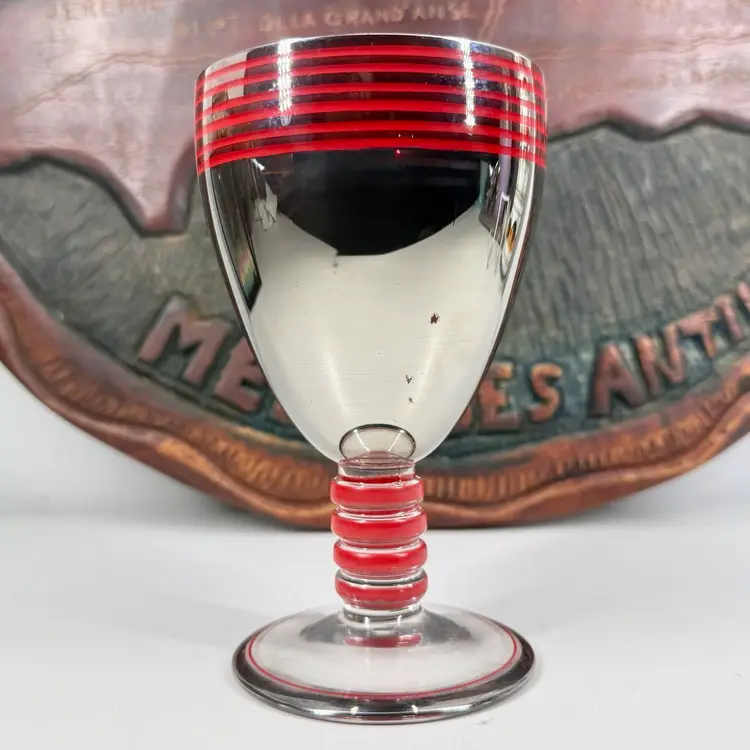 Hi... This single vintage ART DECO Platinum Plated GLASS GOBLET from the Czech Republic is a stunning piece of barware featuring hand painted red enameled details. Hand-blown glass with a reflective shine, this unmarked goblet showcases a streamline moderne style with decorative stripes and bands. Standing at 5.75 inches tall and 3.25 inches in diameter, this unique item adds a touch of Art Deco elegance to any collection. This one-of-a-kind goblet is a true representation of the craftsmanship and design of the 1930s. Perfect for collectors or those looking to add a touch of vintage 1930s Bohemian charm to their drink ware collection.