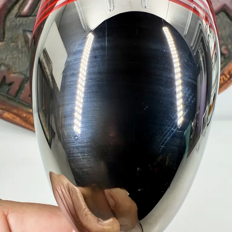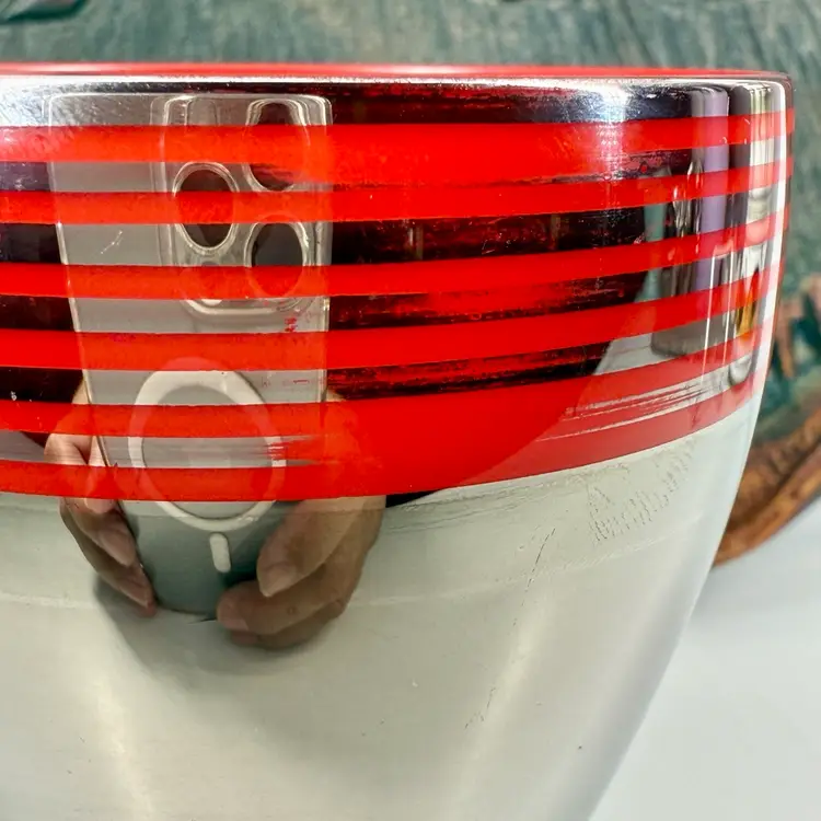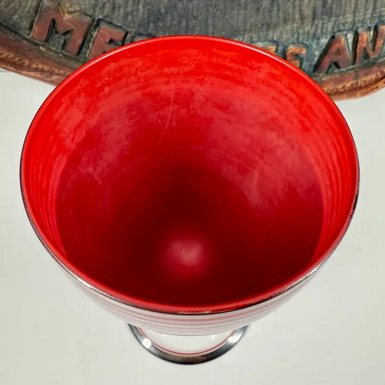 This streamline classic plated drinking glass is simply amazing and very hard to find. No scratches or smells but it does have a few spots of platinum loss. Hard to see but they're there along the upper area of striping and a few spots within the body. The red enameled interior looks to be a little worn as well. Please review all pics for details.