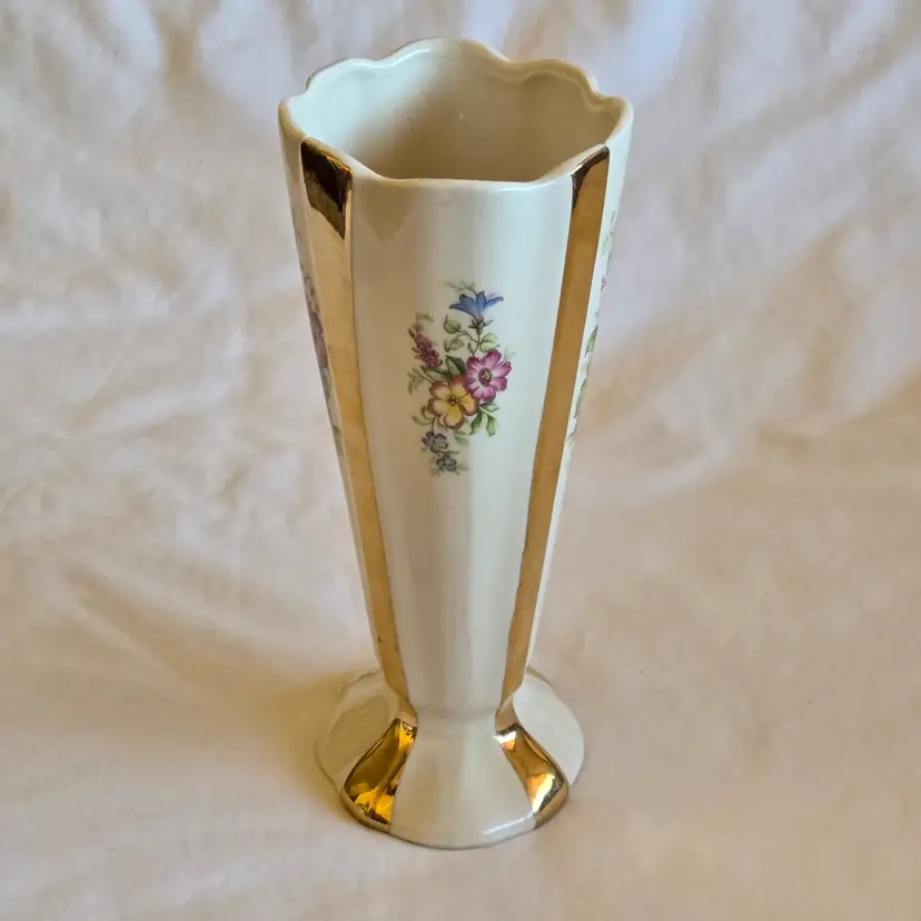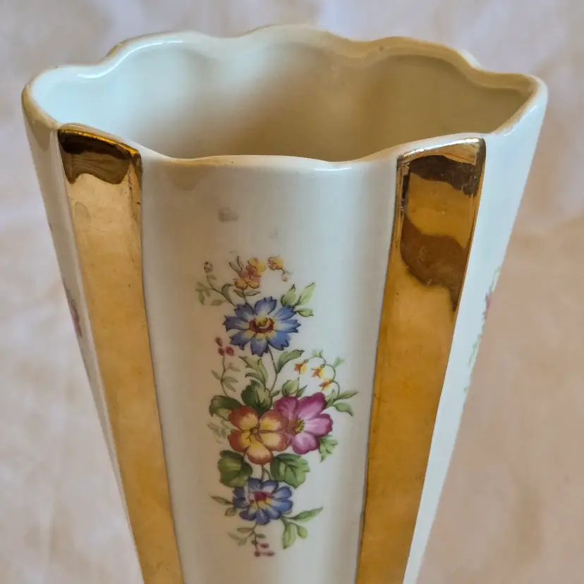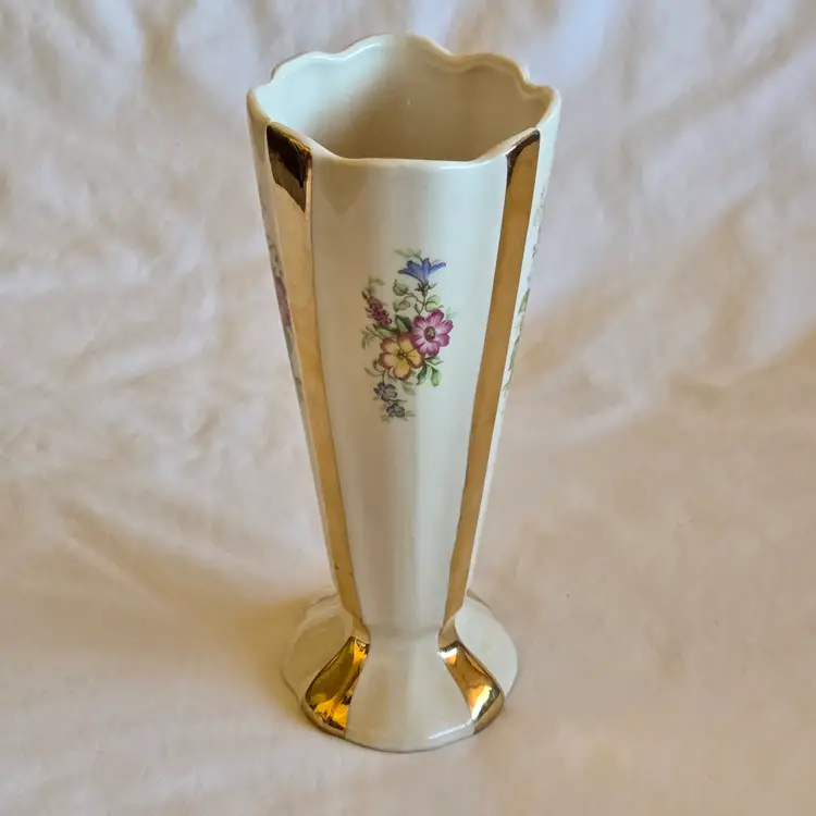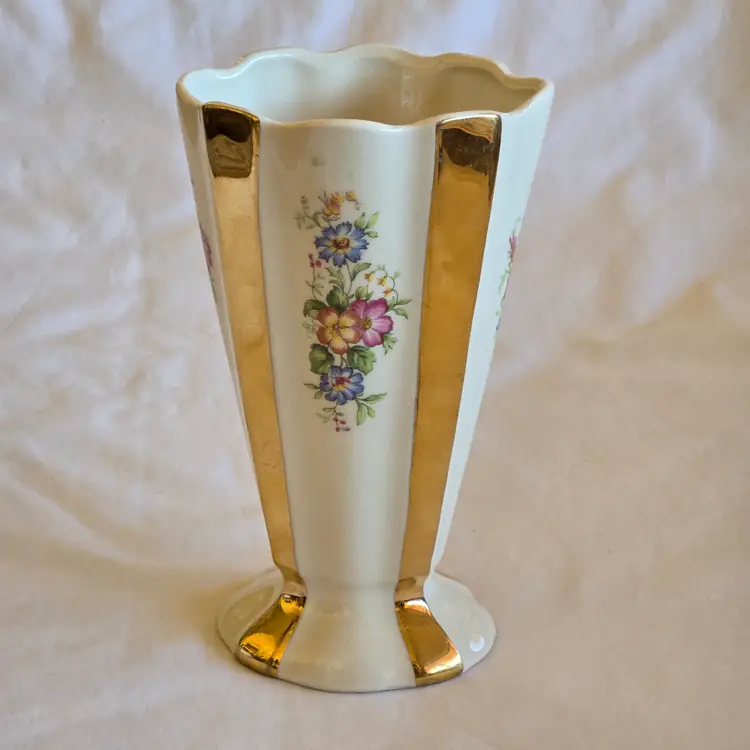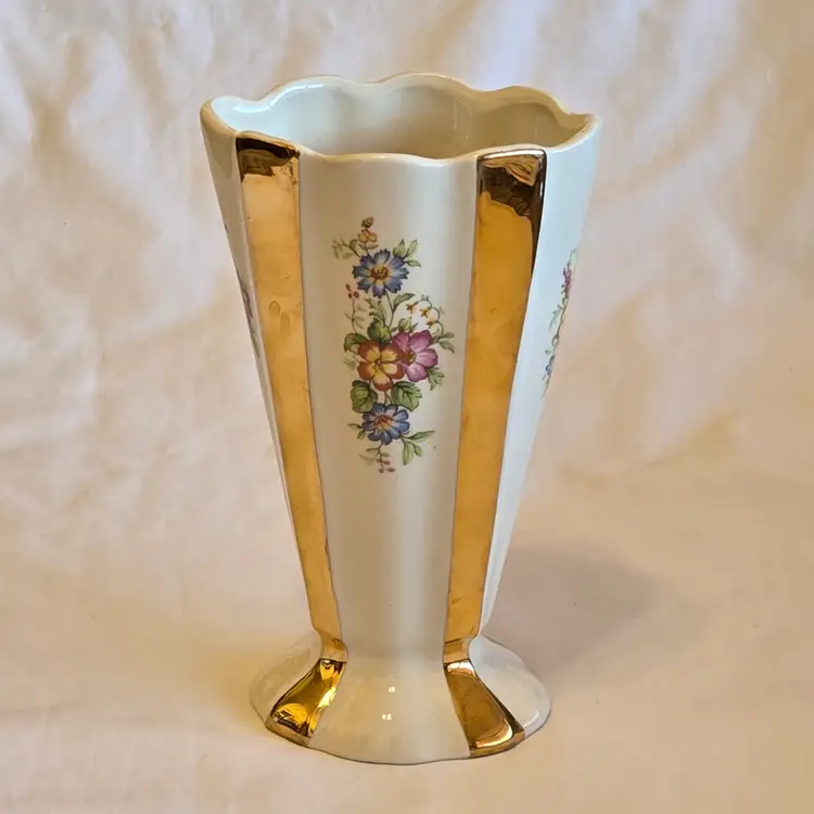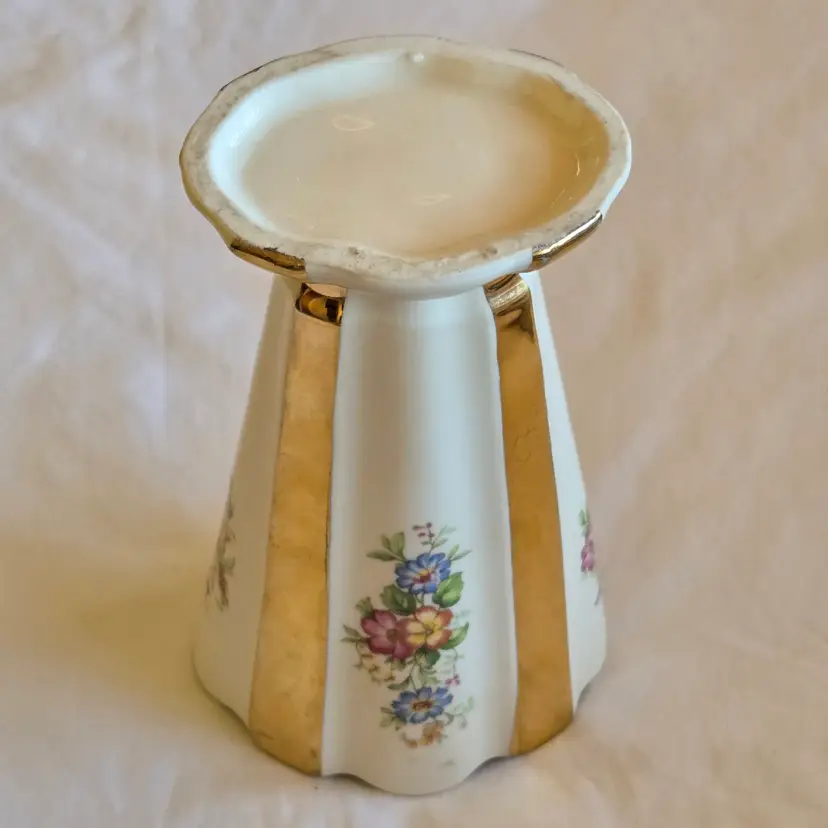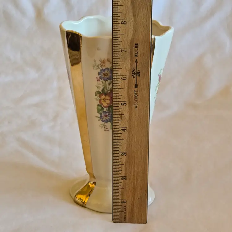 Unbranded Art Deco Porcelain Floral Fan Mantel Vase 7½" Ivory with Gold Stripes with condition Issues. Used condition with gold tarnish, stains, scratches and missing gold. Please view all the photos and please ask any questions prior to purchase when possible.