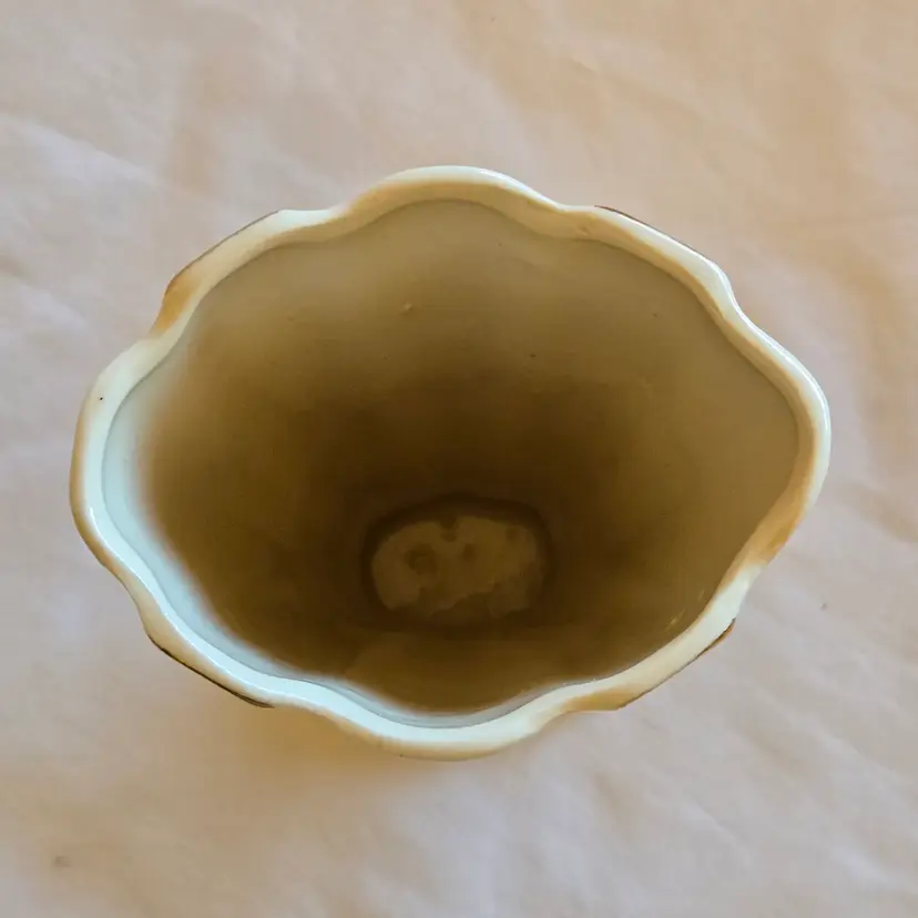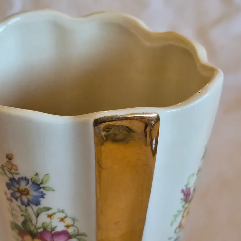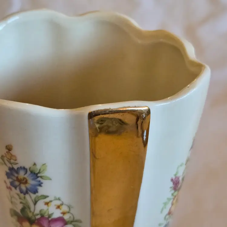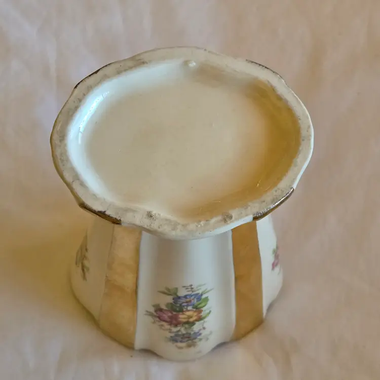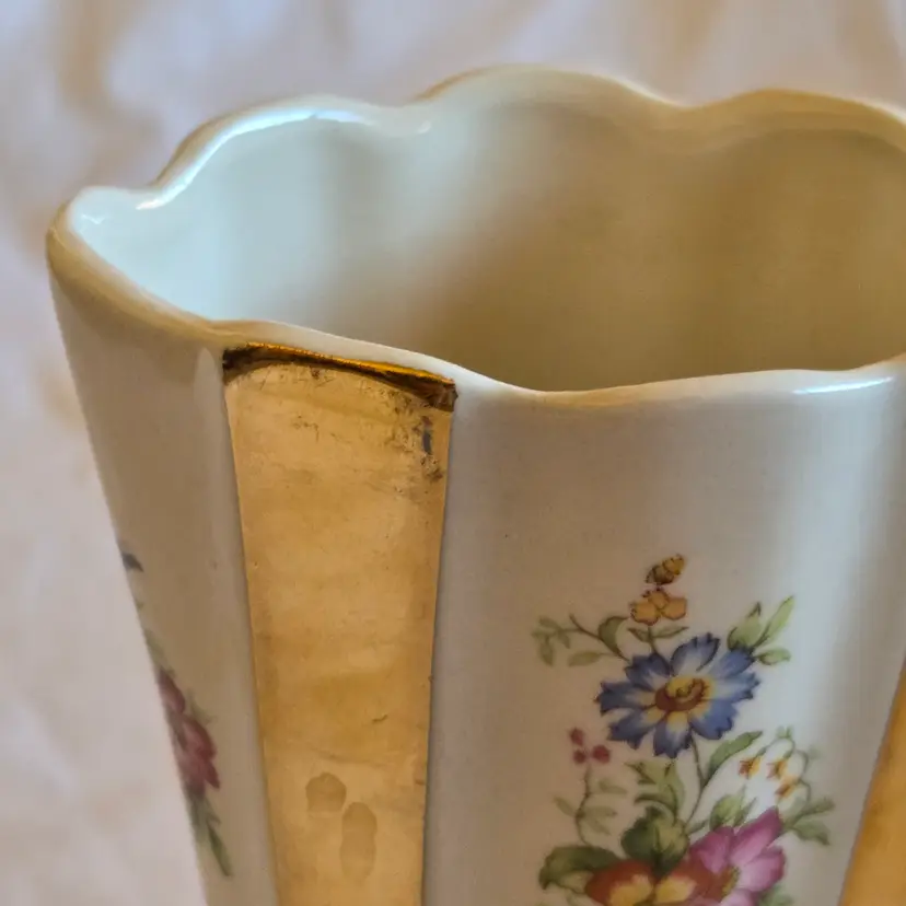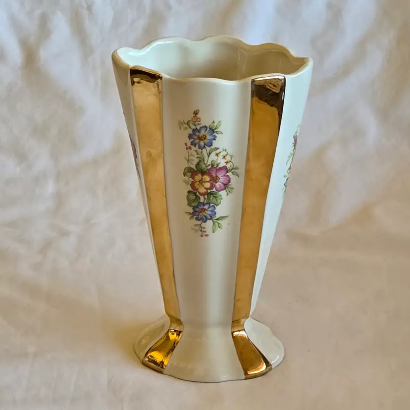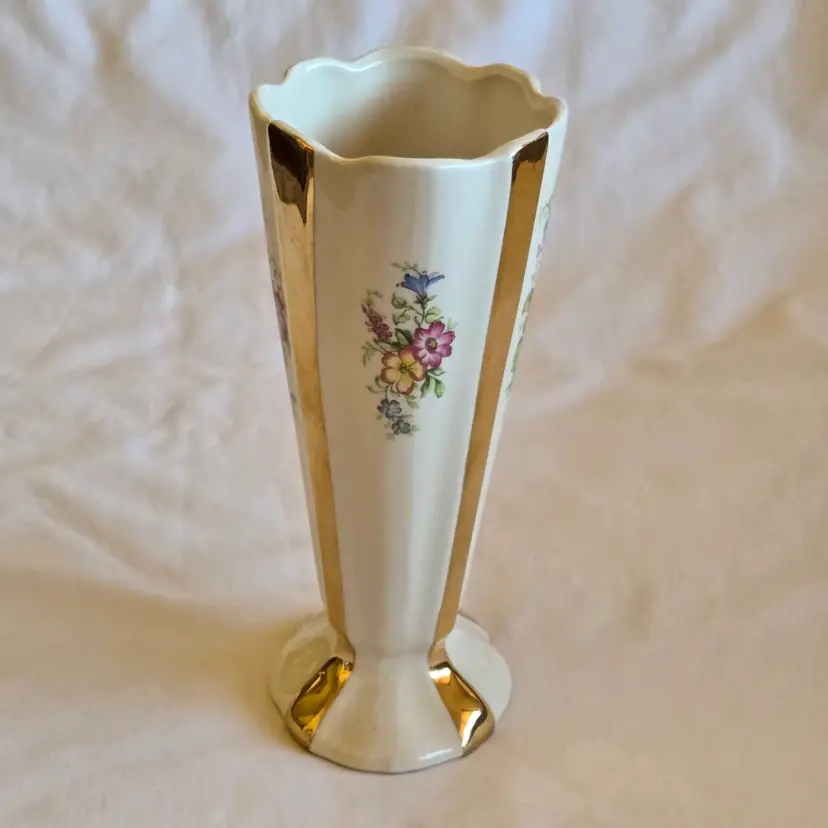 Unbranded Art Deco Porcelain Floral Fan Mantel Vase 7½" Ivory with Gold Stripes with condition Issues. Used condition with gold tarnish, stains, scratches and missing gold. Please view all the photos and please ask any questions prior to purchase when possible.