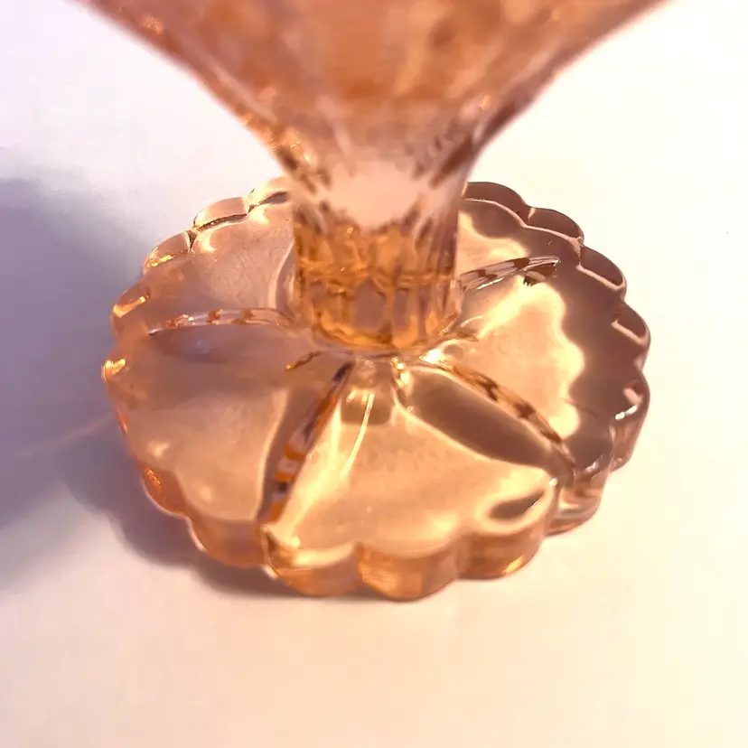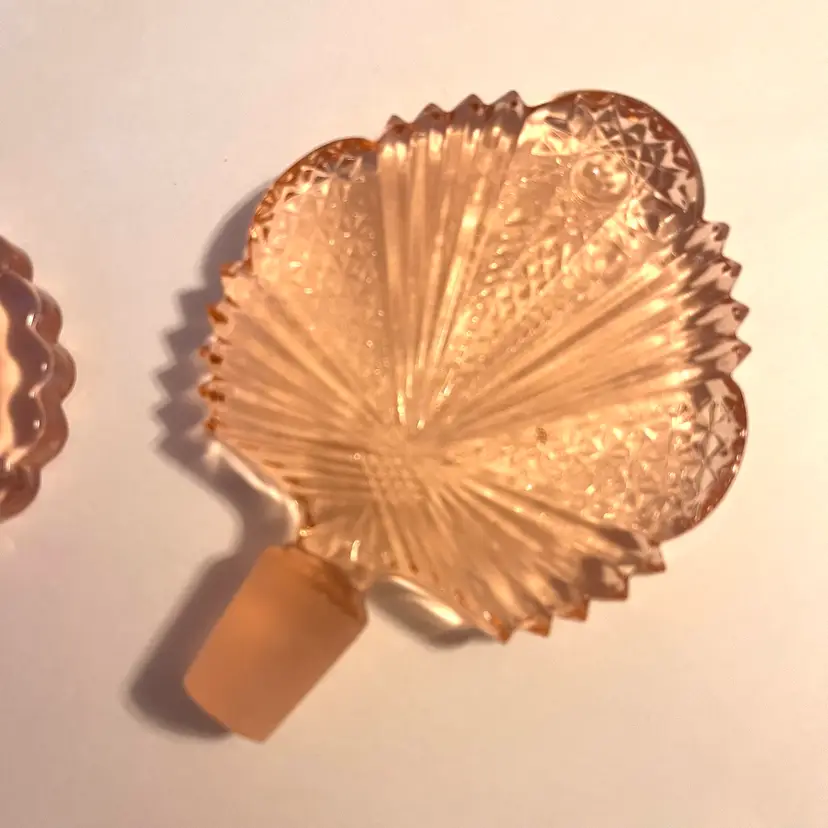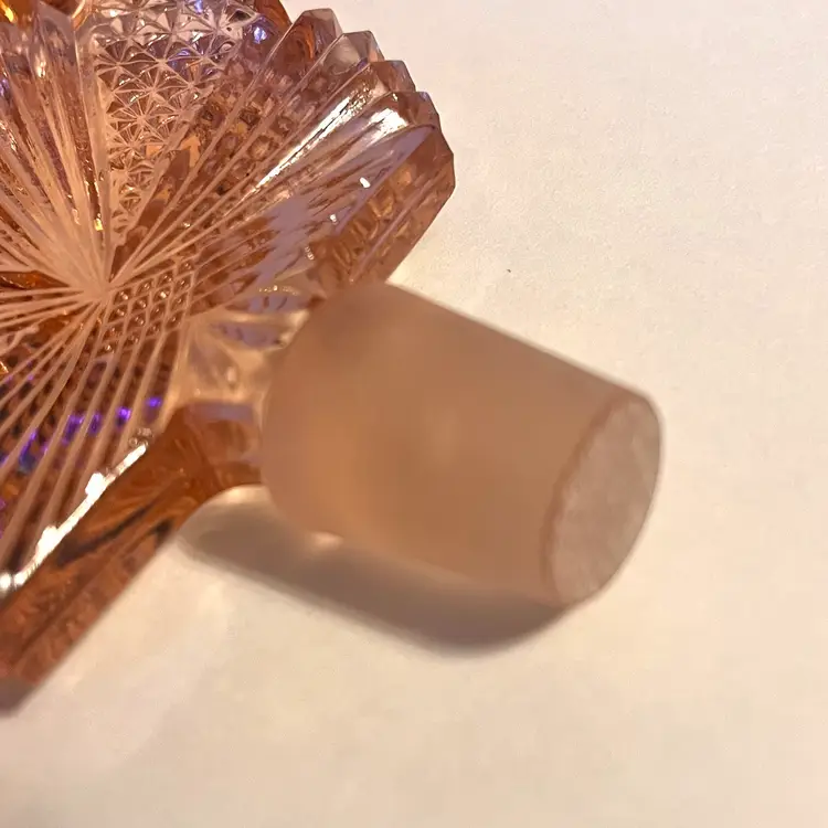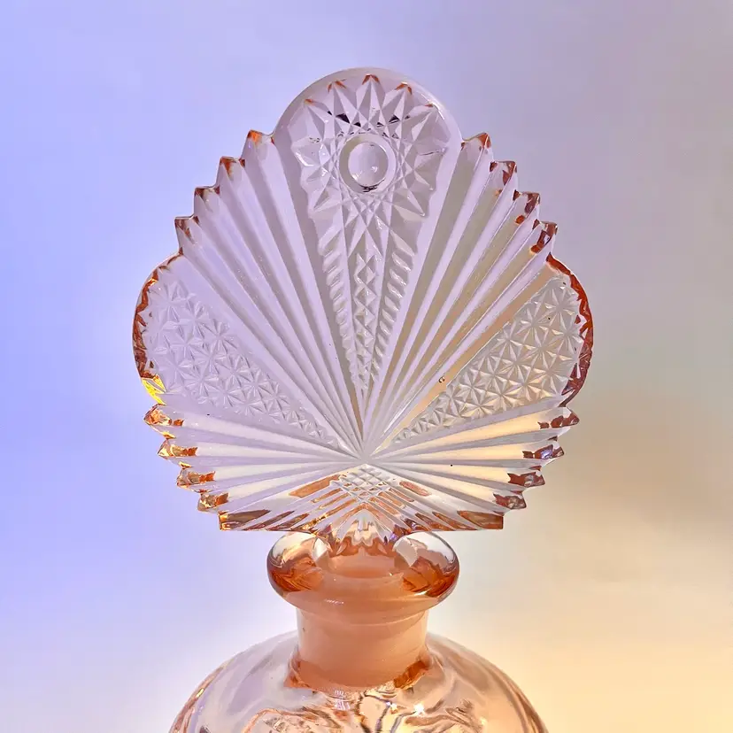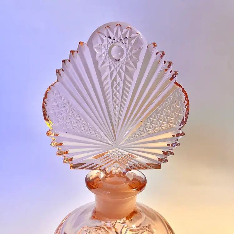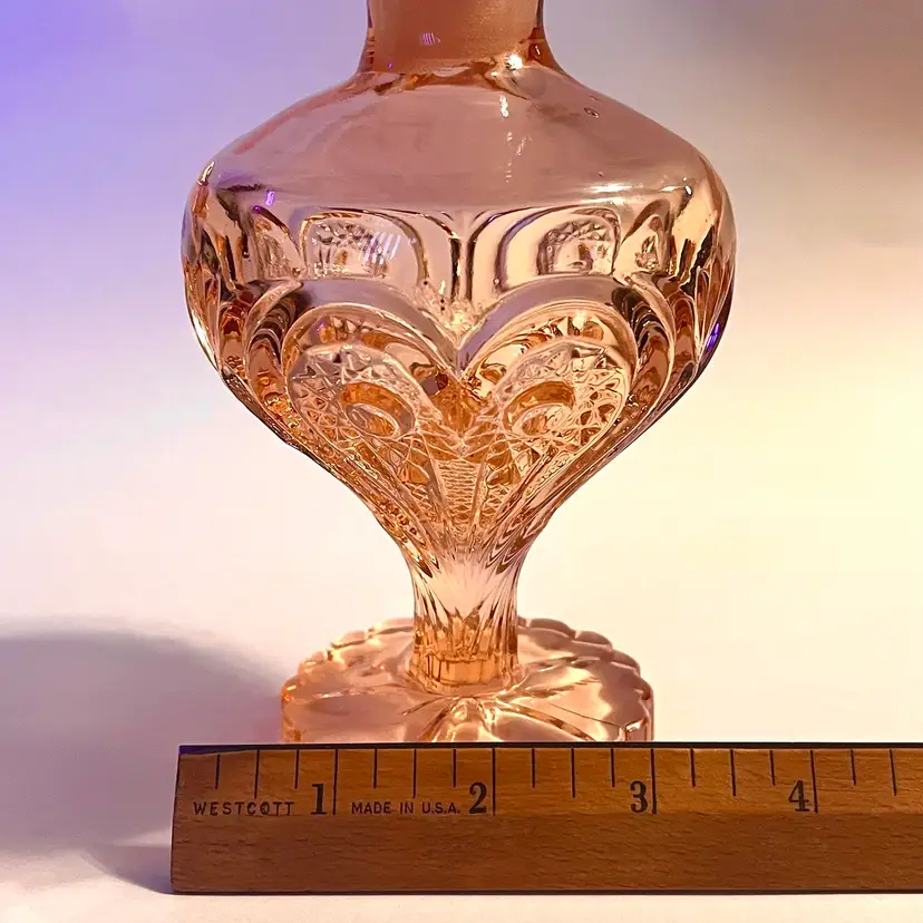 This is a vintage pressed glass pedestal perfume bottle in pink, dating to the 1940s and styled in the Art Deco tradition. Standing 10 inches tall with its large petal shaped stopper, and approx. 3.5" wide the bottle features a scalloped base and heart-shaped side panels accented by paired starburst motifs. Both the stopper and inner neck are ground, indicating a higher-quality finish typical of mid-century vanity glass. The piece is mold-blown, not hand-blown, and shows faint seams consistent with its production method.