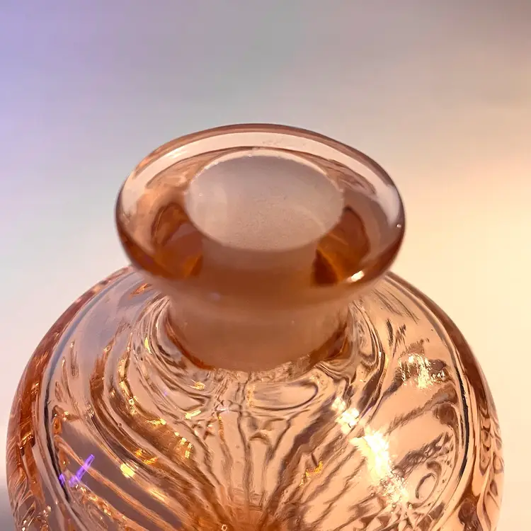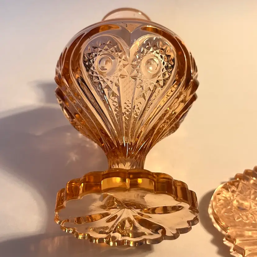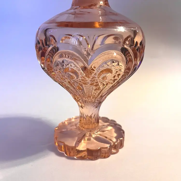 While unmarked, the design and construction suggest possible origins in Czechoslovakia, known for its export of decorative vanity glass during the interwar period. It may also be associated with Irice (Irving W. Rice & Co.), a New York-based importer that sourced perfume bottles from Czech and Japanese makers before and after World War II, and later commissioned similar styles from American companies like Imperial Glass. The romantic motif and pedestal form also echo styles produced by U.S. firms such as New Martinsville or Fostoria, which blended pressed glass techniques with elegant finishing.