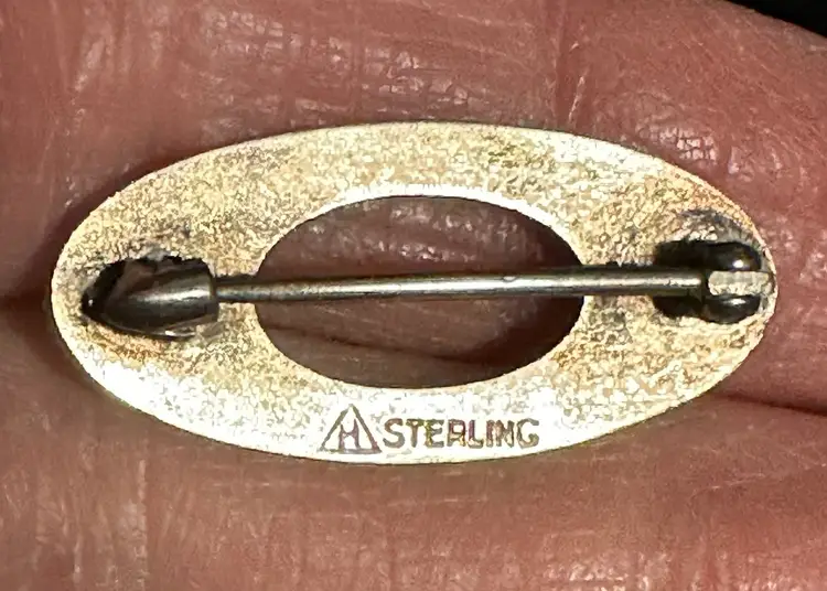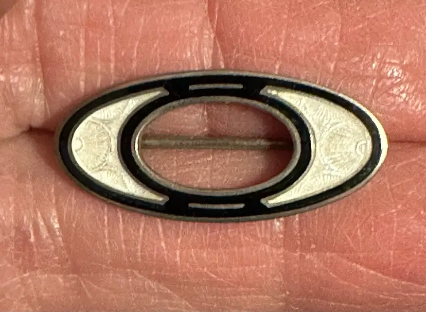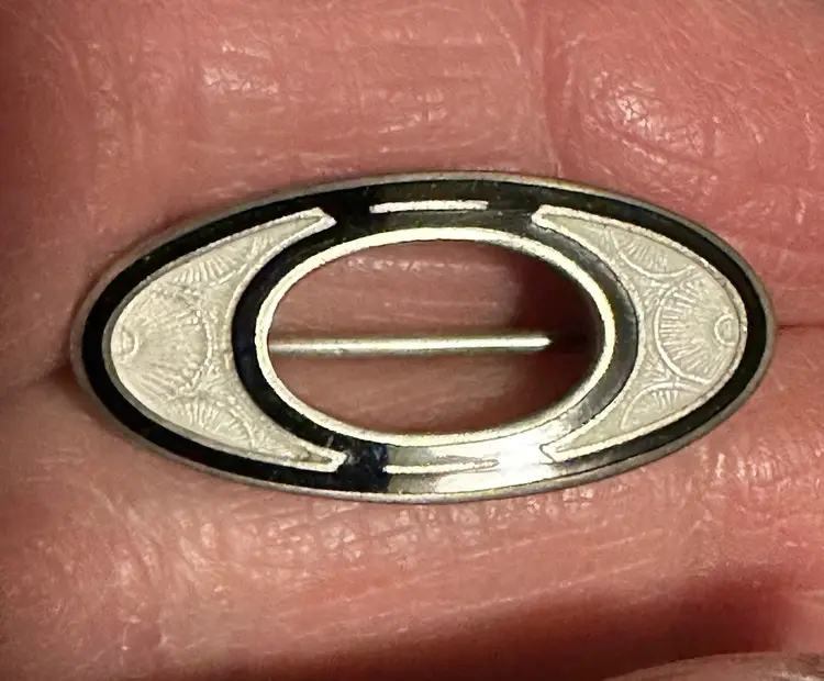 F A Hermann sterling silver with black and white enameling. It is 1 1/8” x .5”. It is in very good condition.