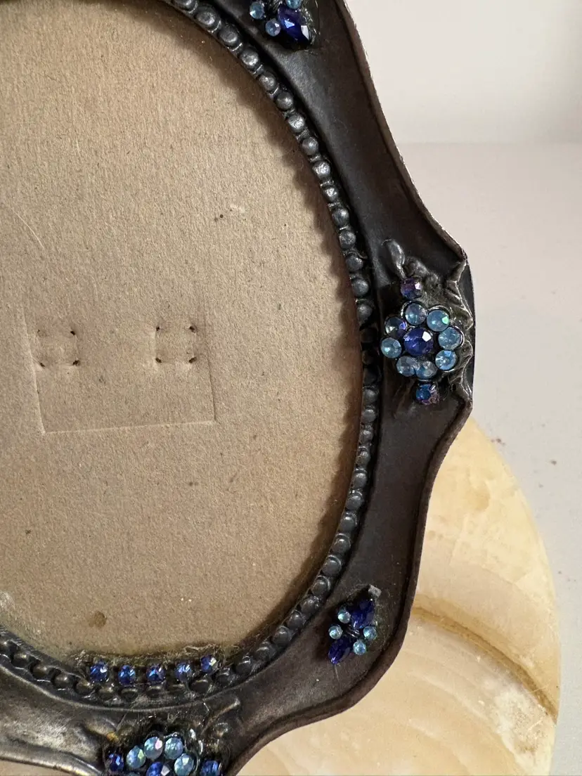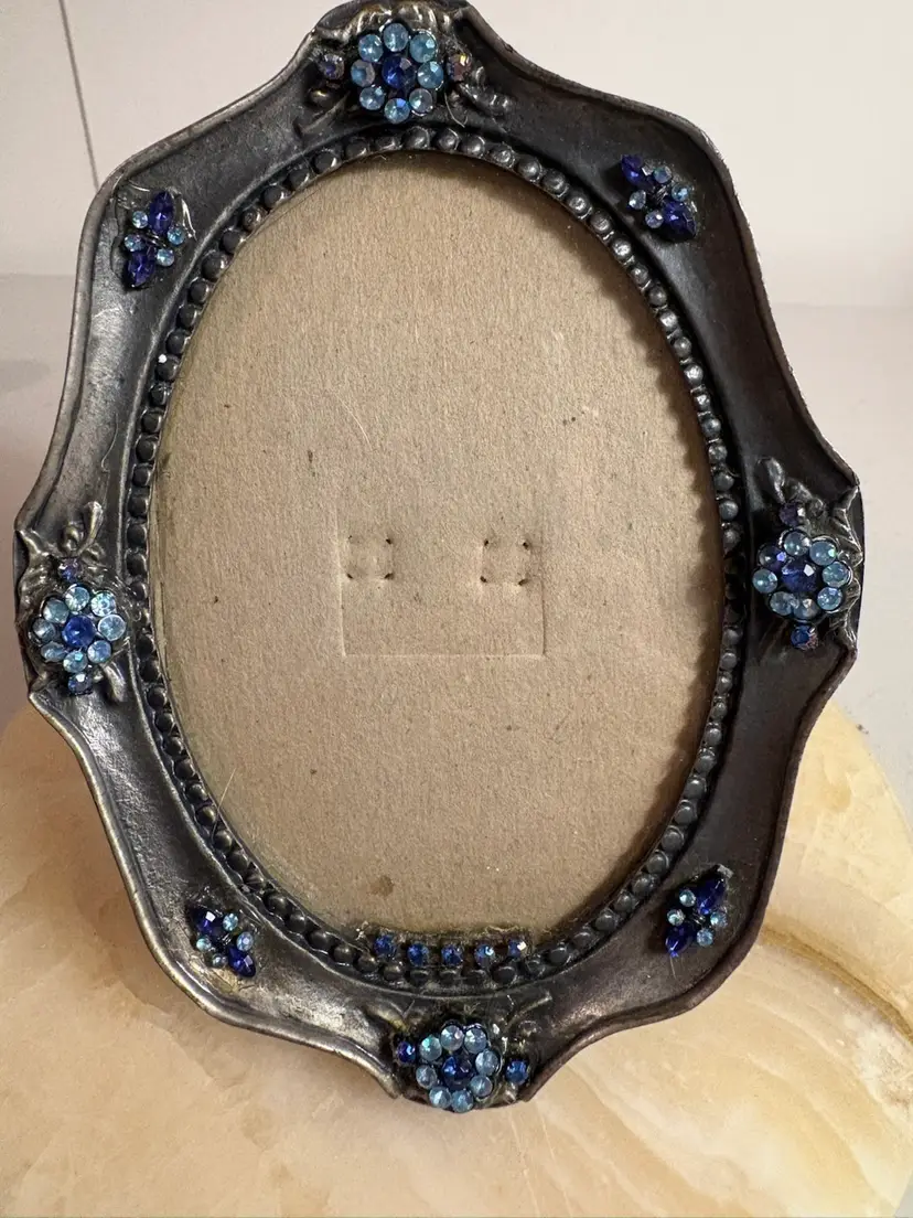 This is silver tone with light blue floral rhinestones. It measures 6” X 4 1/4”.