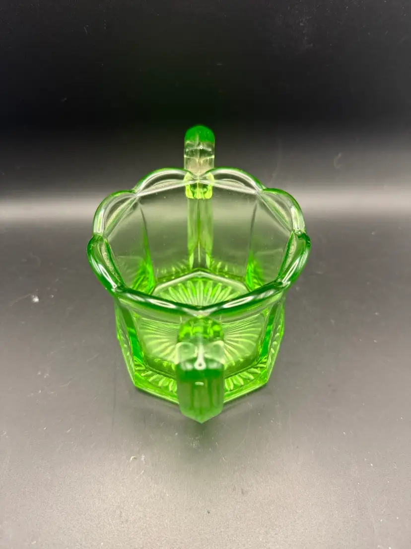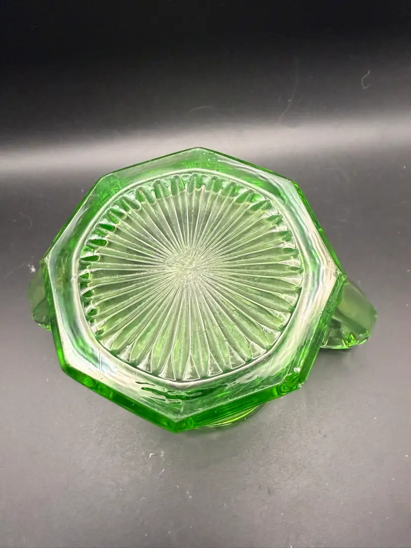 This particular sugar bowl, with its Art Deco styling and scalloped rim, is indicative of the Depression glass era in the United States, roughly spanning the 1930s. These pieces were mass-produced but are now highly collectible due to their unique properties and aesthetic appeal. The fan pattern on the base is a common decorative motif found on many Depression glass items.