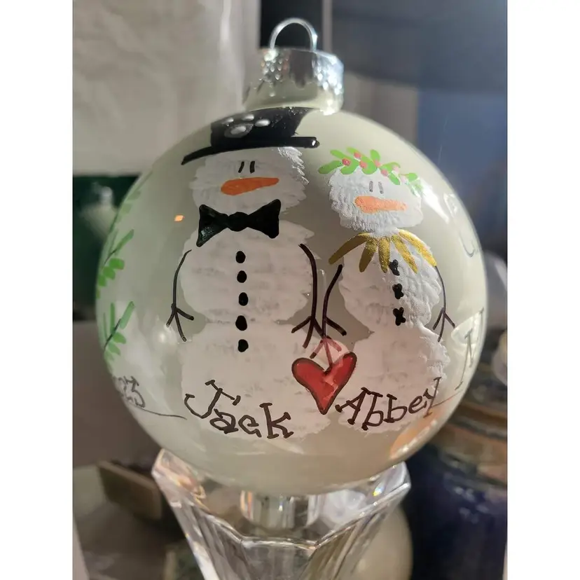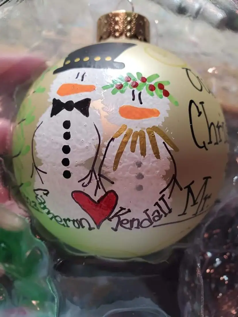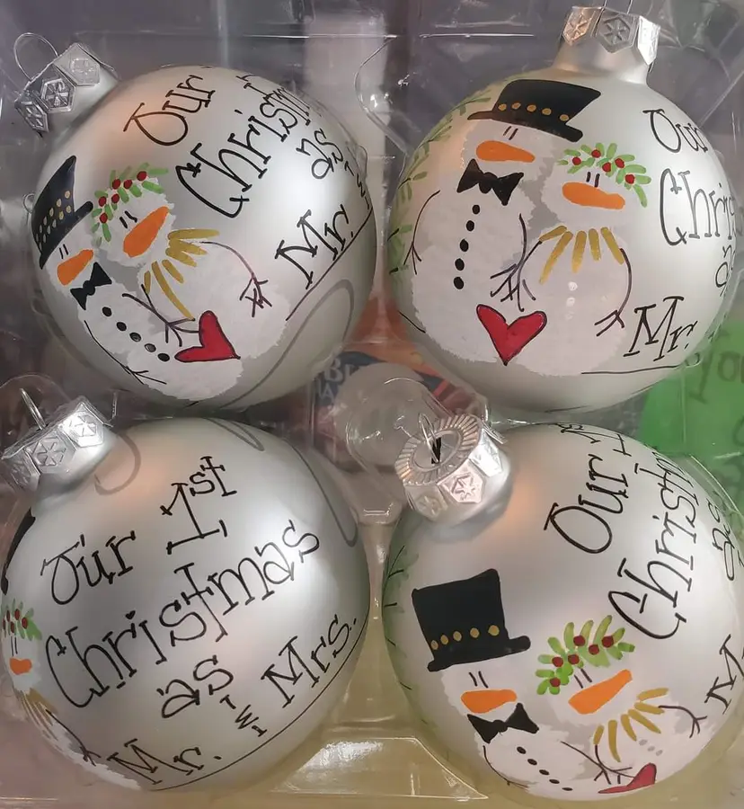 I have been hand painting and personalizing whimsical Christmas ornaments for 33 years. I love that my artwork is part of Christmas memories. After purchasing please message me the Groom and Brides Name indicate please which is the bride. Also the year you would like on it. I can add cats and dog names under the tree with paw prints. 🐾