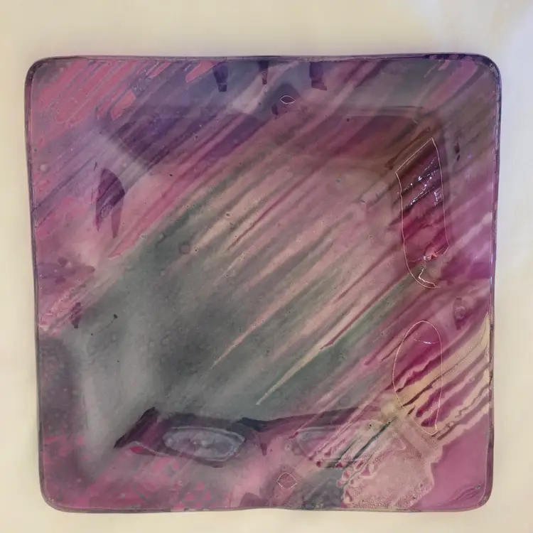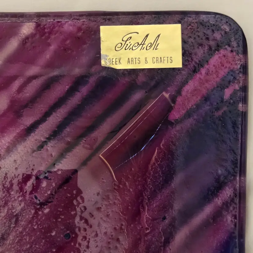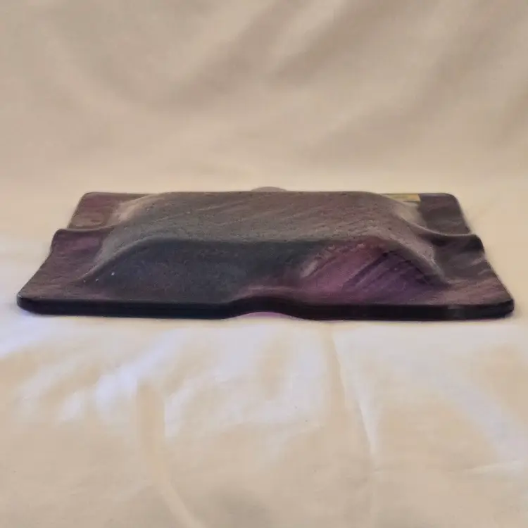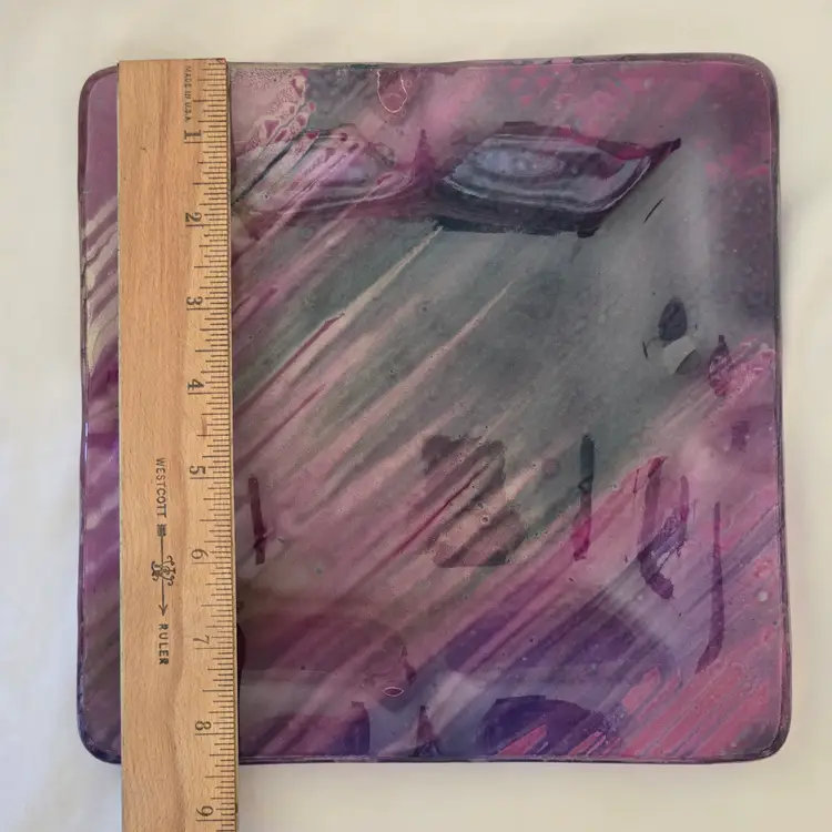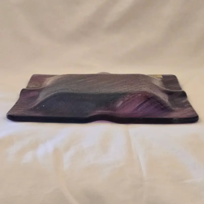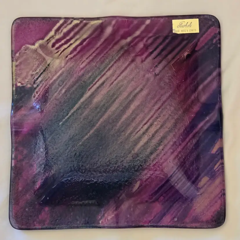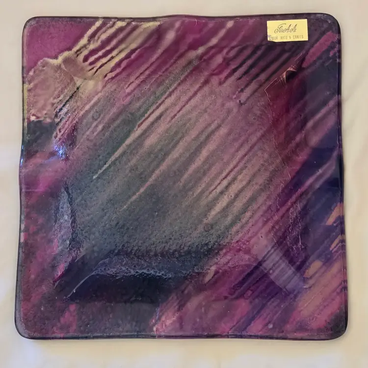 Art Fused Glass Ashtray Decorative Plate Made In Greece Sticker 8½" Square approximately. Used condition with some sticker residue, fingerprints, loose sticker in bottom, manufacturer flaws including dirt, bubbles, stains all within the glass. Please view all the photos and please ask any questions prior to purchase when possible.