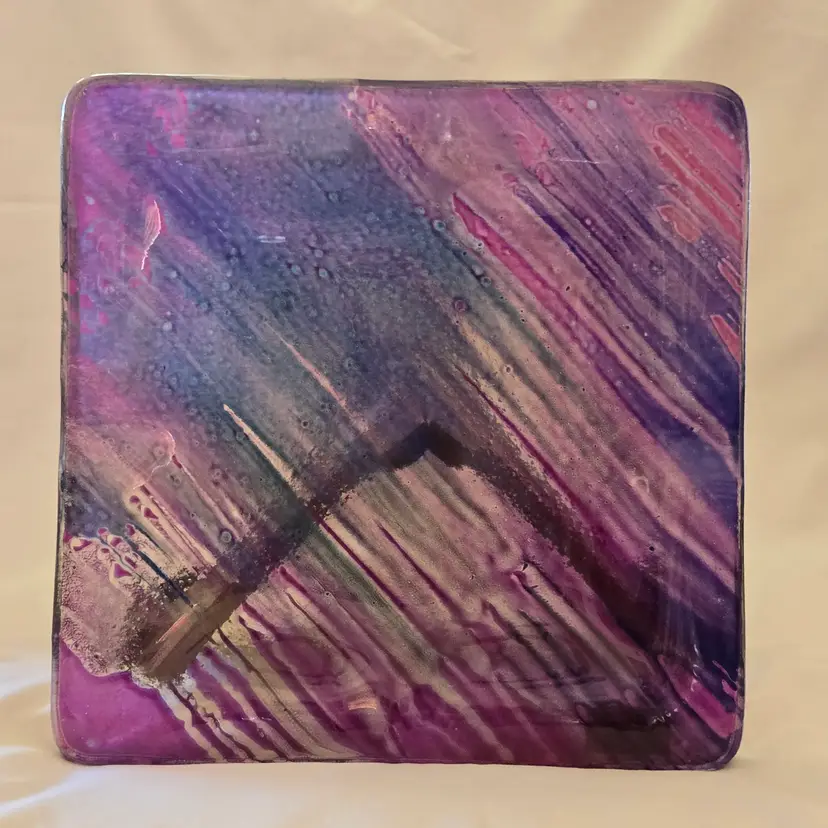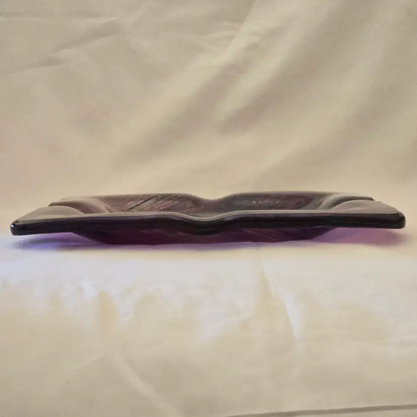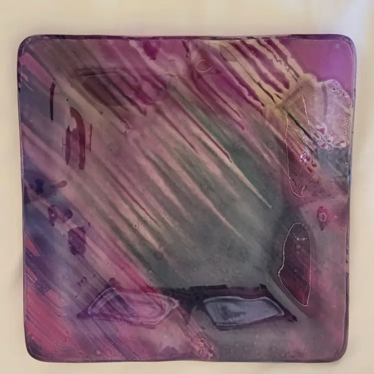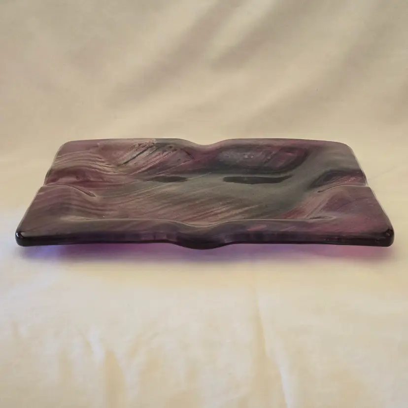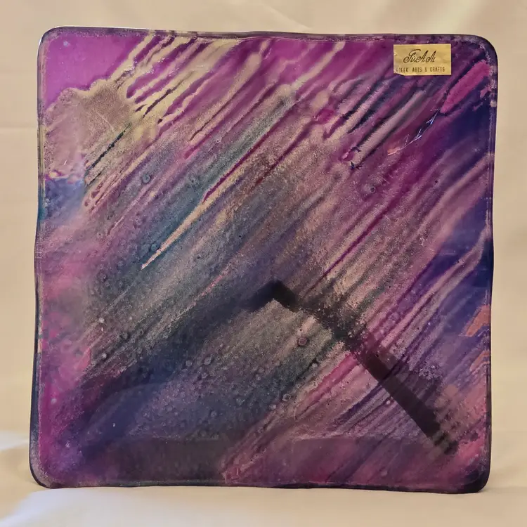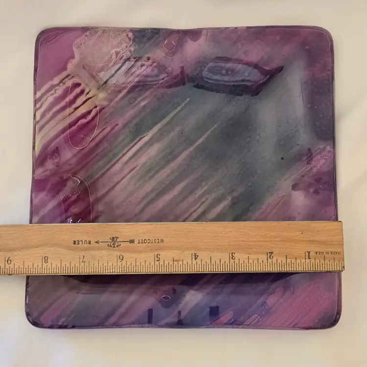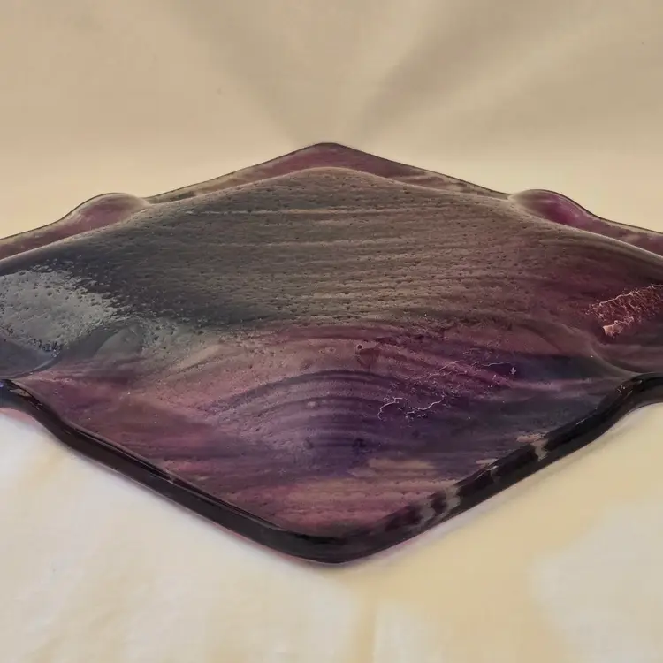 Art Fused Glass Ashtray Decorative Plate Made In Greece Sticker 8½" Square approximately. Used condition with some sticker residue, fingerprints, loose sticker in bottom, manufacturer flaws including dirt, bubbles, stains all within the glass. Please view all the photos and please ask any questions prior to purchase when possible.