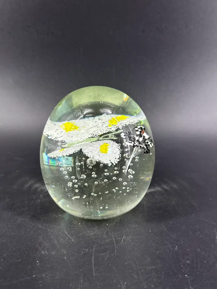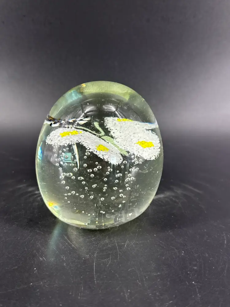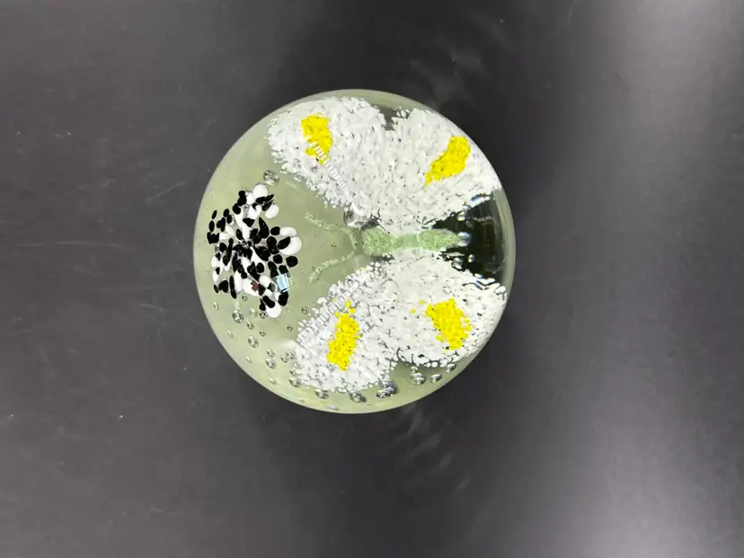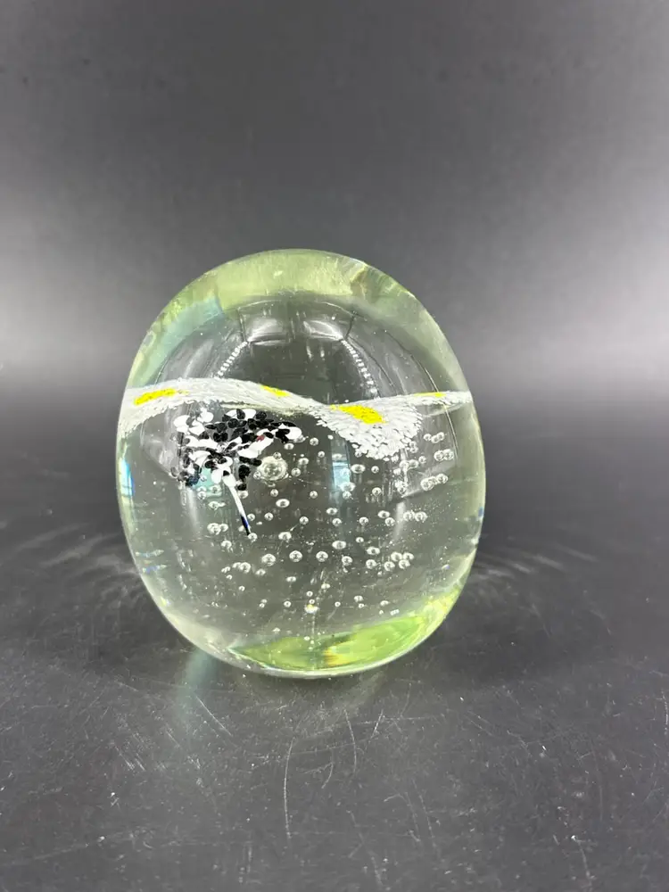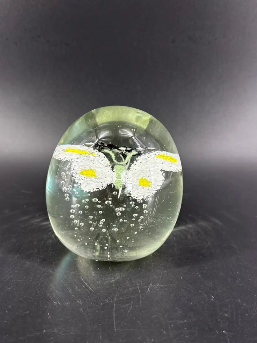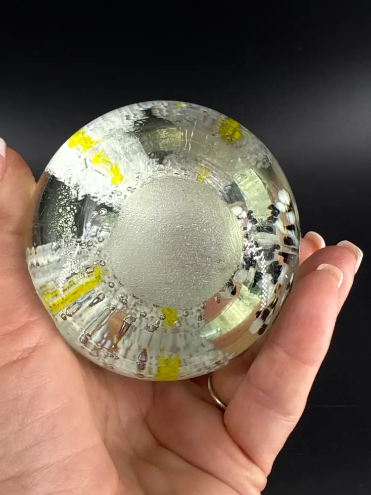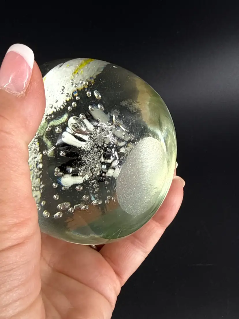 It is 3.5" tall and measures 3.25" in diameter. It is in great condition. There are no cracks, breaks, chips or repairs. There is a manufacturing defect on the bottom. (See photos).