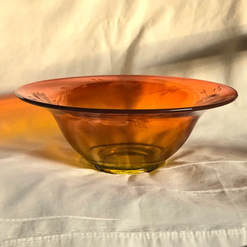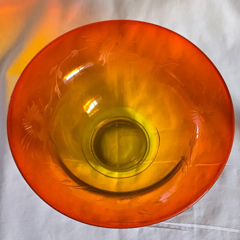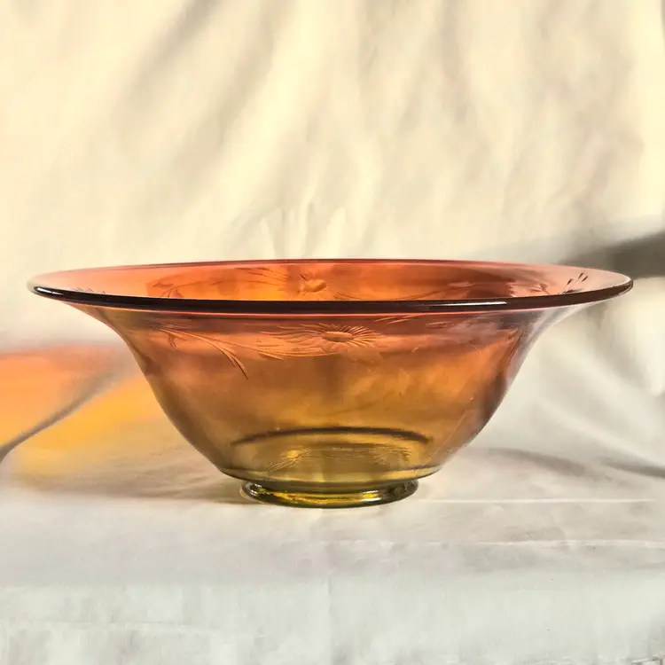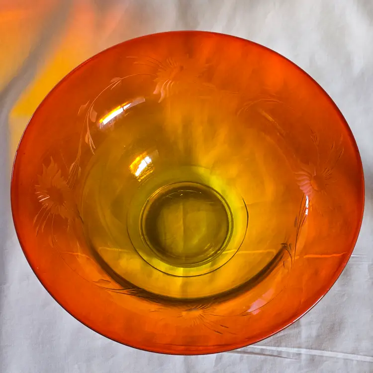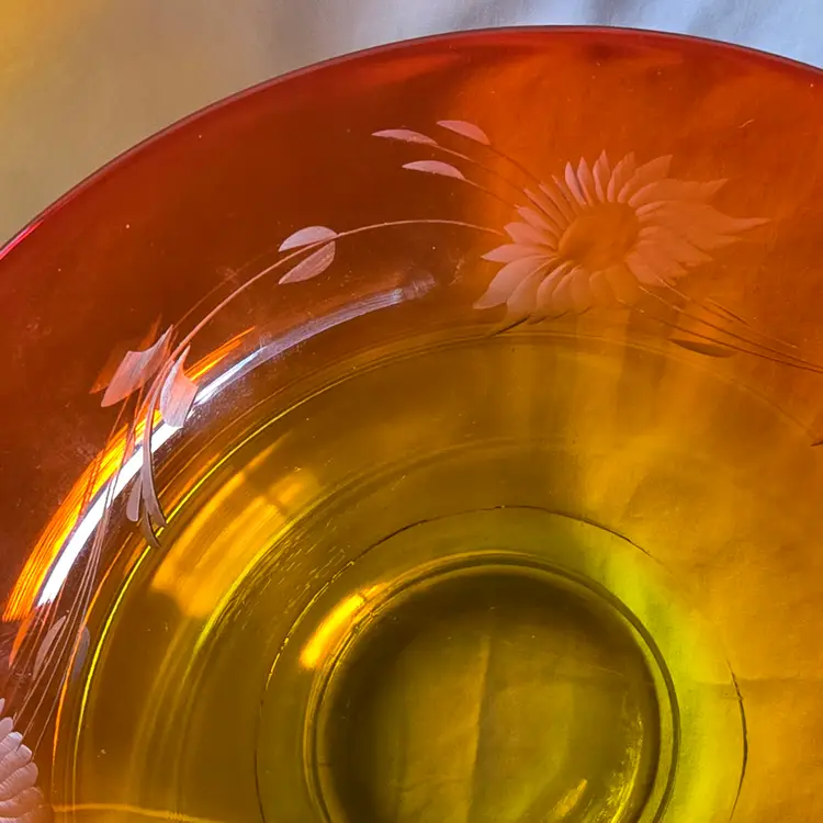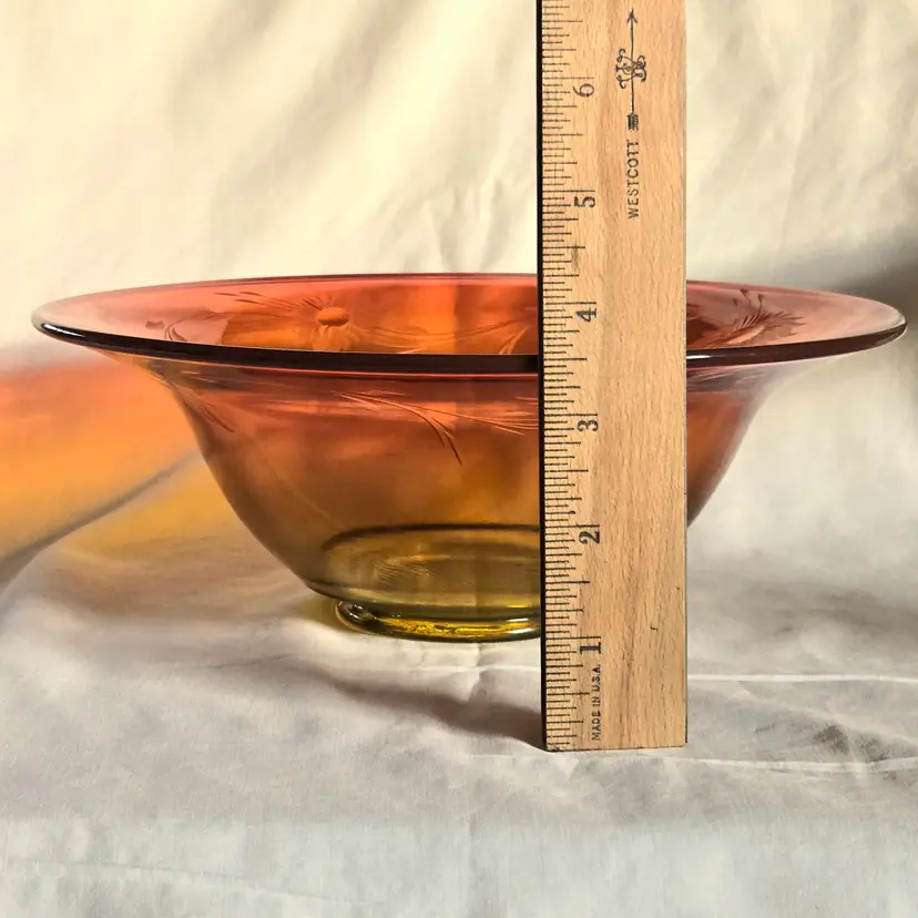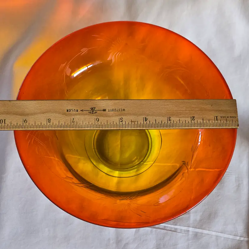 Art Glass Amberina Bowl Glowy Etched Floral Mid-Century Modern 9⅜" Diameter Unbranded Vintage. Used condition with manufacture flaws including dirt, straw marks, ripples in glass, bubbles and fingerprints from handling, scratches, stains, from handling. Please view all the photos and please ask any questions prior to purchase when possible.