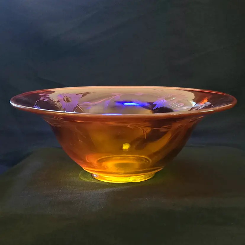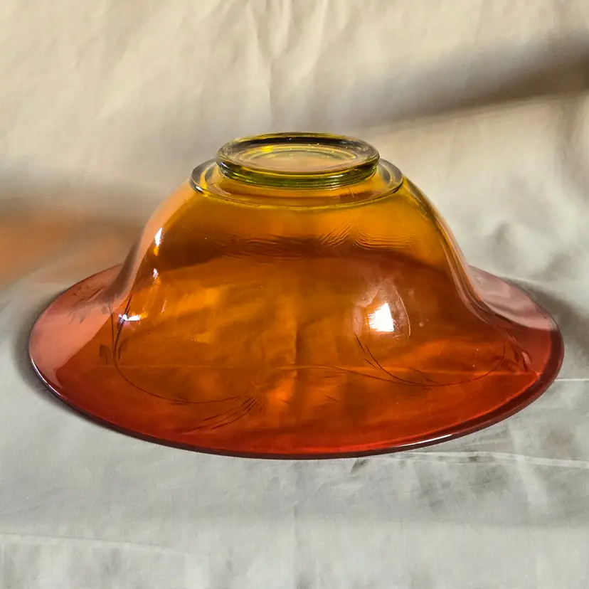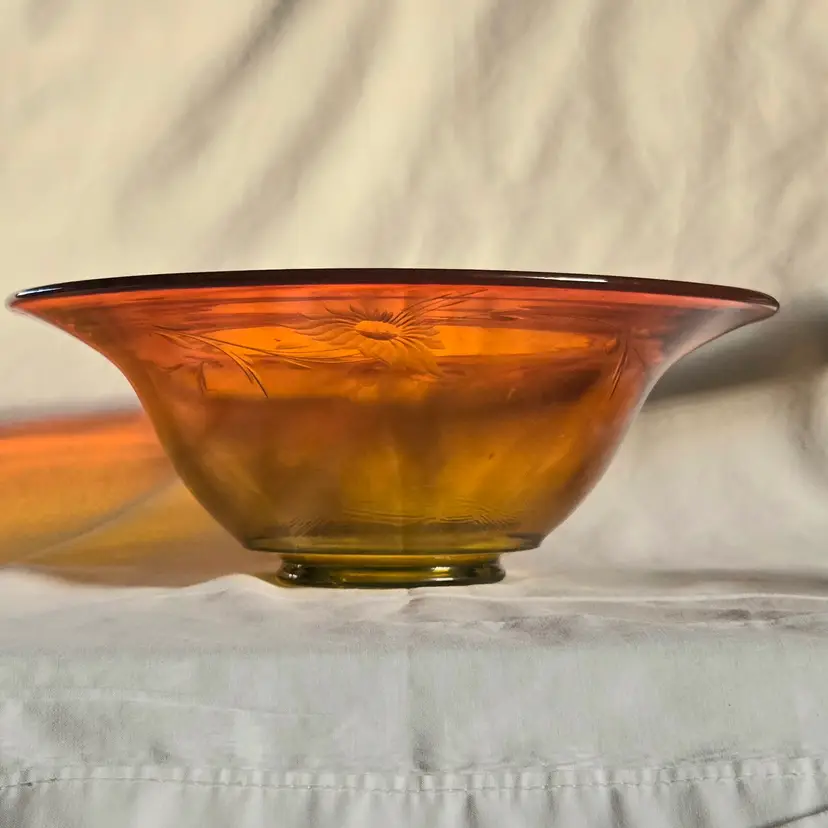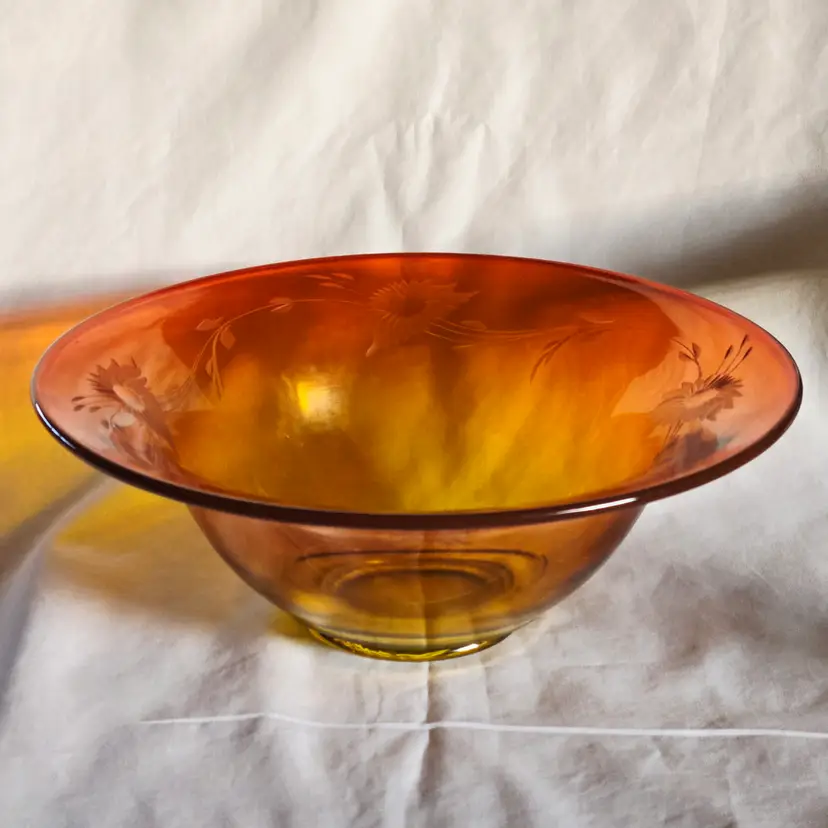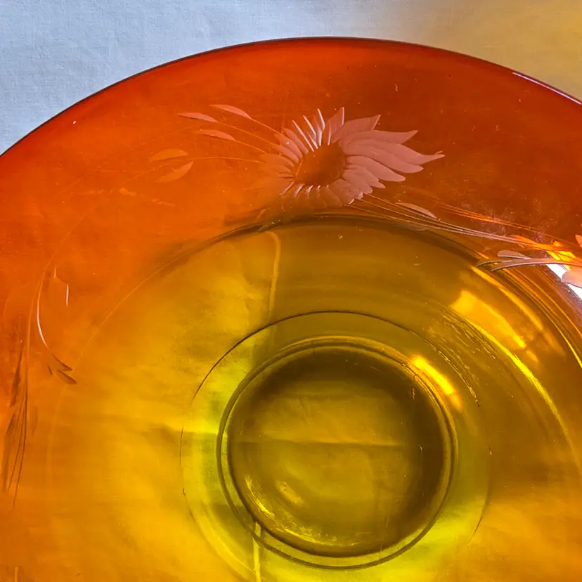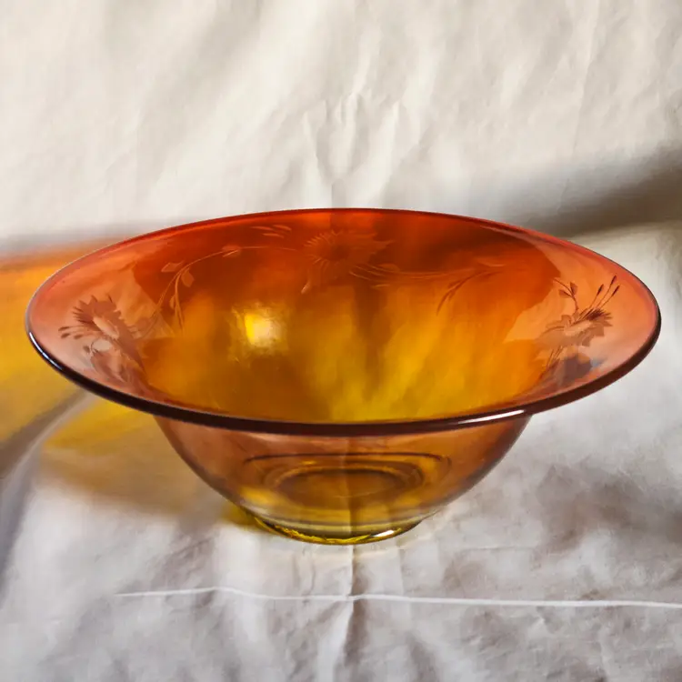 Art Glass Amberina Bowl Glowy Etched Floral Mid-Century Modern 9⅜" Diameter Unbranded Vintage. Used condition with manufacture flaws including dirt, straw marks, ripples in glass, bubbles and fingerprints from handling, scratches, stains, from handling. Please view all the photos and please ask any questions prior to purchase when possible.