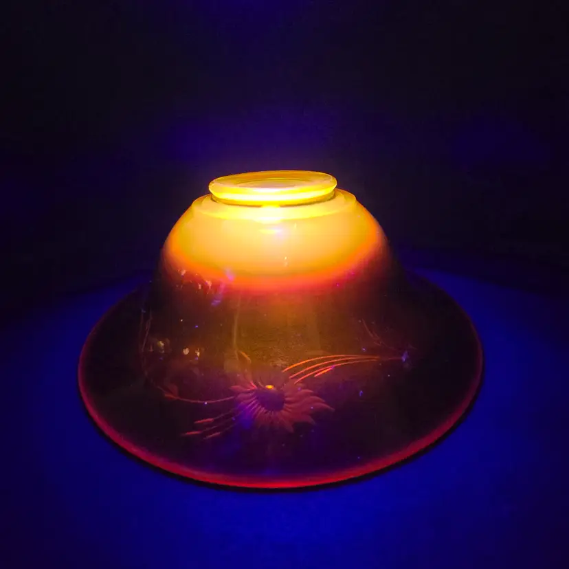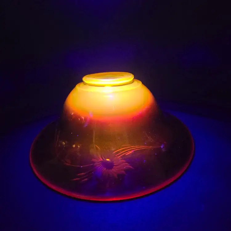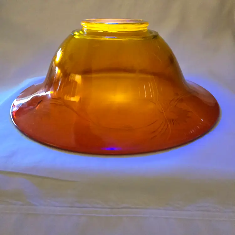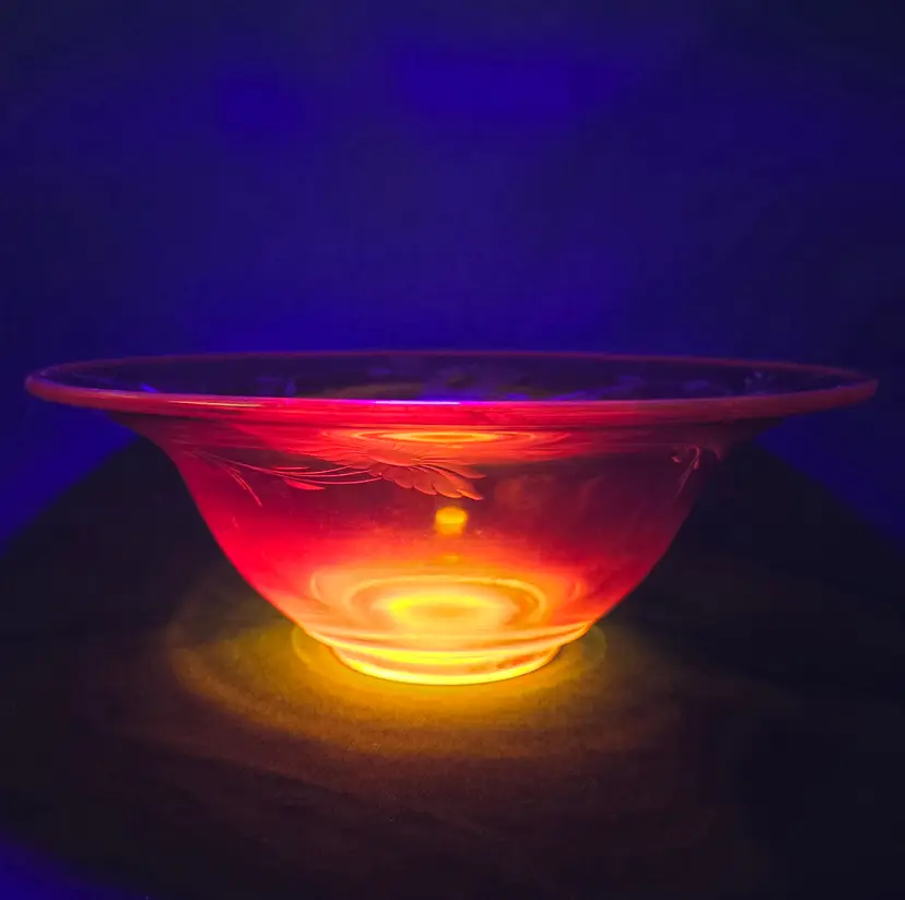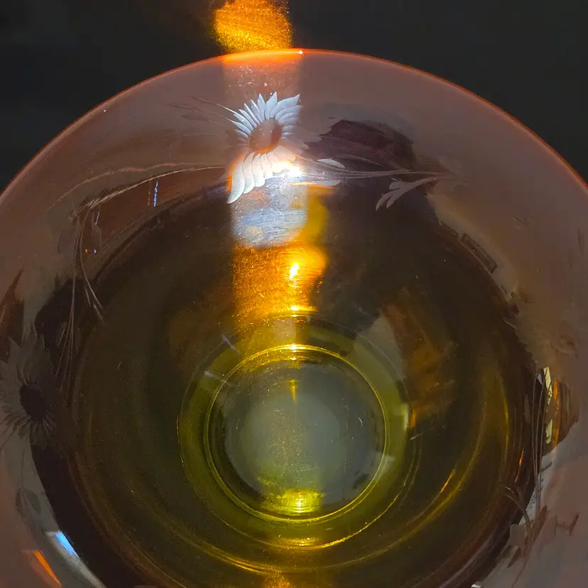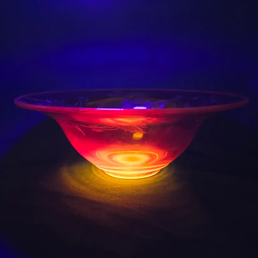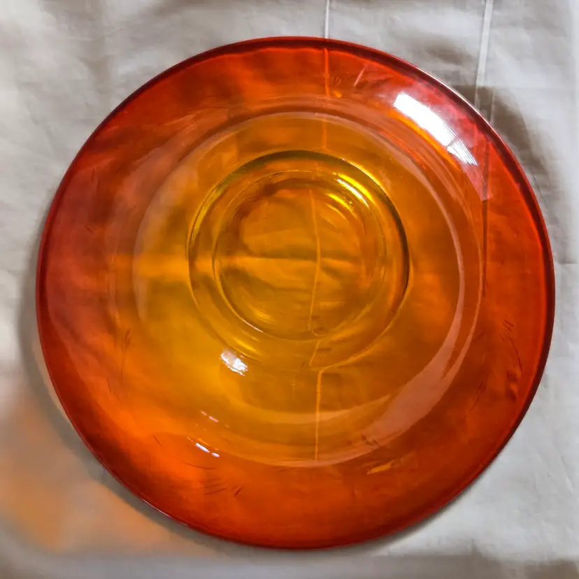 Art Glass Amberina Bowl Glowy Etched Floral Mid-Century Modern 9⅜" Diameter Unbranded Vintage. Used condition with manufacture flaws including dirt, straw marks, ripples in glass, bubbles and fingerprints from handling, scratches, stains, from handling. Please view all the photos and please ask any questions prior to purchase when possible.