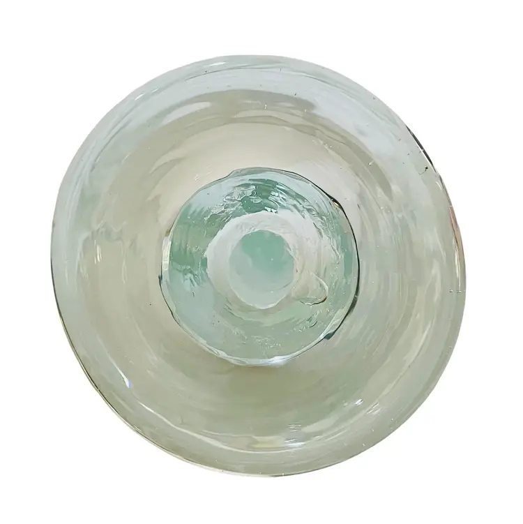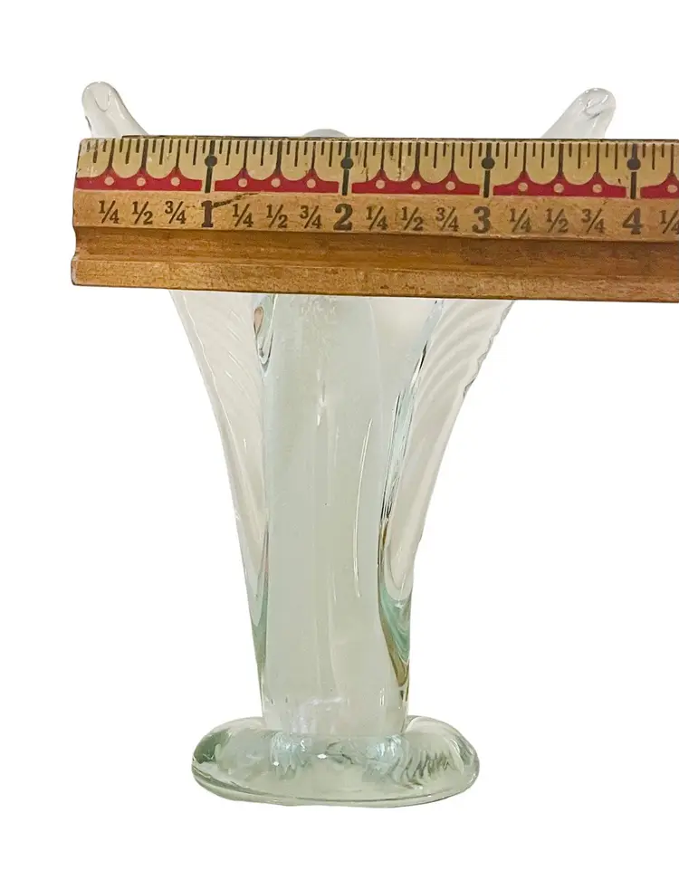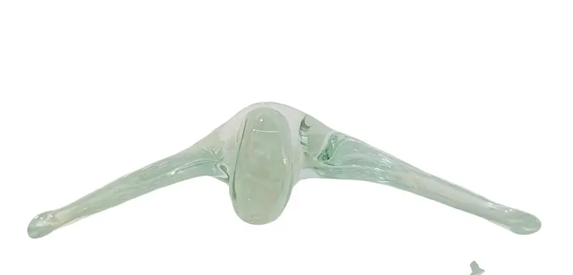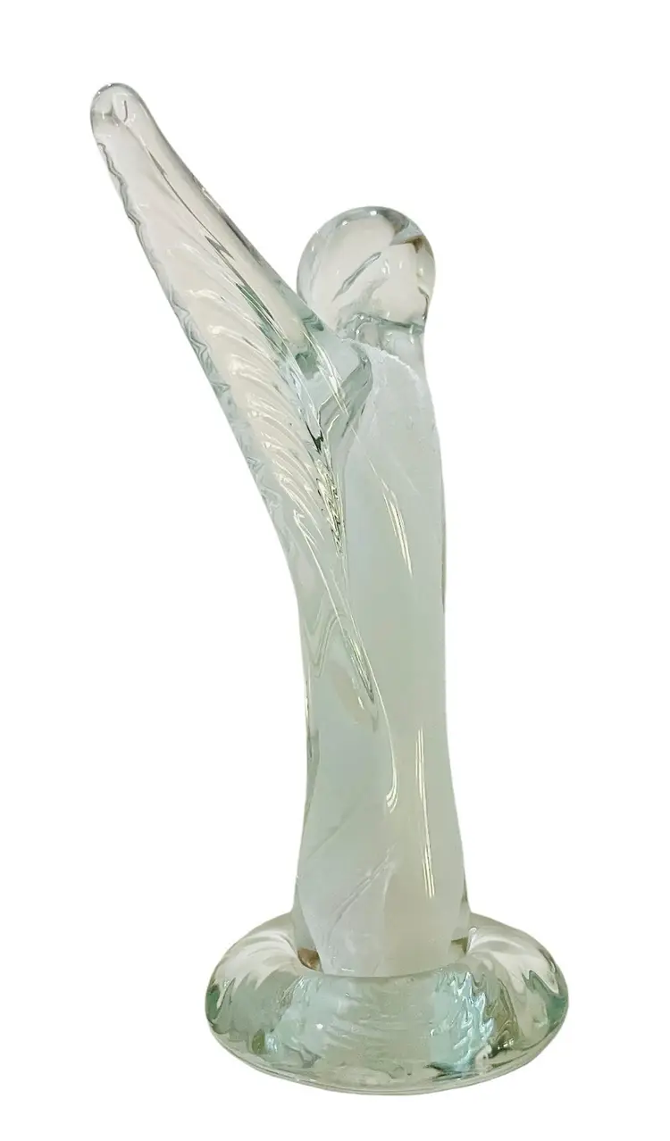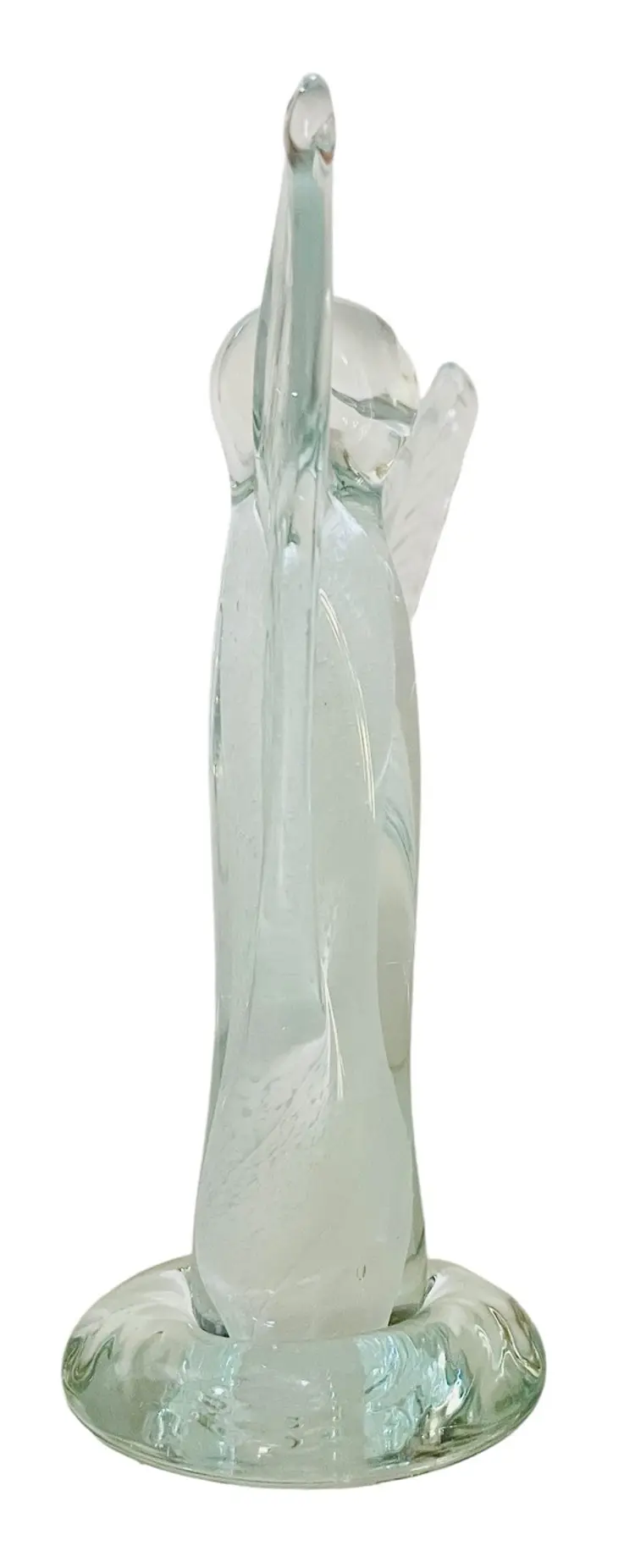 This stunning art glass paperweight figurine features a beautiful angel with wings spread, handcrafted from clear glass using the hand blown technique. Measuring 5 inches in height and 4 inches in width, this original piece is sure to add a touch of elegance to any room. The mottled white body and glossy finish make this paperweight a unique and special addition to any collection. Made by an unmarked brand, this glass paperweight figurine is a one-of-a-kind item that is both beautiful and functional. Perfect for display on a shelf or as a decorative piece on a desk, this handmade item is a must-have for any lover of art glass. With its original production style and production technique, this piece is a true work of art.