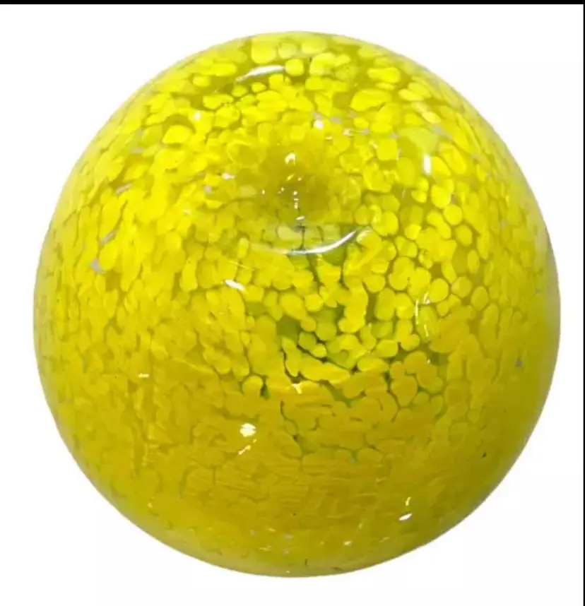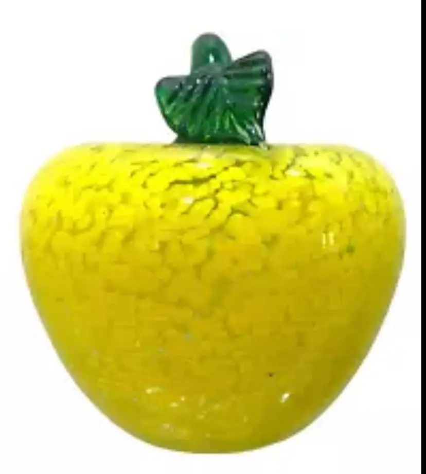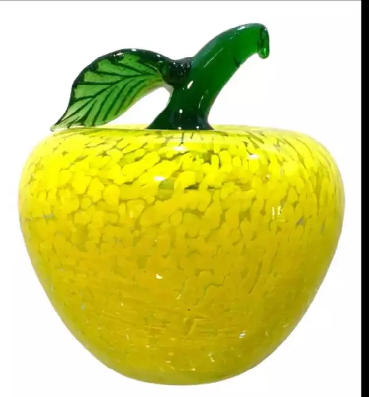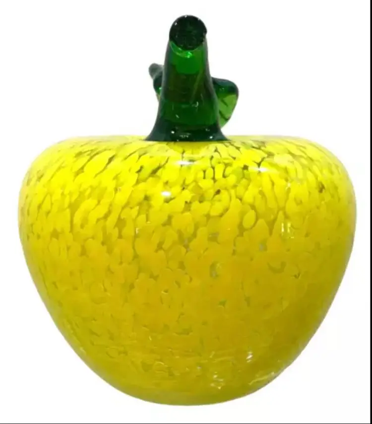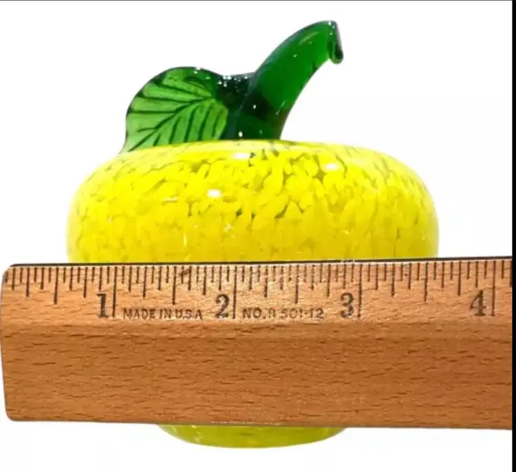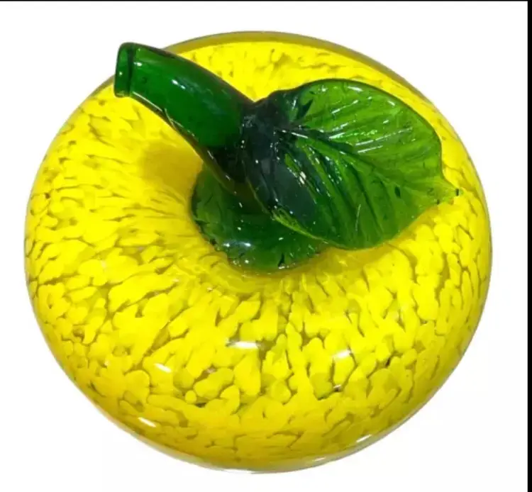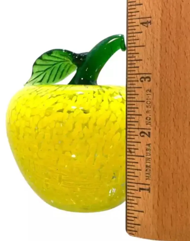 This stunning art glass paperweight features a beautifully modeled apple design with a yellow hand blown glass body and a green stem. The glossy finish adds to its elegance, making it a perfect addition to any collection. This vintage original piece has been handmade using the hand blown glassmaking technique, making it a unique and one-of-a-kind item.