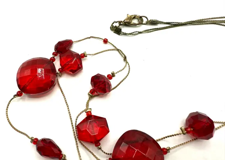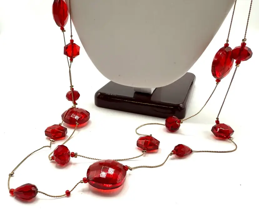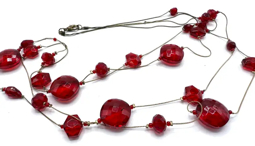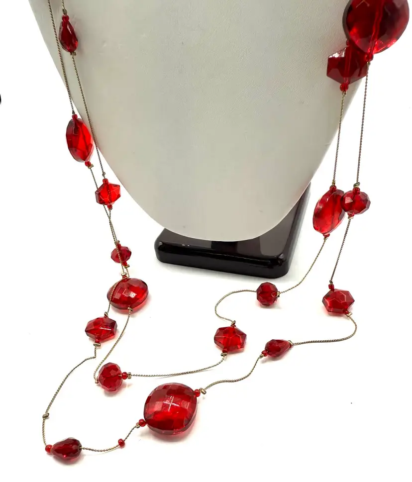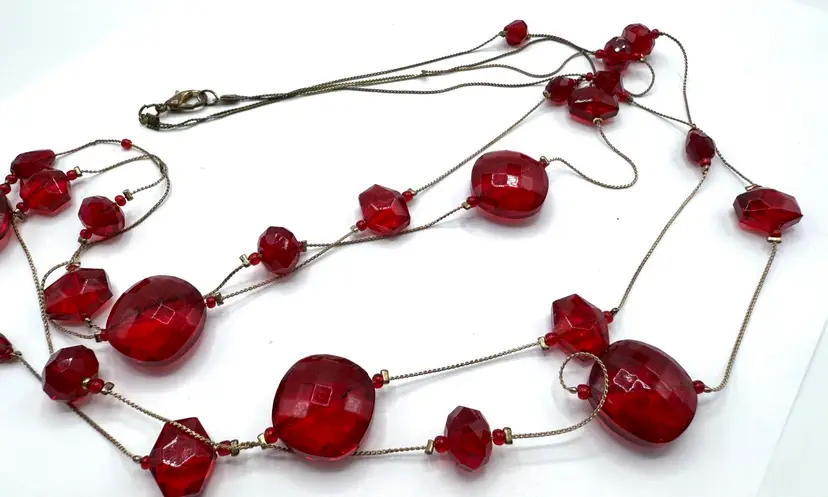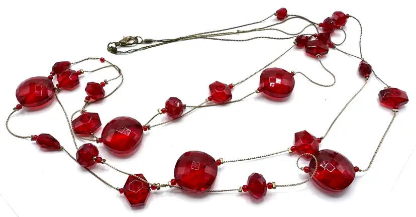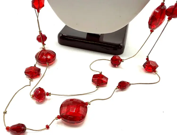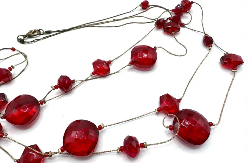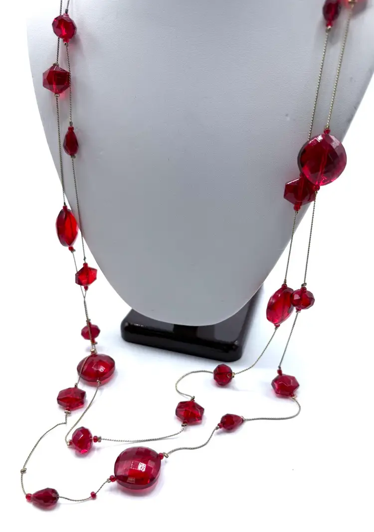 Amazing red faceted glass 2 strand floating bead necklace on gold tone chain. In 20 inches of lovely holiday glass which drapes the neck in glory. These unique and decorative faceted beads simply shimmers with beauty. Just in time for your Holiday wear. Total 40 inches with 20 inch drop. Condition - vintage very good -