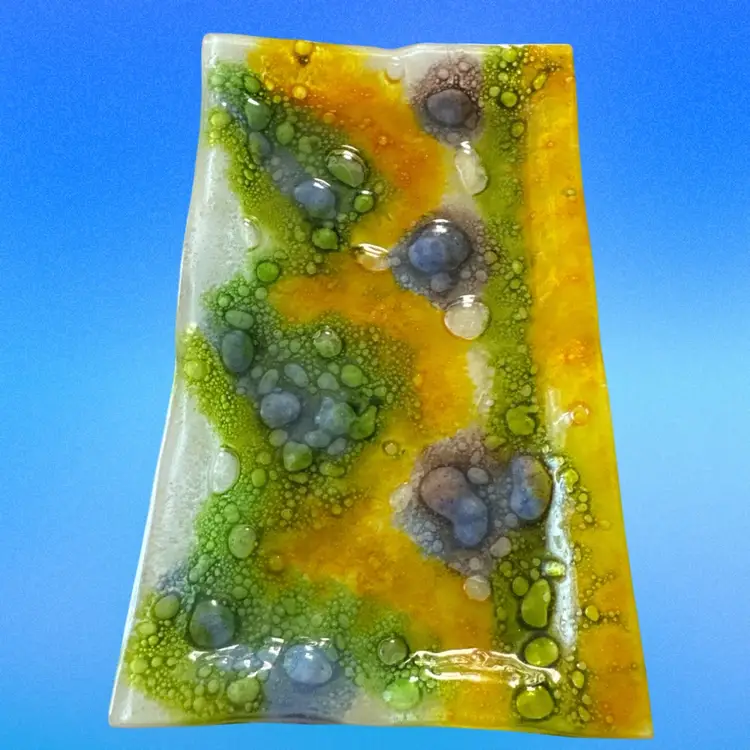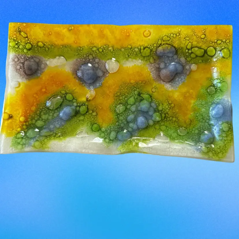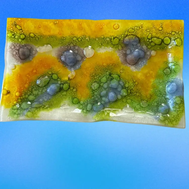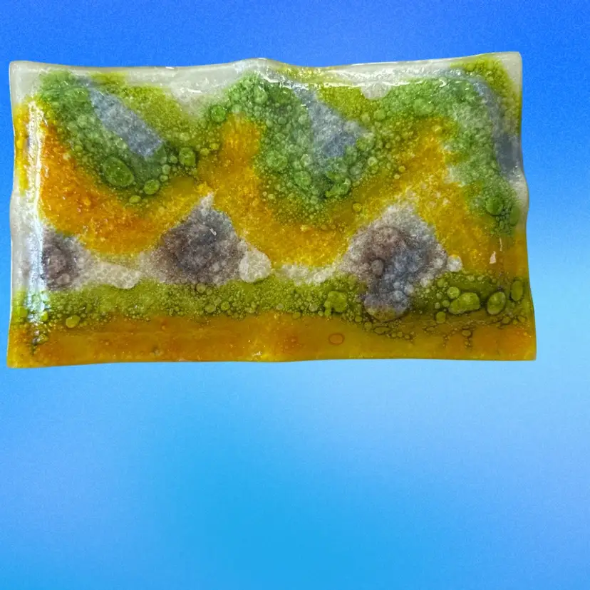 This trinket tray is a beautifully crafted piece of art glass made with a fused glassmaking technique, resulting in a unique bubbly texture. The multicolor design adds a fun and vibrant touch to any room decor. Measuring 7 1/2" in length and 4 1/2" in width, this handmade tray is perfect for storing small trinkets or jewelry. Excellent condition. No chips, cracks or scratches.
