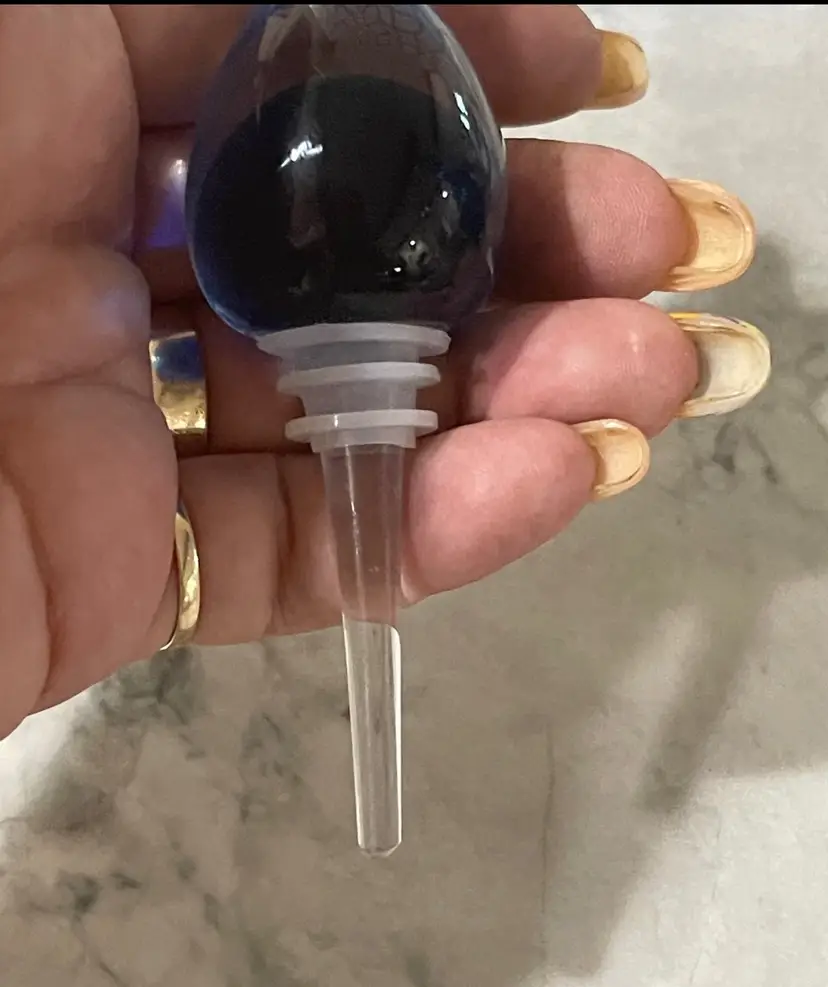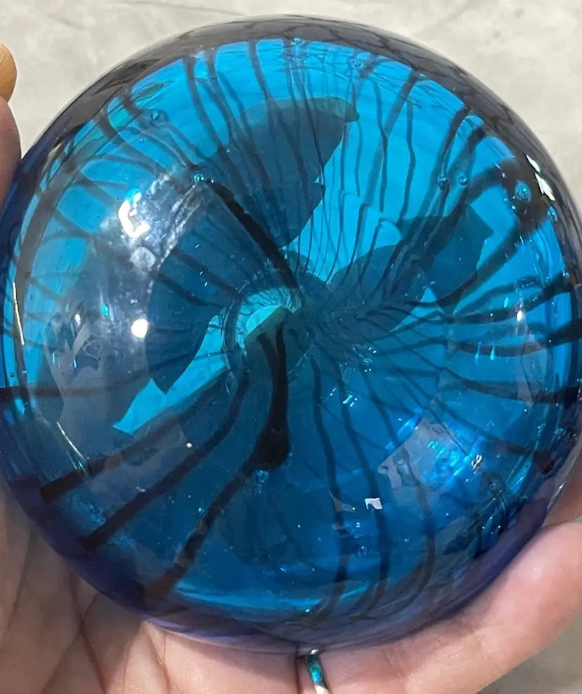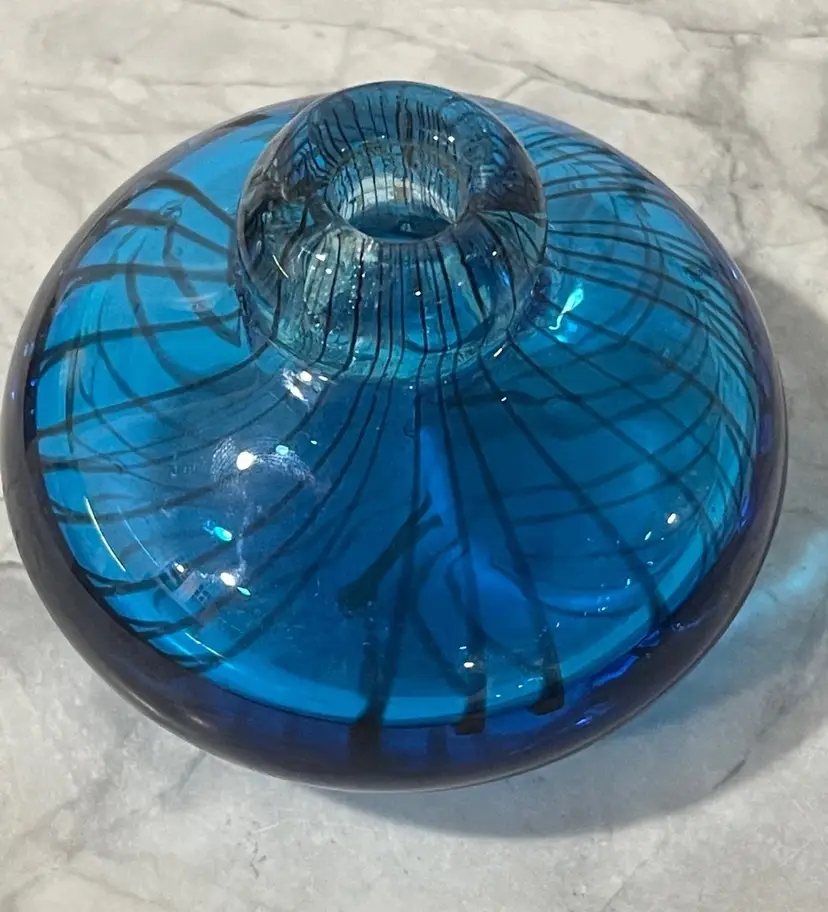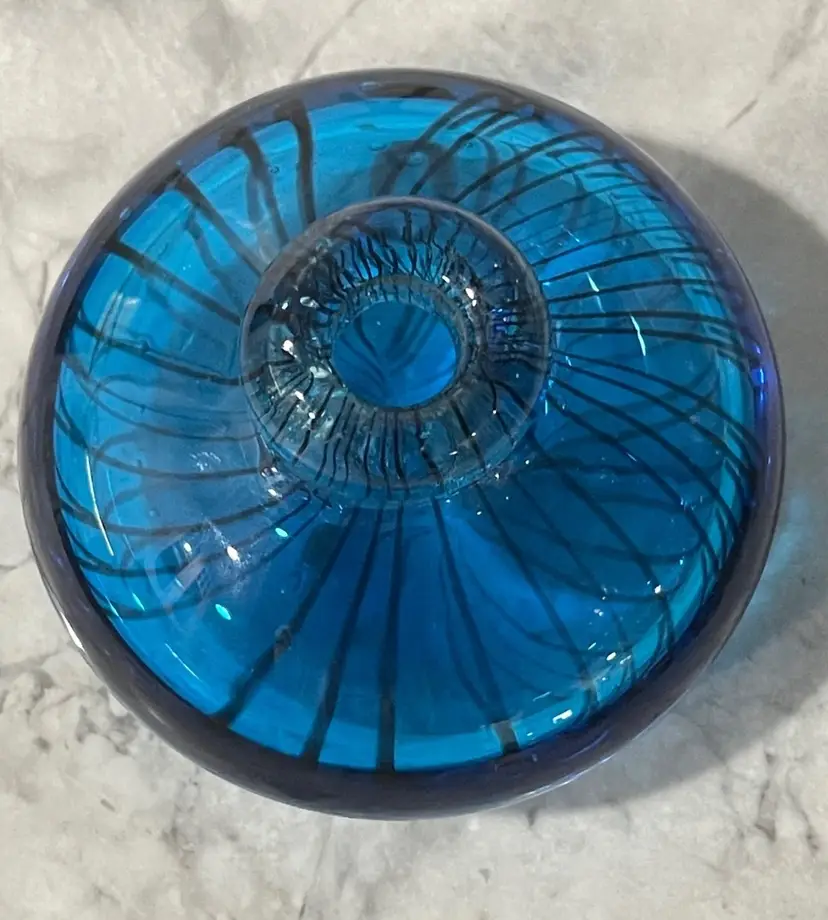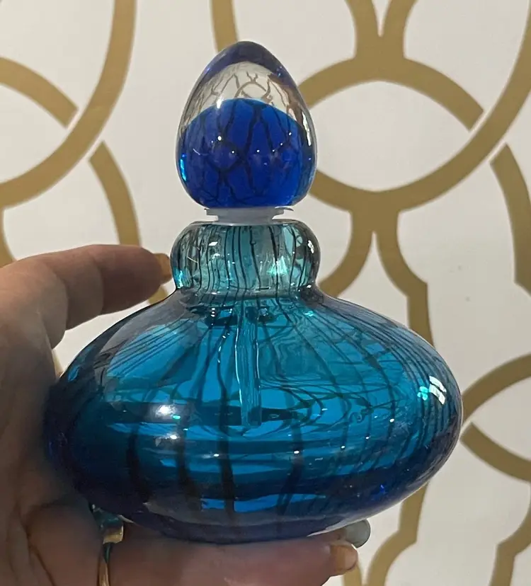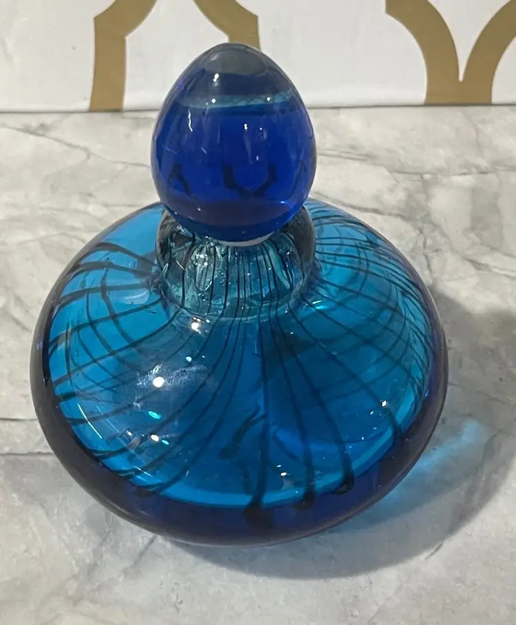 The base of the bottle has a wide flattened shape with a wonderful black stripped design. The dauber has a deep royal blue glass top with a tight soft rubber seal. The perfume bottle measures approximately 4” inches in diameter and is 4” inches tall. This is a gorgeous collectible perfume battle that would look fabulous on a lady’s vanity.