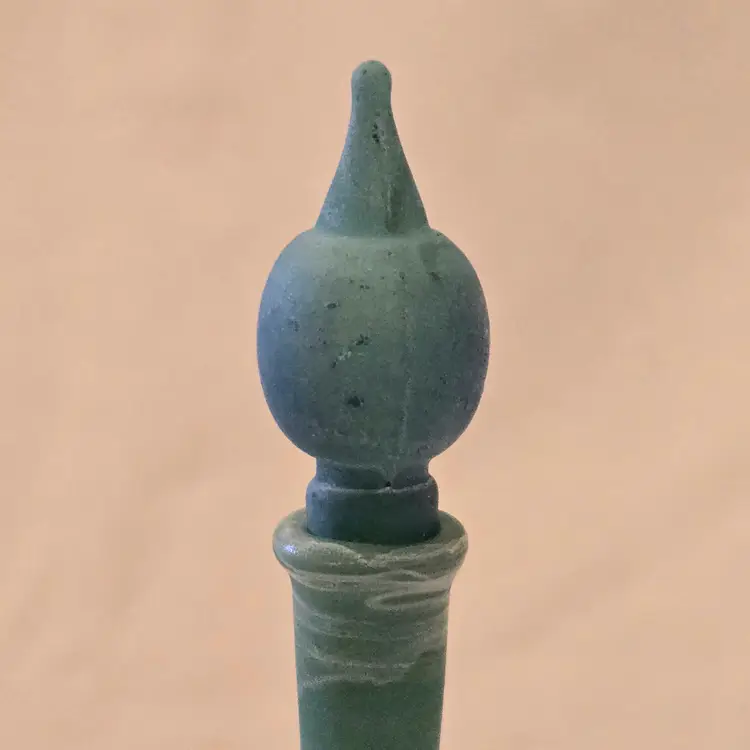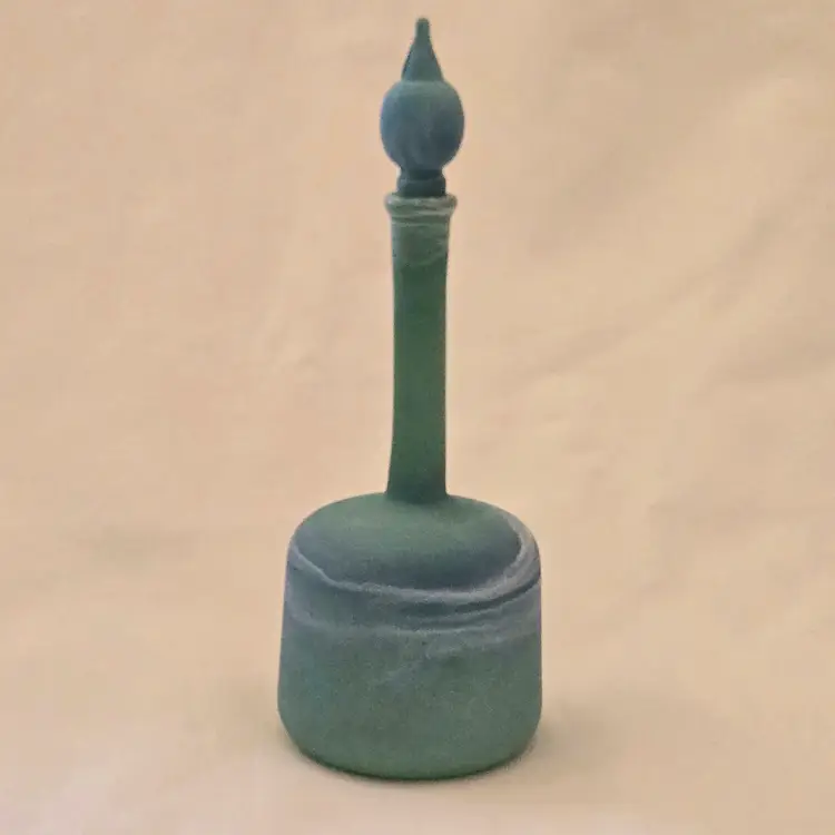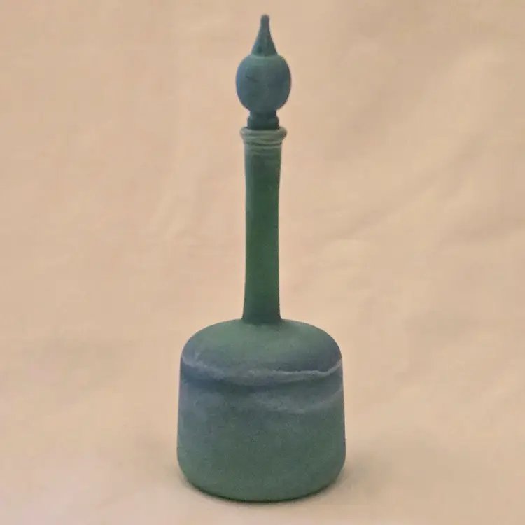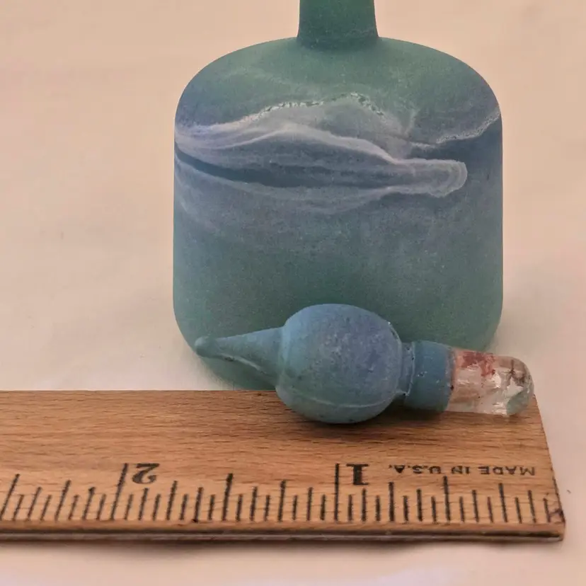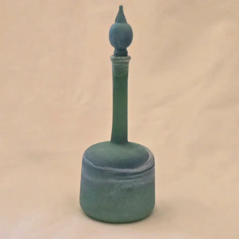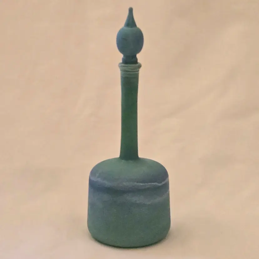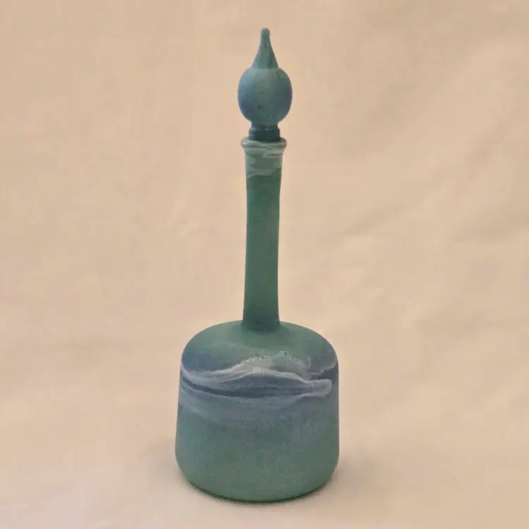Art Glass Bottle Lidded Handmade Turquoise w/ Decorative Swirl 5" Tall Unbranded. Used condition with blue painted color thinning and missing spots of color, inside stopper seems to be rough, long stem appears to be a bit crooked. Please view all the photos and please ask any questions prior to purchase when possible.