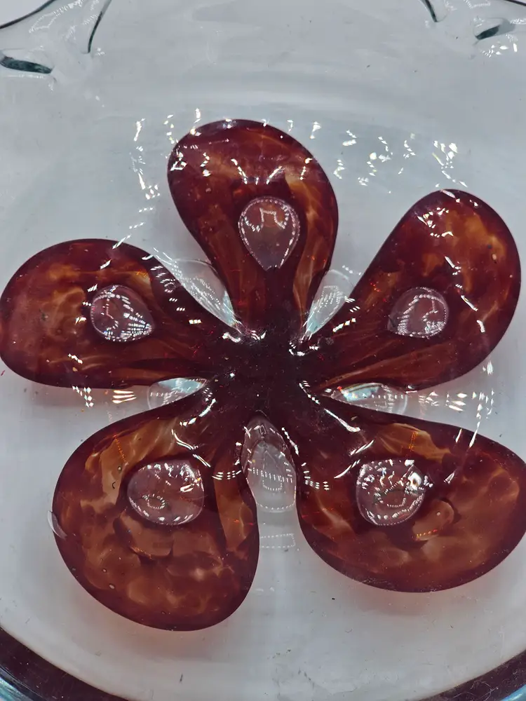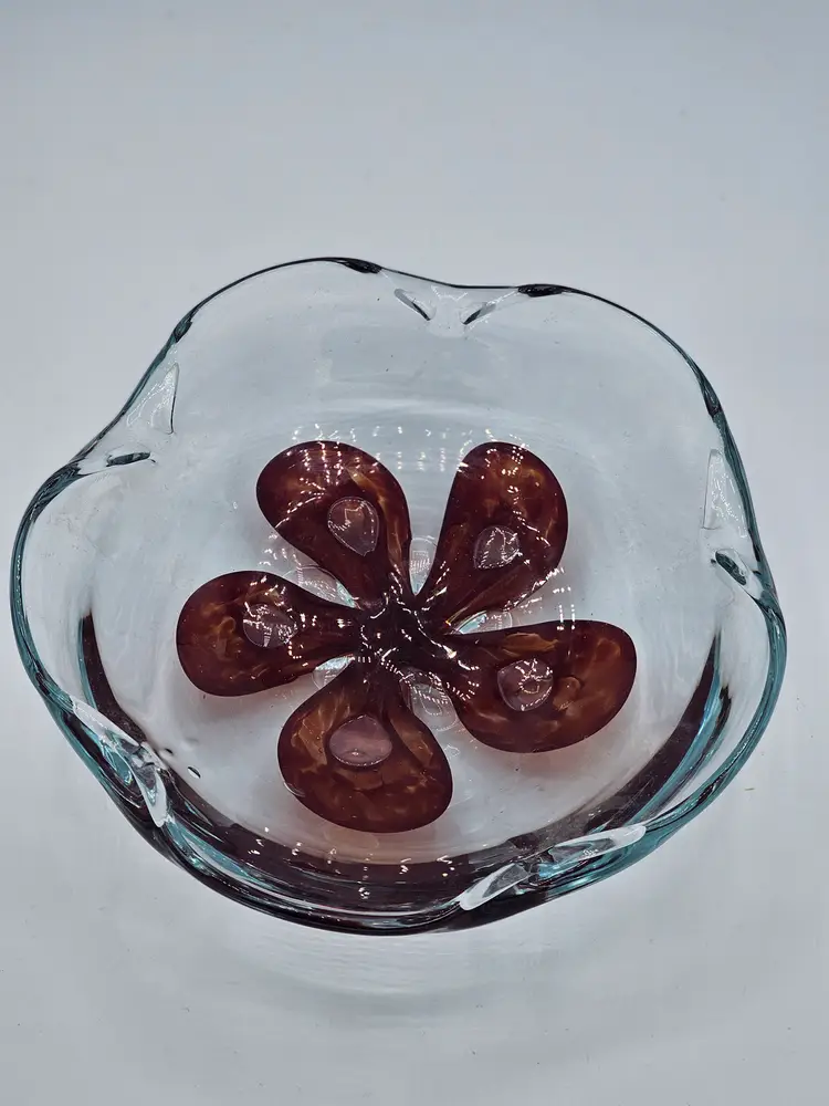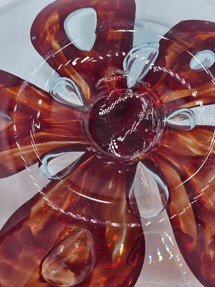 Beautiful art glass dish. 8 inches in diameter. Murano? Feels like it but I'm not an expert on Italian glass by any means The bottom has a very rough pontil scar Some surface scratches on the bottom, no other wear or damage