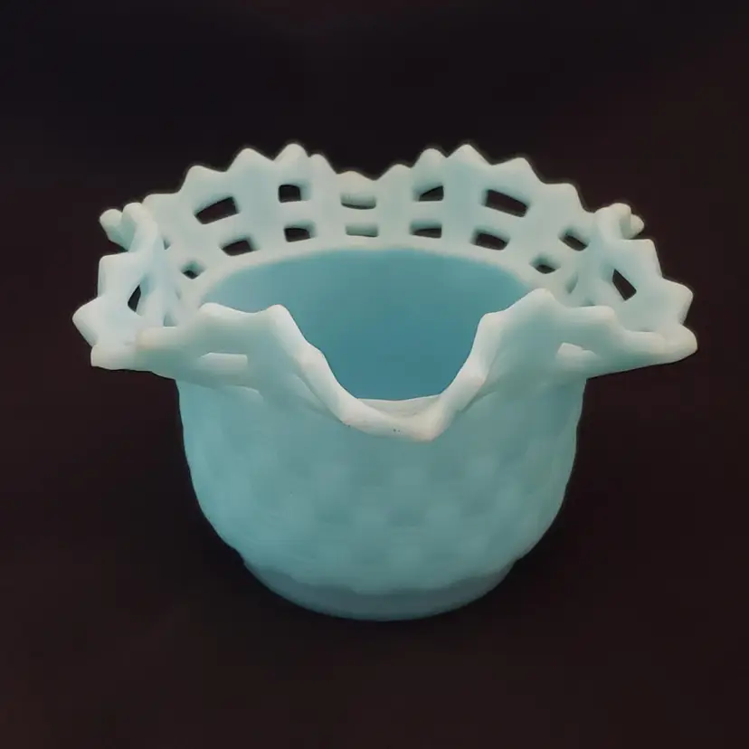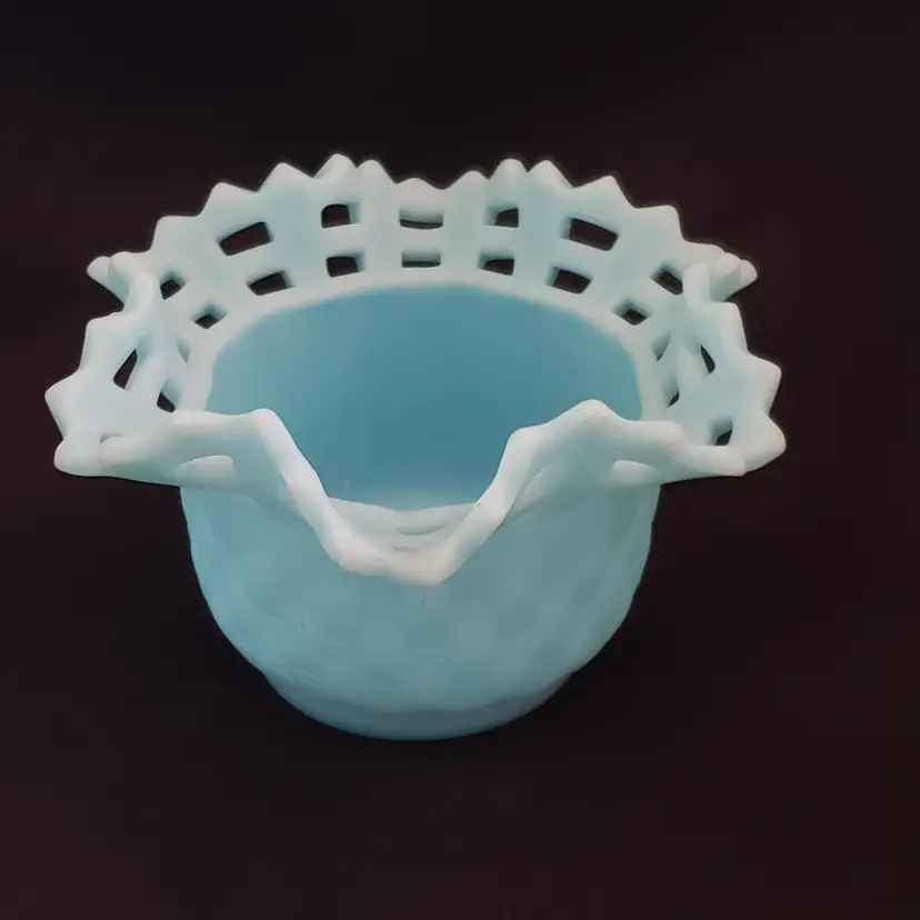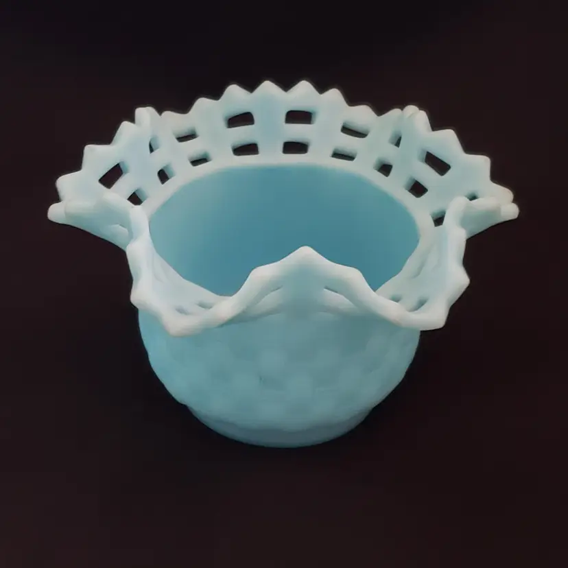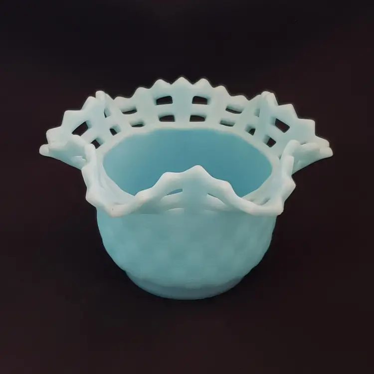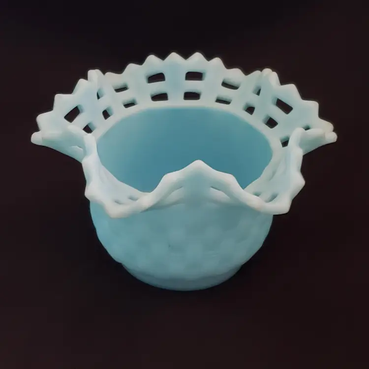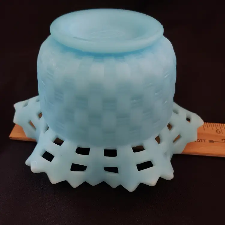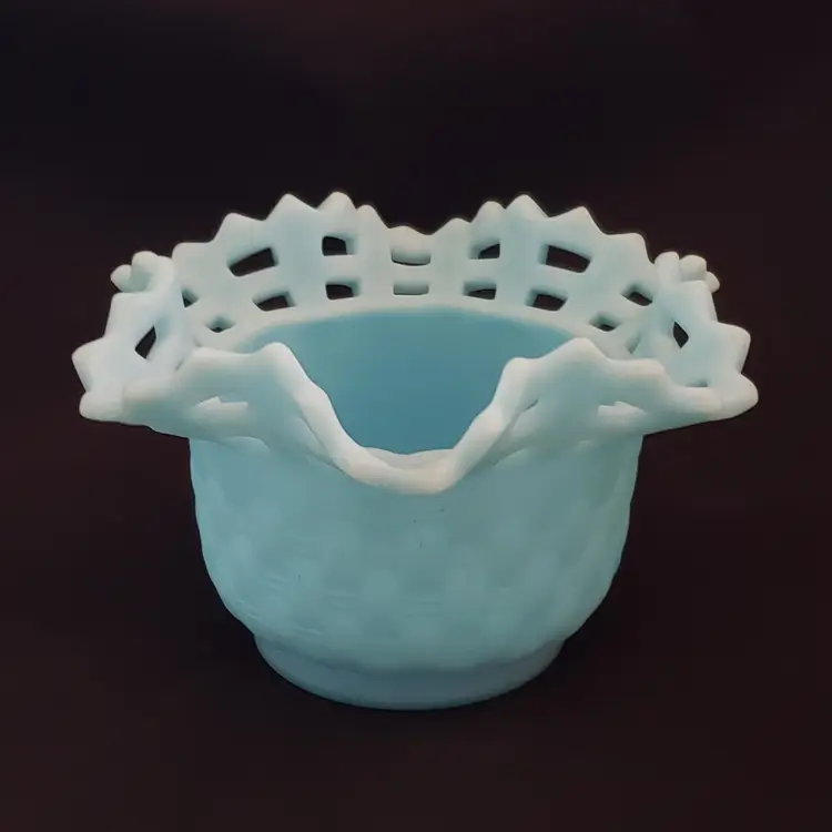 Art Glass Bowl Vase Blue Satin Basket Weave Rose Fenton Signed 3¼" Tall 5¼" Diameter. Used condition with some color/stains along edges, dirt, etc. Please view all the photos and please read the entire item description and please ask any questions prior to purchase when possible.