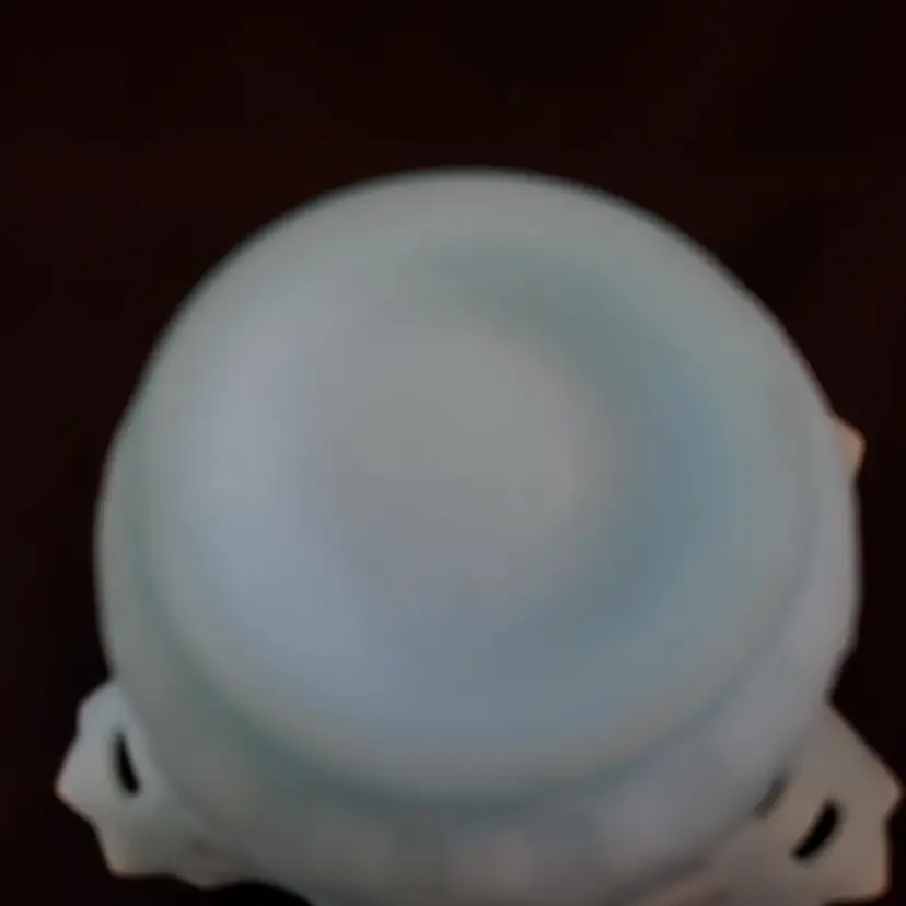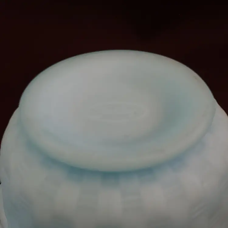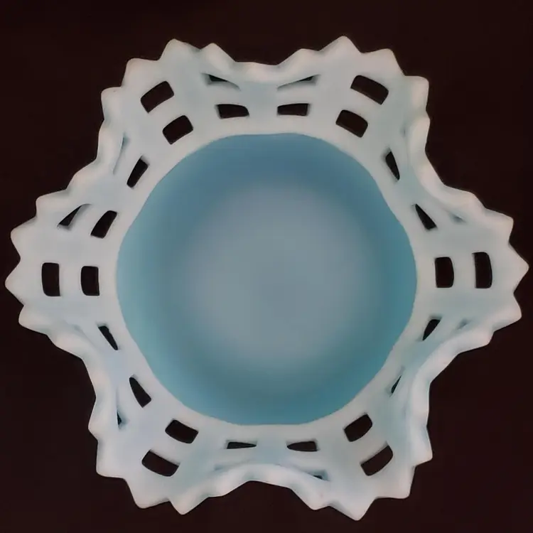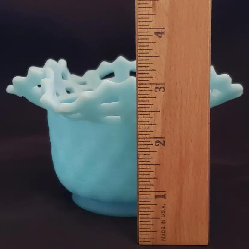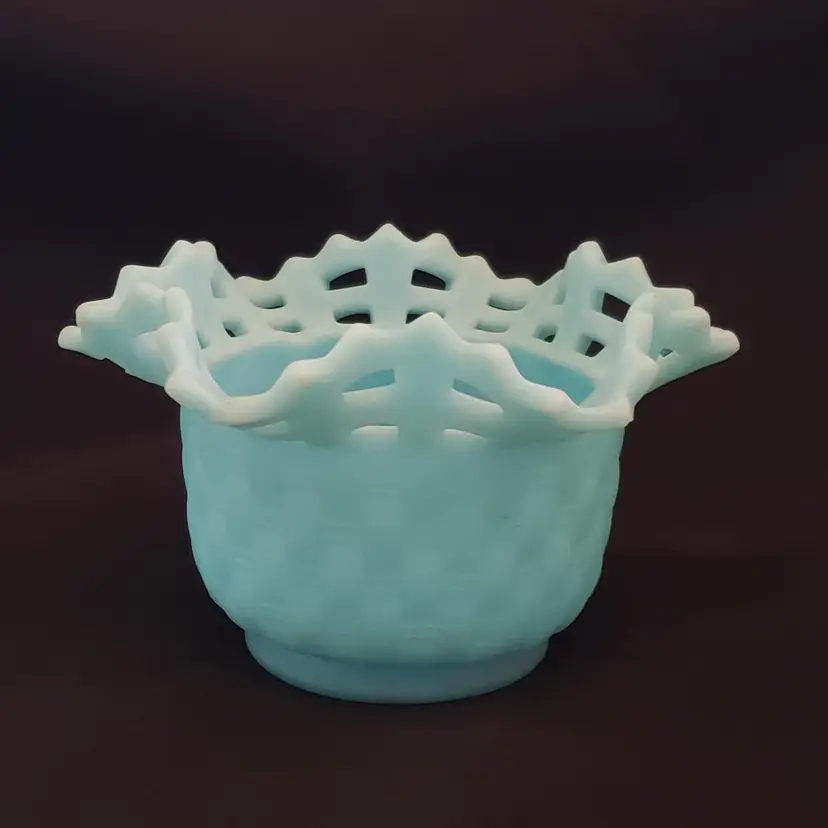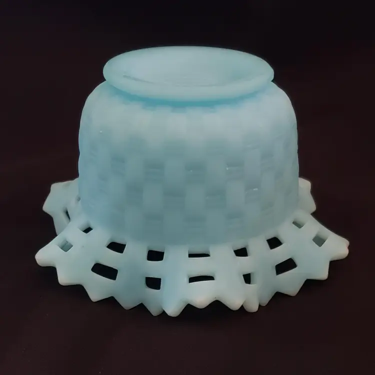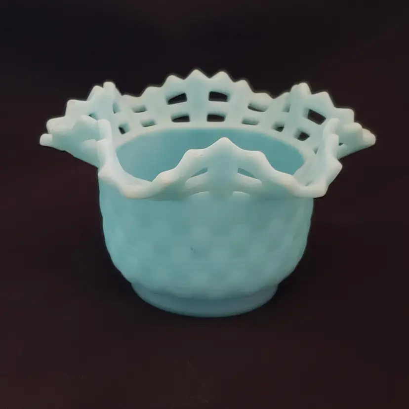Art Glass Bowl Vase Blue Satin Basket Weave Rose Fenton Signed 3¼" Tall 5¼" Diameter. Used condition with some color/stains along edges, dirt, etc. Please view all the photos and please read the entire item description and please ask any questions prior to purchase when possible.