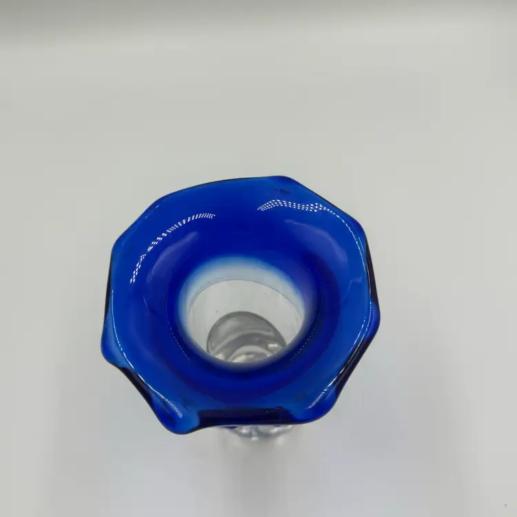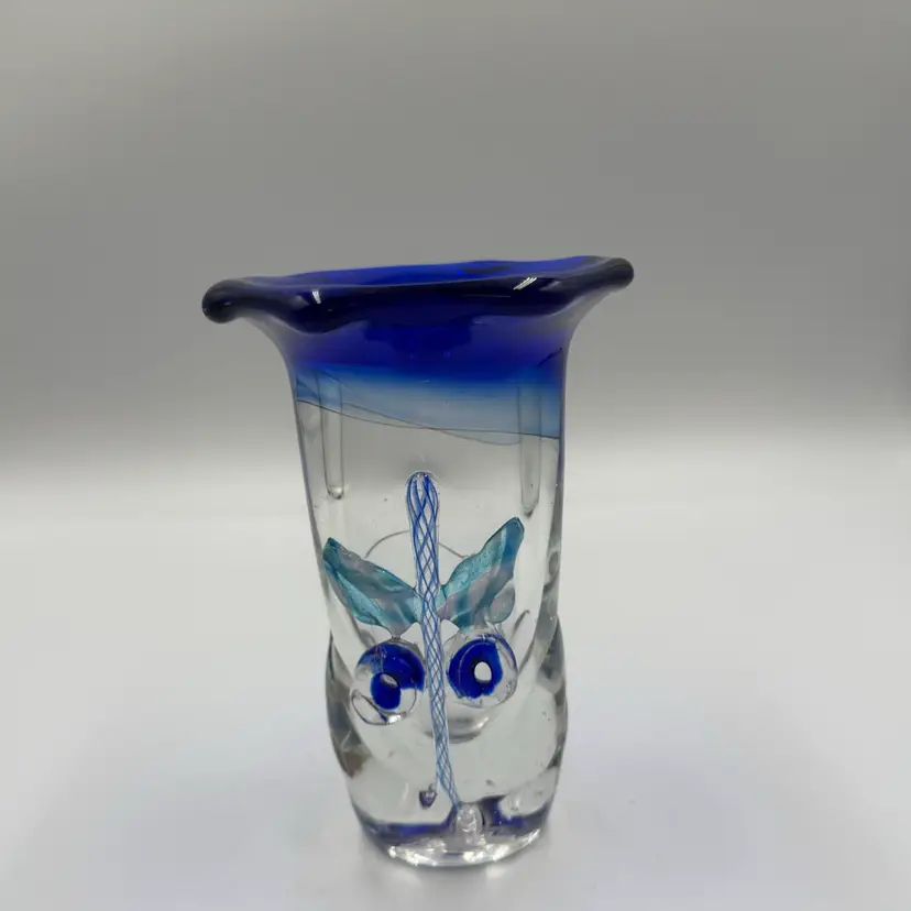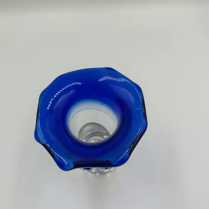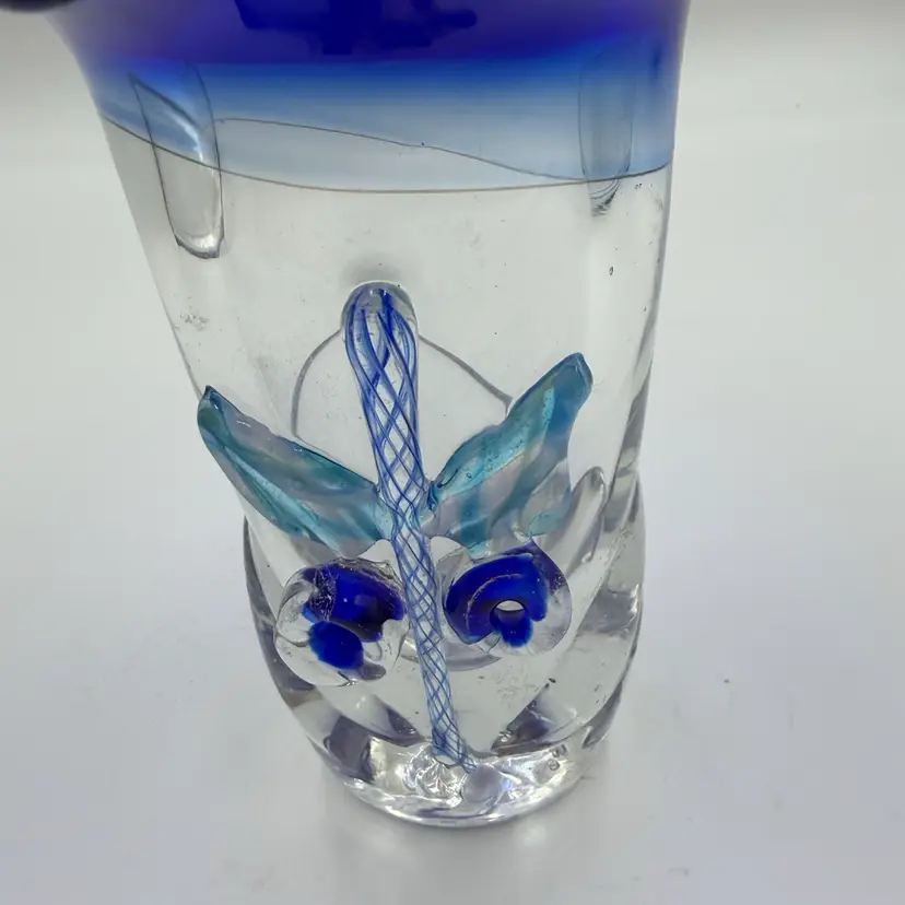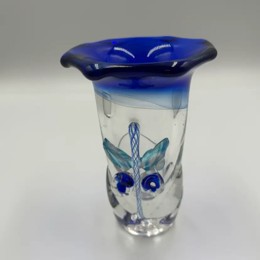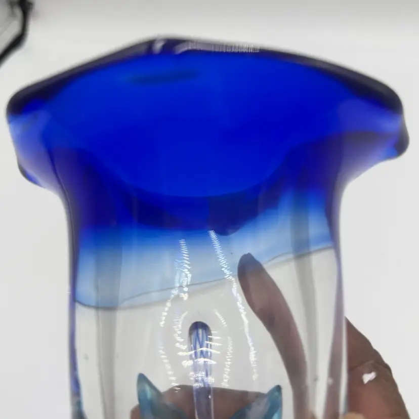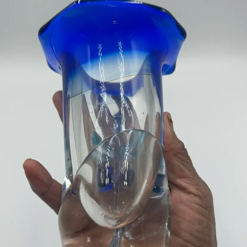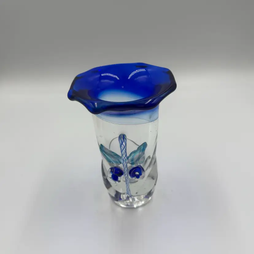This is a hand blown art glass with a clear finished and applied floral design Cobalt blue ruffled top .The vase is approximately 7.5 inches tall and has a bottled shape. It is medium - sized table vase that would be suitable for adults and is an original signed piece. No chips or cracks