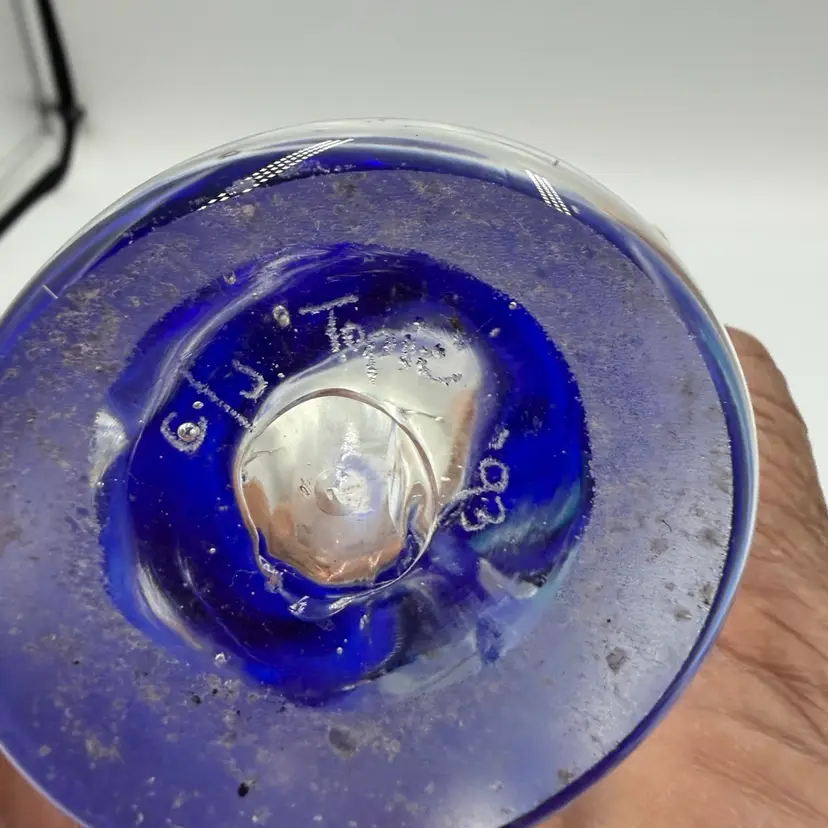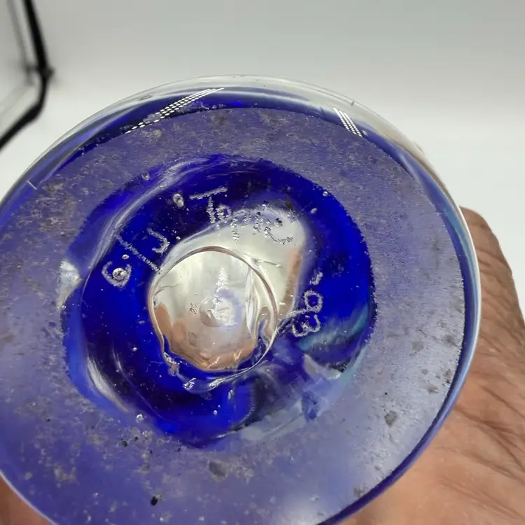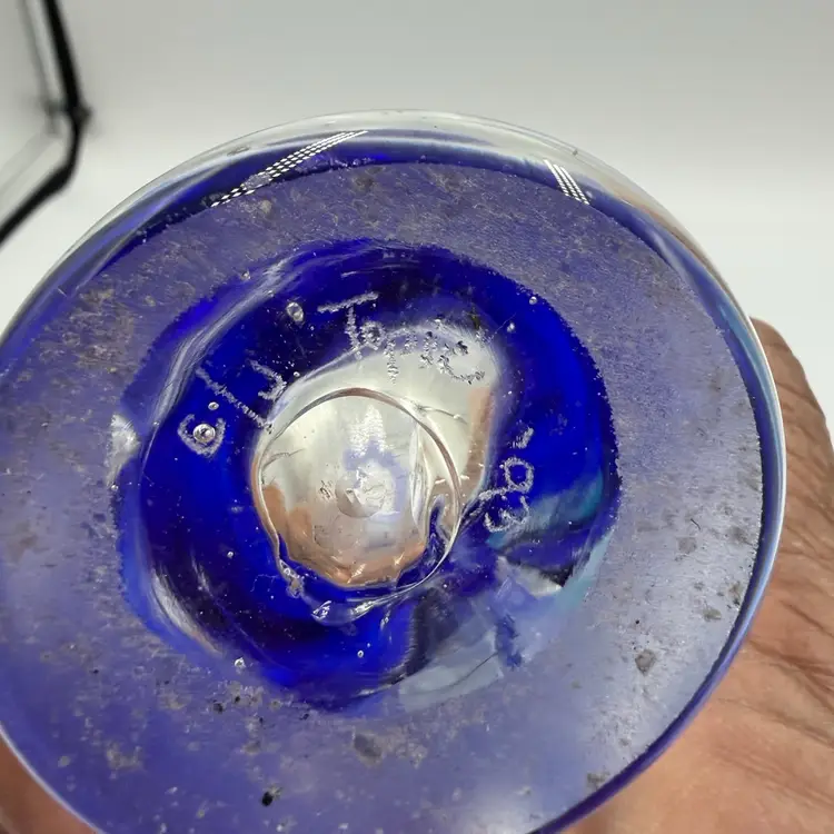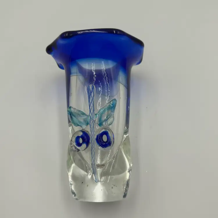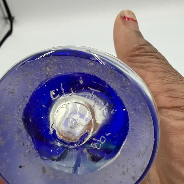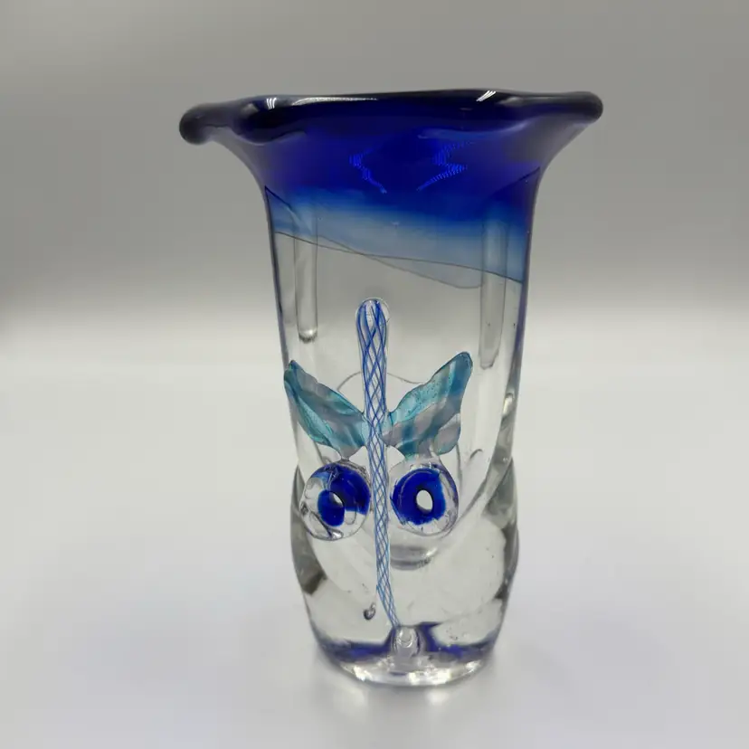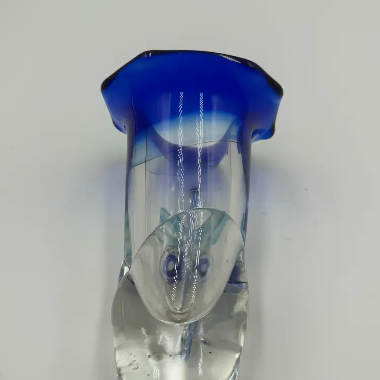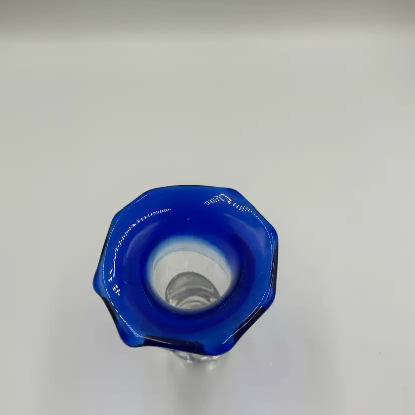 This is a hand blown art glass with a clear finished and applied floral design Cobalt blue ruffled top .The vase is approximately 7.5 inches tall and has a bottled shape. It is medium - sized table vase that would be suitable for adults and is an original signed piece. No chips or cracks