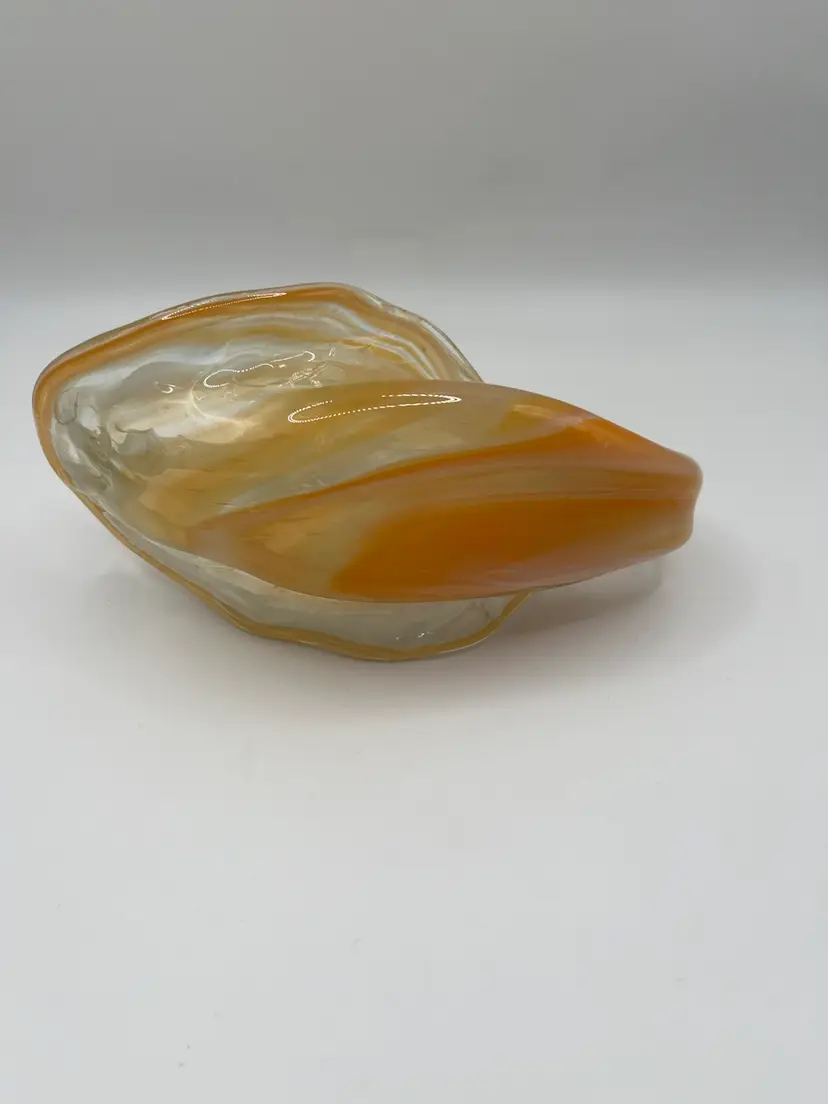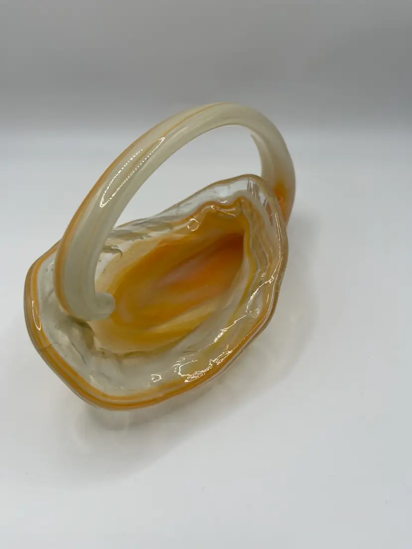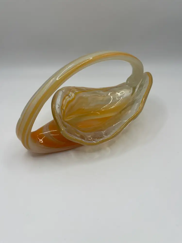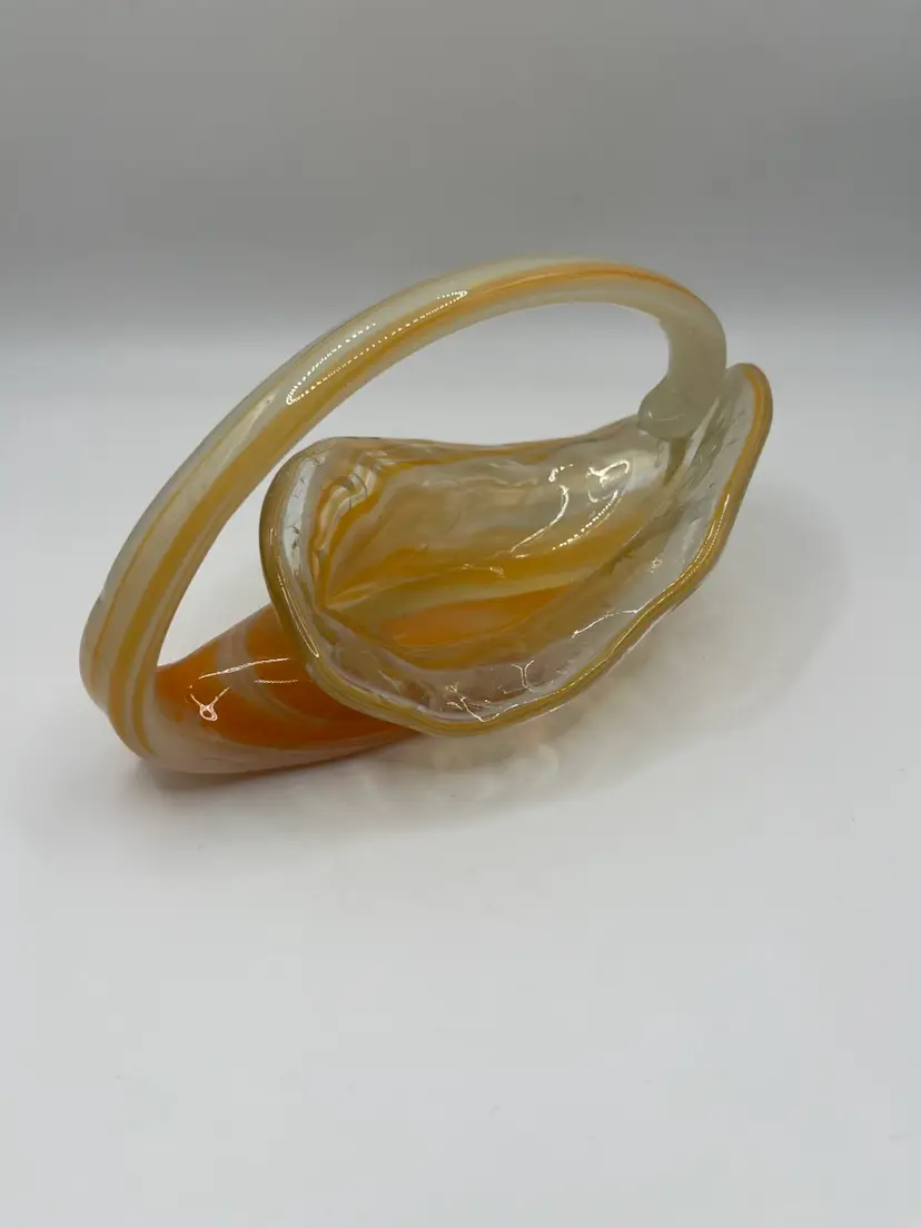 Hand Blown Pulled Art Glass Cornucopia Basket Bowl Handle Orange Swirls. Perfect for fall/autumn!! No chips or cracks Measures 4x7”