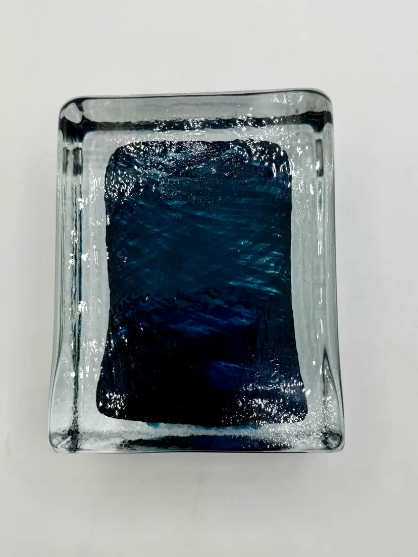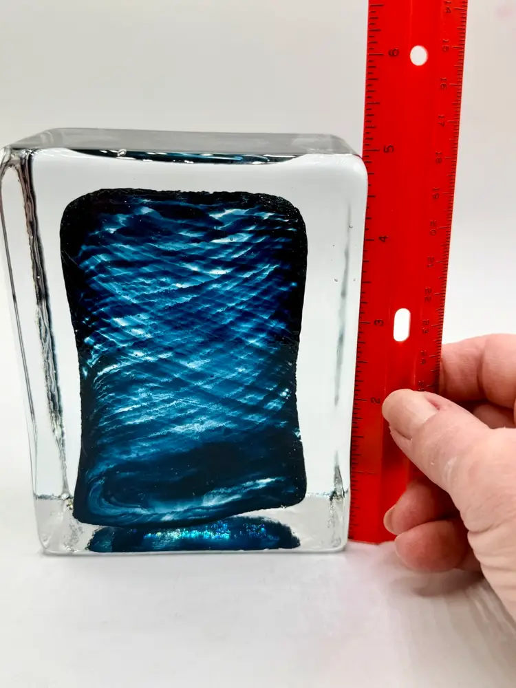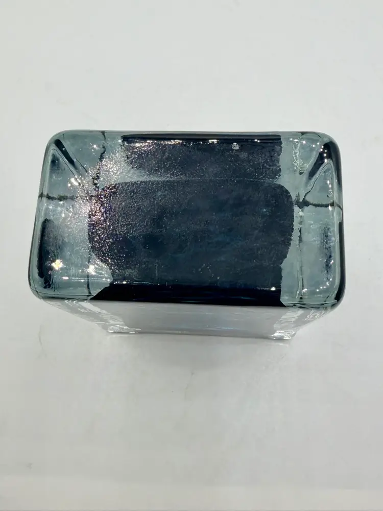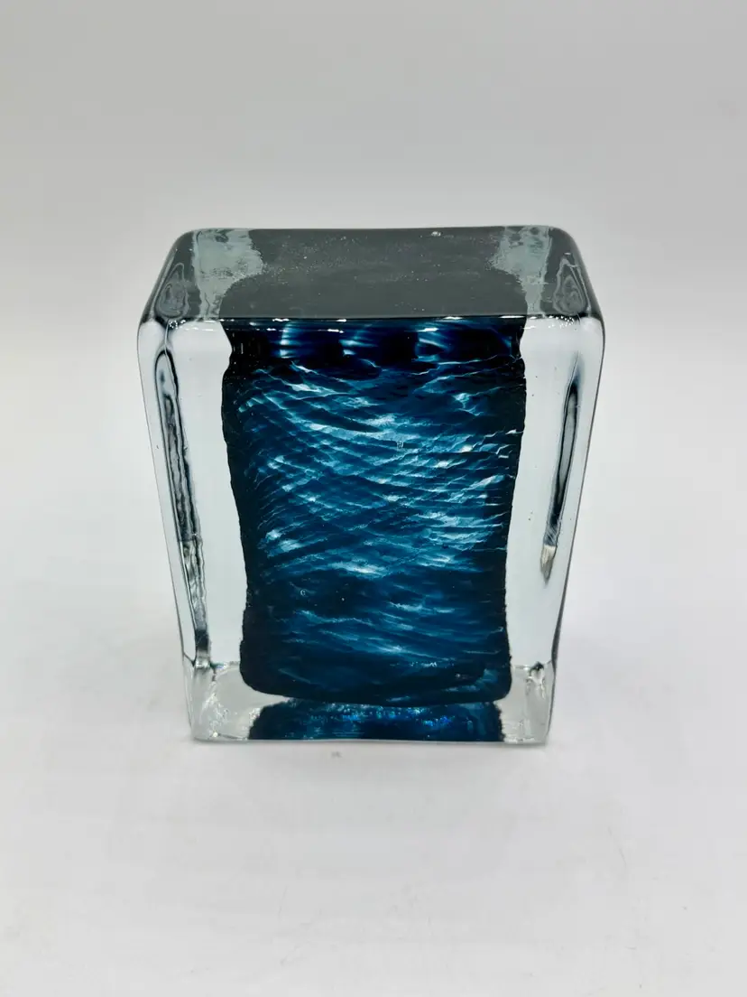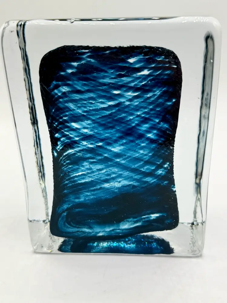 This product is a hand-blown art glass cube paperweight, featuring a teal blue swirl pattern and clear accents. The original and handmade nature of the piece adds to its unique charm, making it a striking decorative item for any space. The combination of artisanal craftsmanship and vibrant colors make this glass cube paperweight a standout piece for collectors or those looking to add a touch of artistic flair to their home.
