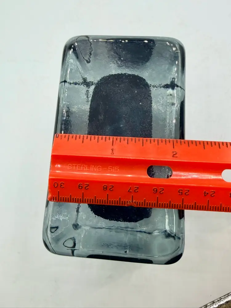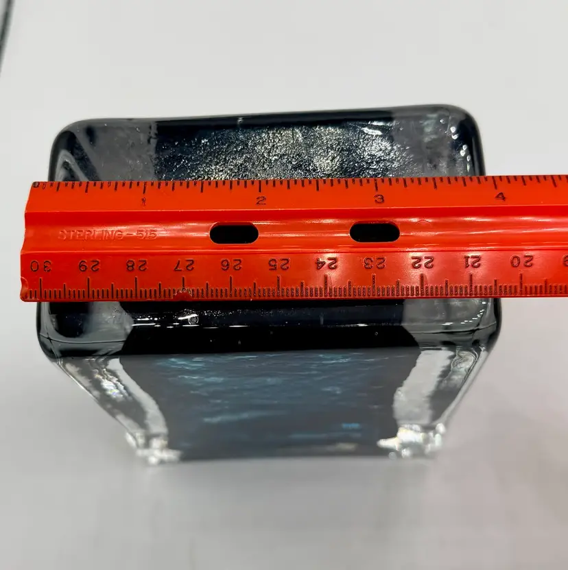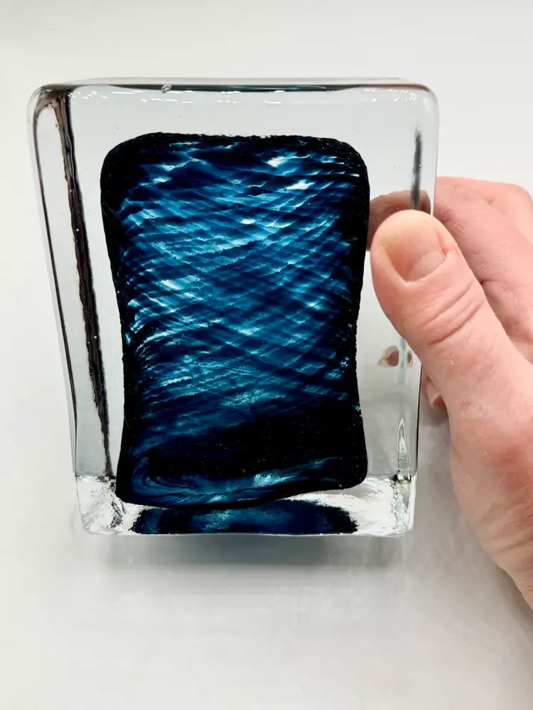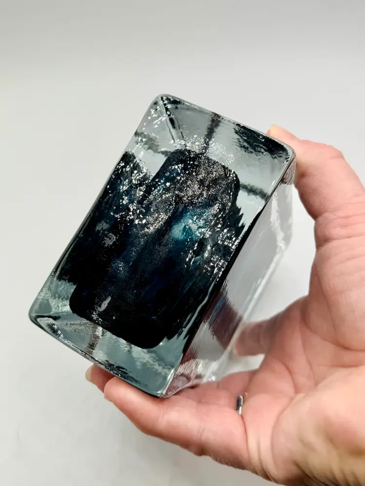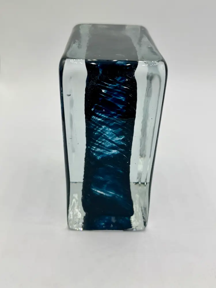 This product is a hand-blown art glass cube paperweight, featuring a teal blue swirl pattern and clear accents. The original and handmade nature of the piece adds to its unique charm, making it a striking decorative item for any space. The combination of artisanal craftsmanship and vibrant colors make this glass cube paperweight a standout piece for collectors or those looking to add a touch of artistic flair to their home.