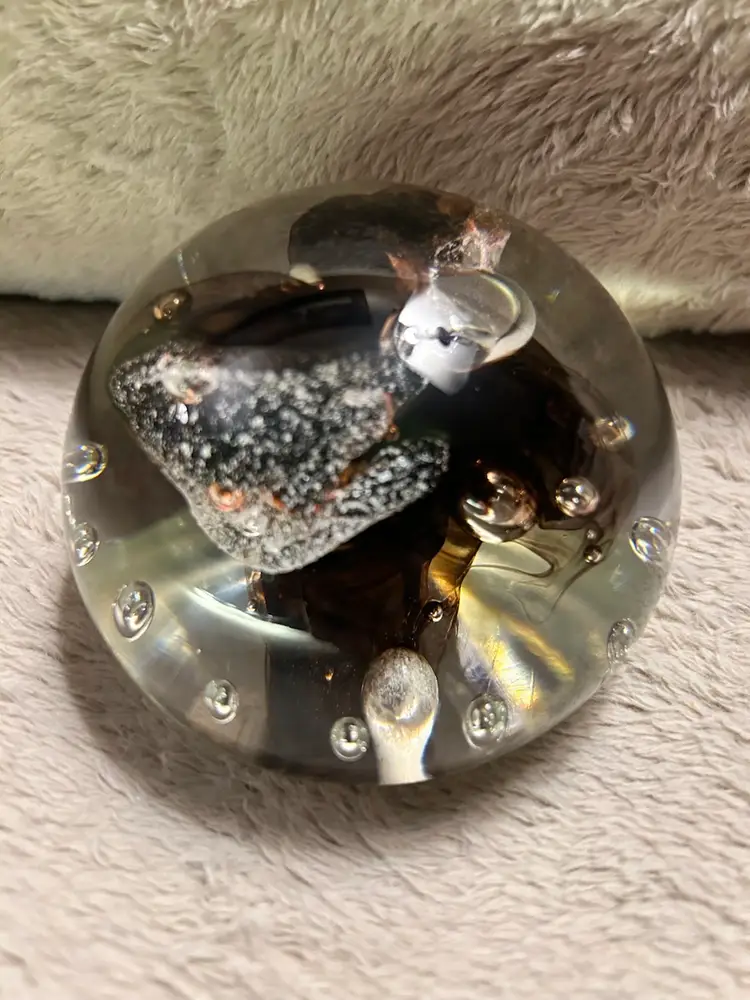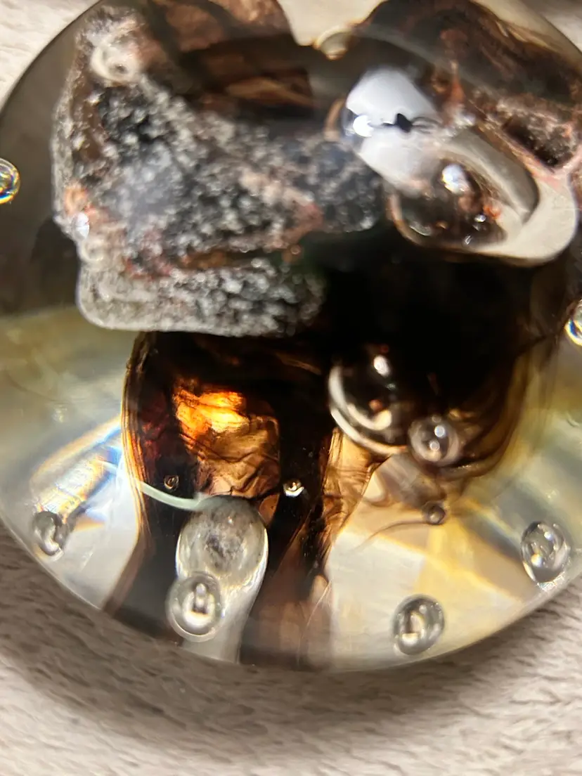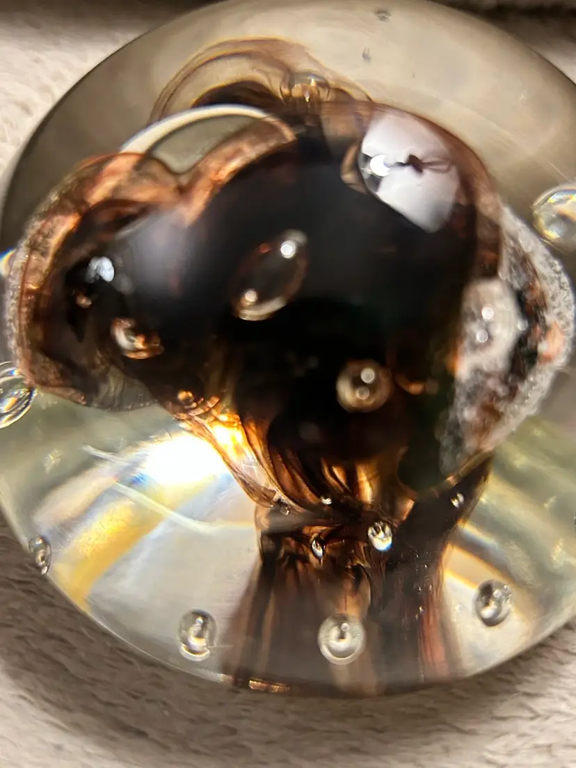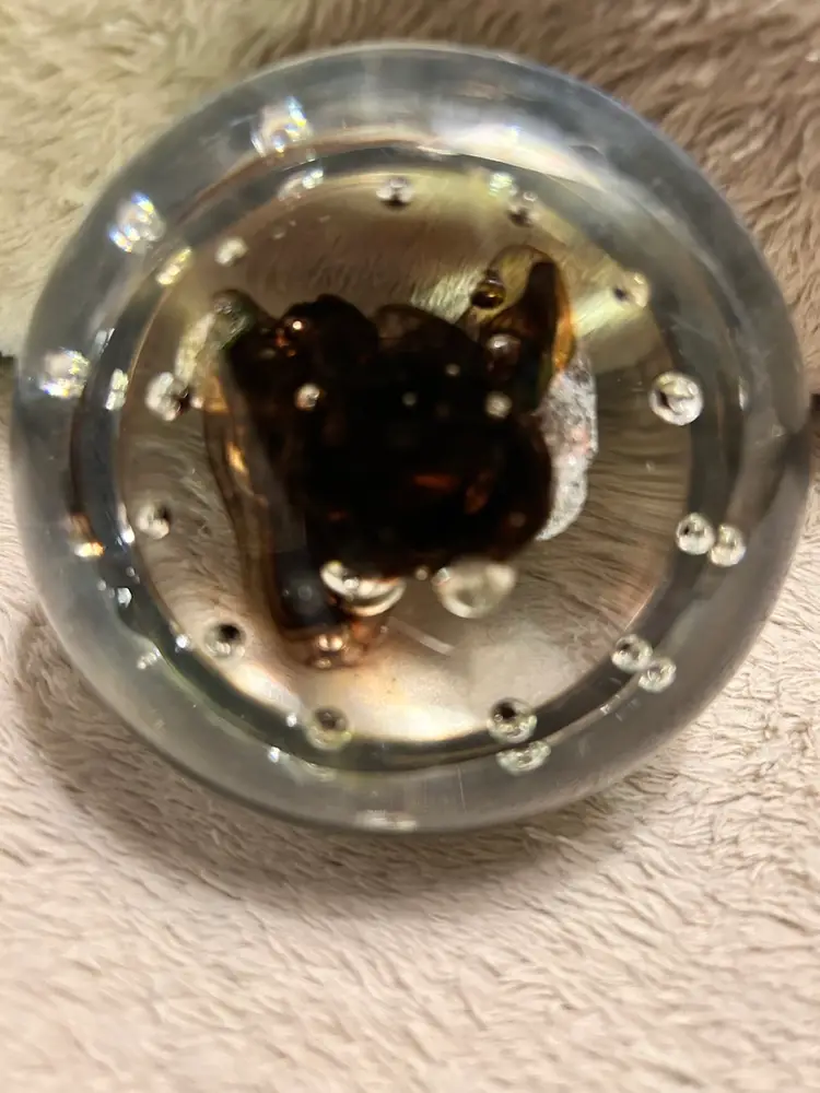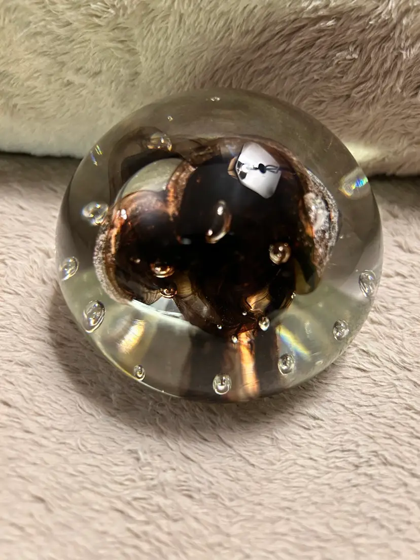Very unique deep plum/brown features in this paperweight. 3”x 3.5”