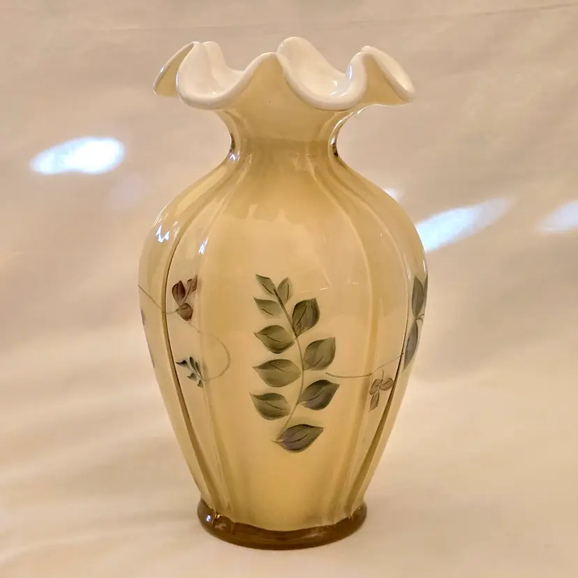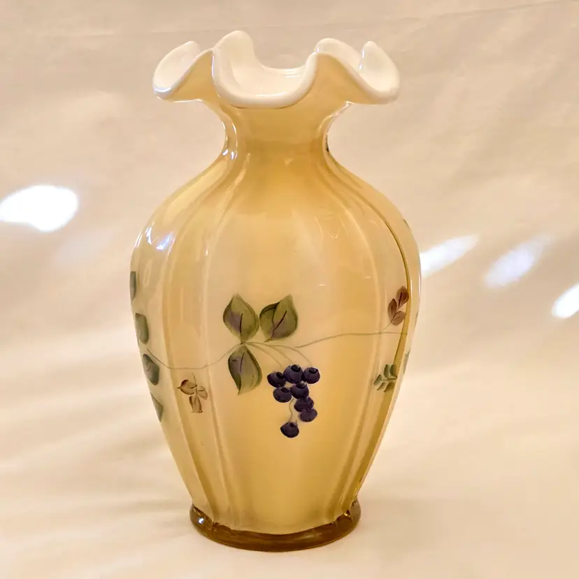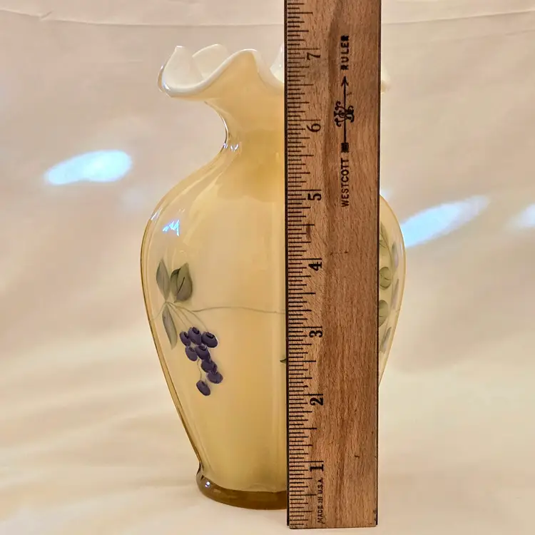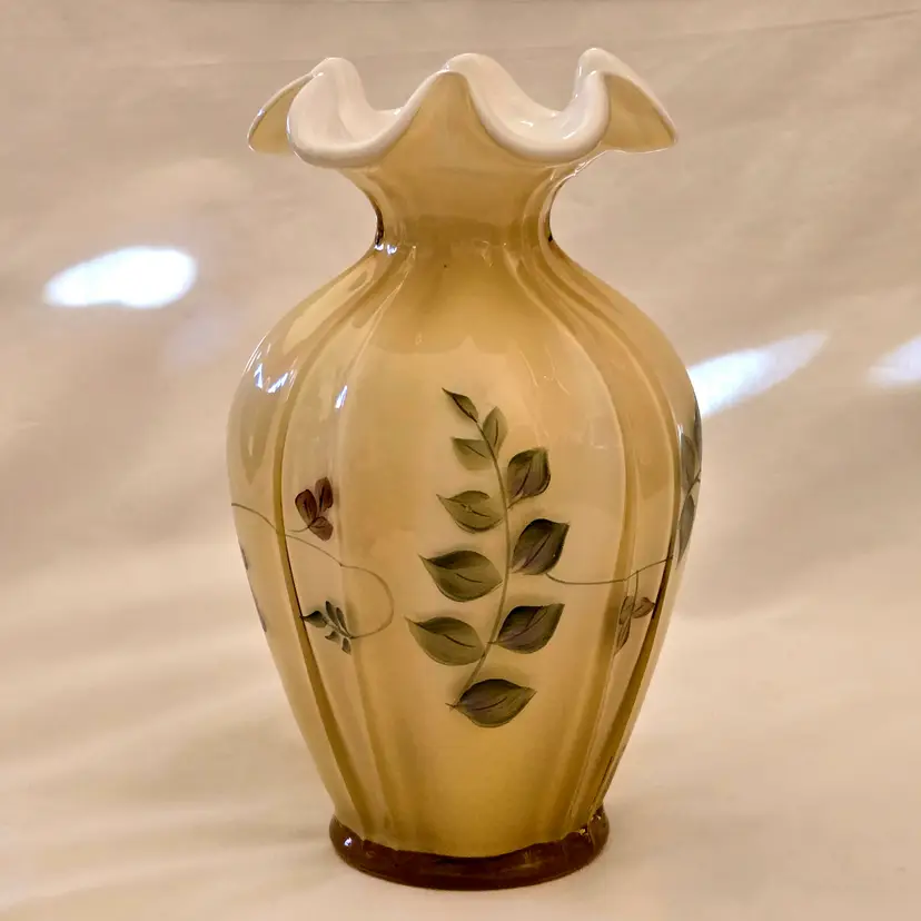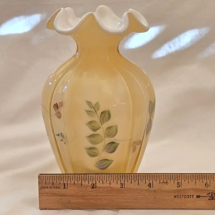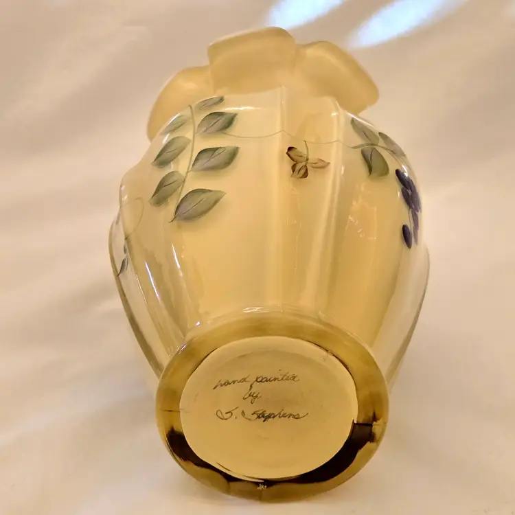 Art Glass Fenton Fluted Vase Honey Glass Cased Handpaint Signed S. Stephens 7” tall Vintage. Used condition with dust and dirt, stains. Please view all the photos and please ask any questions prior to purchase when possible.